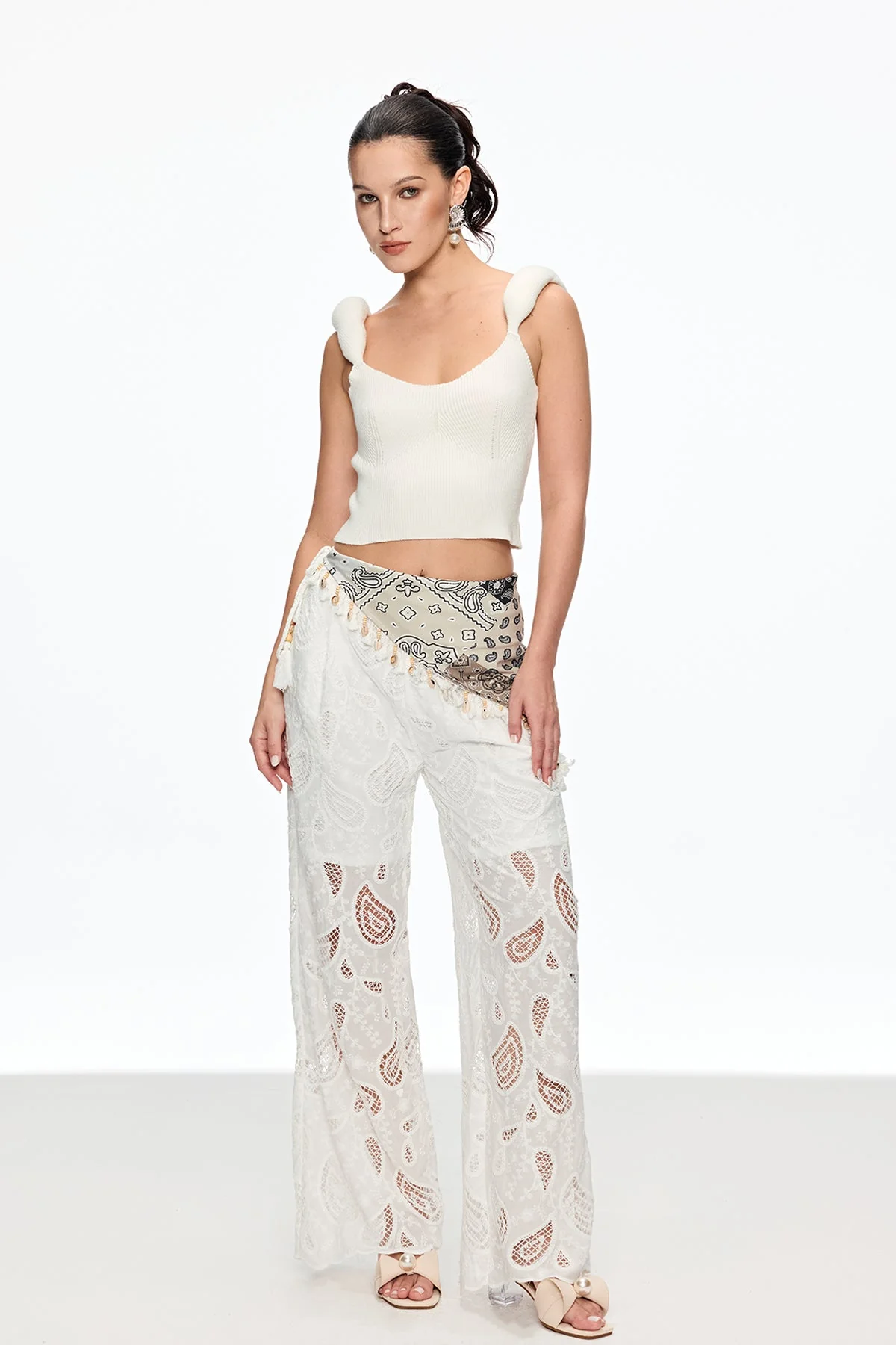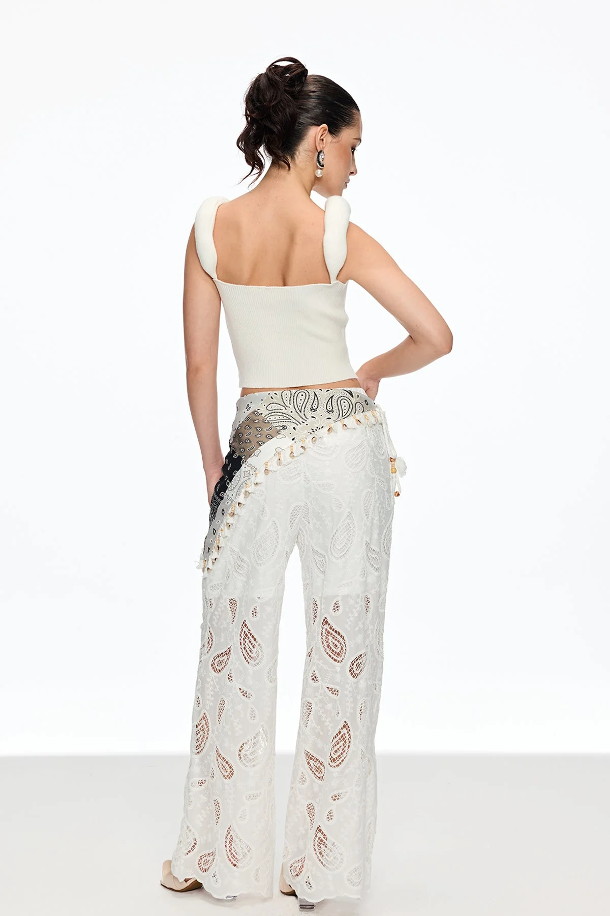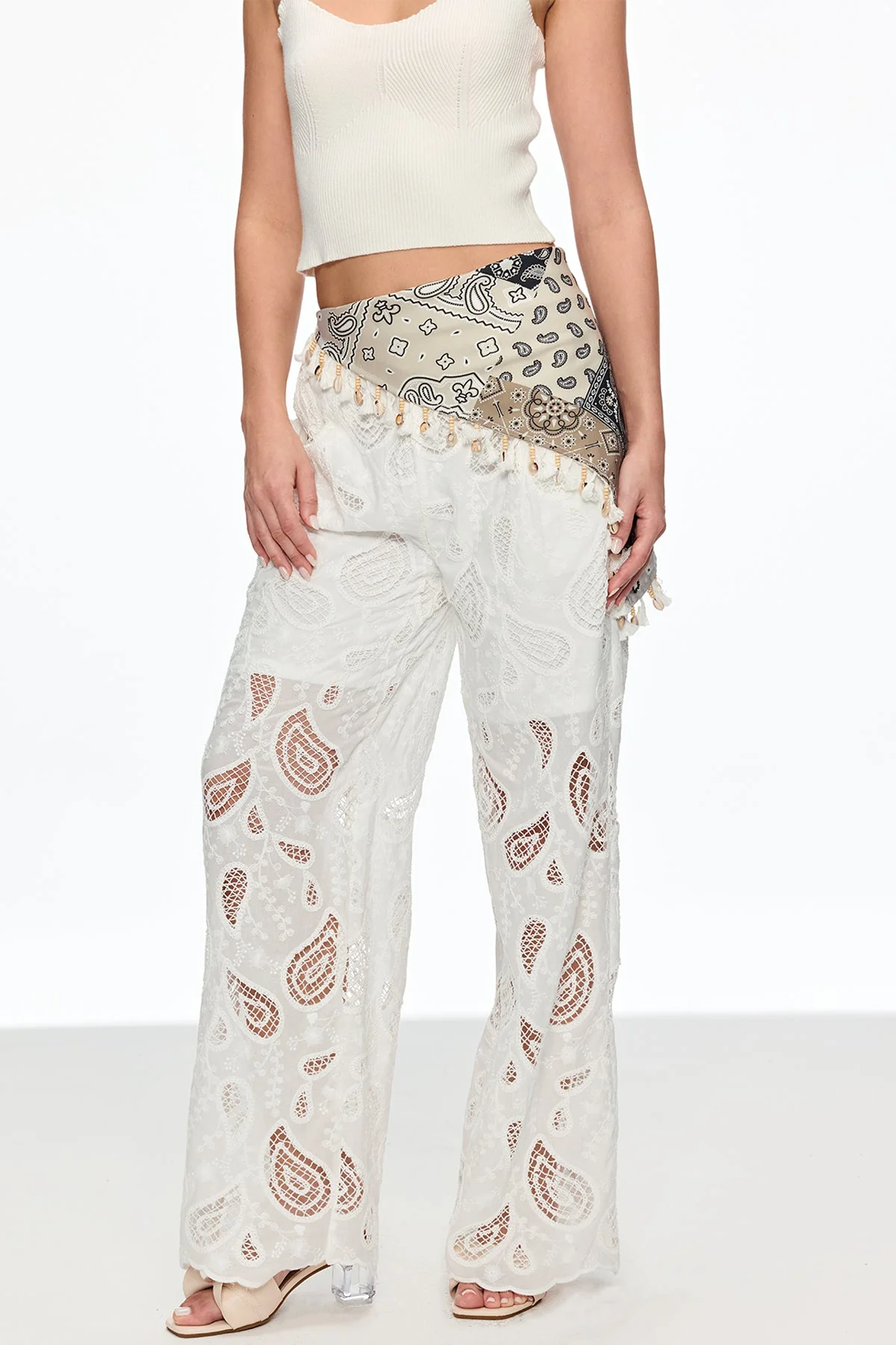 Elevate your wardrobe with the Bohemian Cutout Embroidered Pants . Crafted with intricate cutout details and delicate embroidery, these white pants blend craftsmanship with contemporary design. The flattering fit ensures style and comfort, perfect for professional or casual wear. Gentle machine wash recommended. Due to lighting, color may vary. Discover the perfect balance of style and sophistication today!