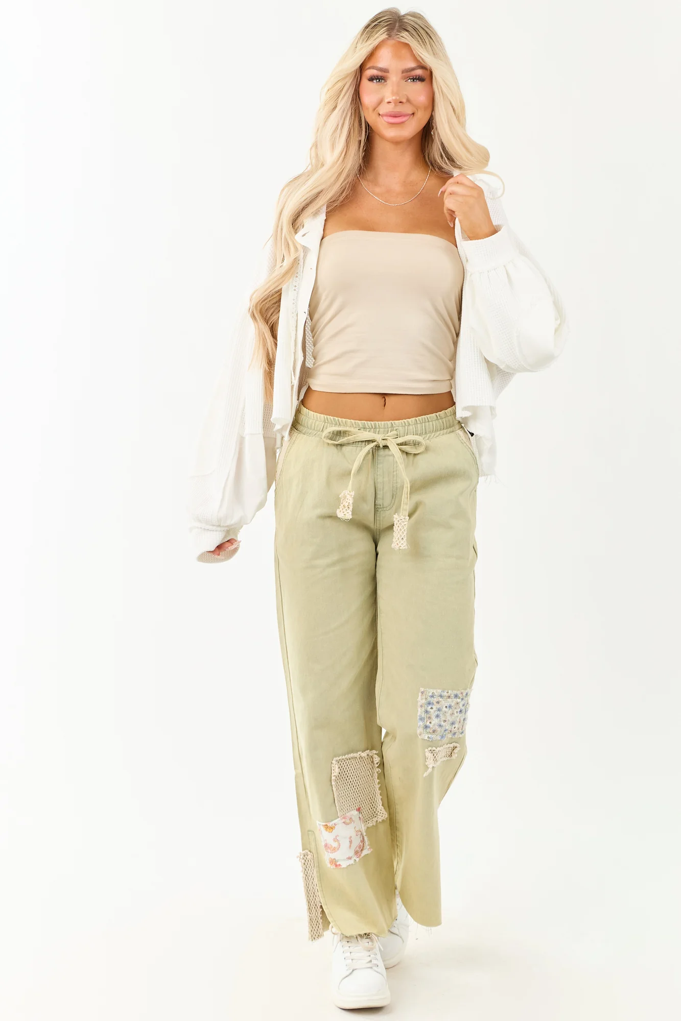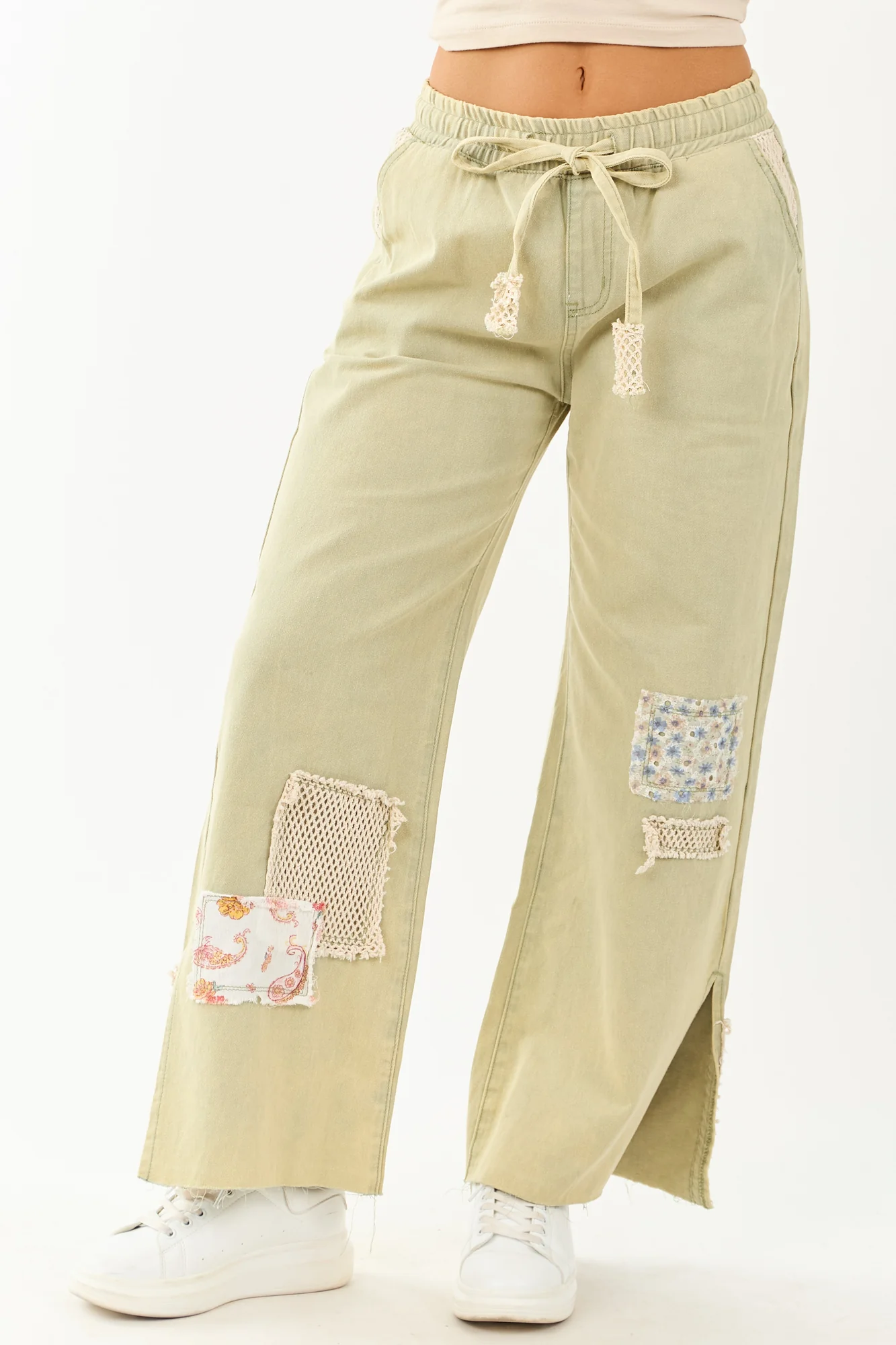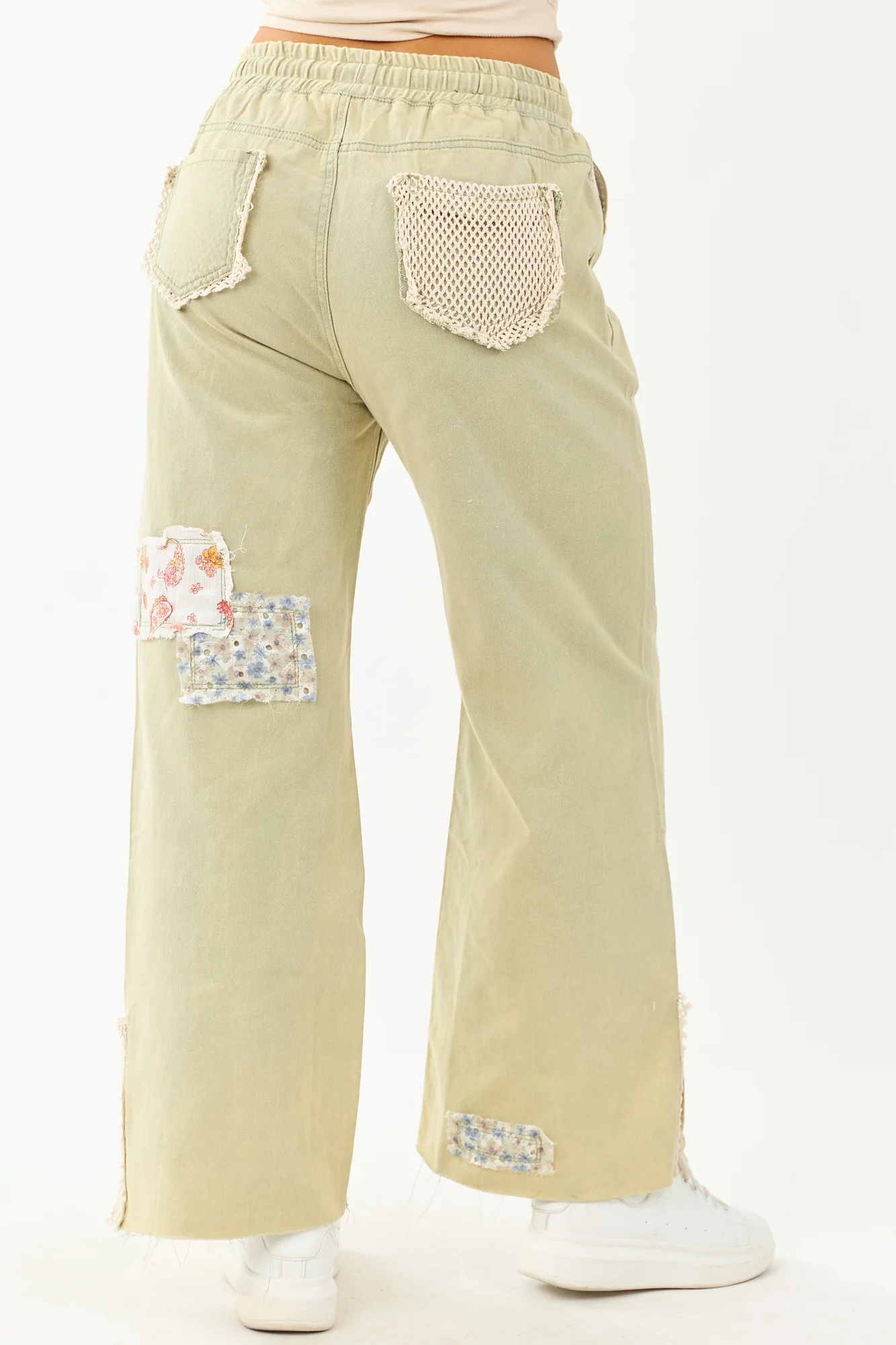 Experience the unique style of our boho casual wide leg pants crafted in non-stretchy denim. These Patchwork Pants feature abstract panels in Dusty Blue, Desert Sand, Marigold, Cherry Blossom, Maroon, and Teal colors with Ivory Fishnet accents. Designed for movement, these pants have an elastic waistband, adjustable drawstring, raw hem, side slits, and 4 pockets. Inseam length of 28″. Made of 100% Cotton. Available sizes: XS-XL. Perfect for a comfortable yet stylish look.