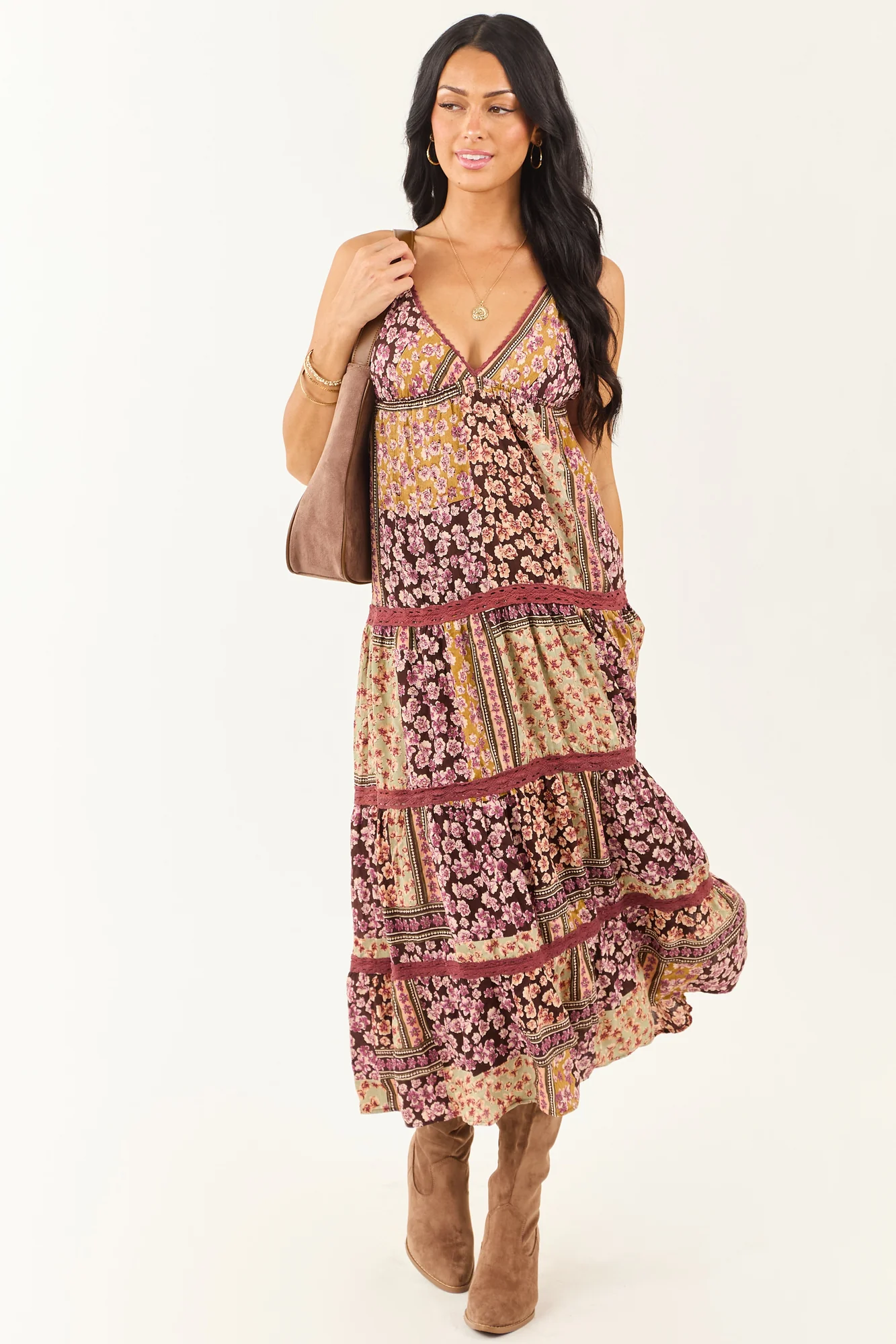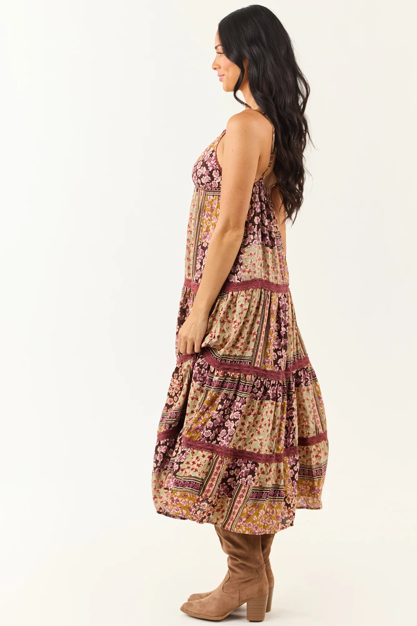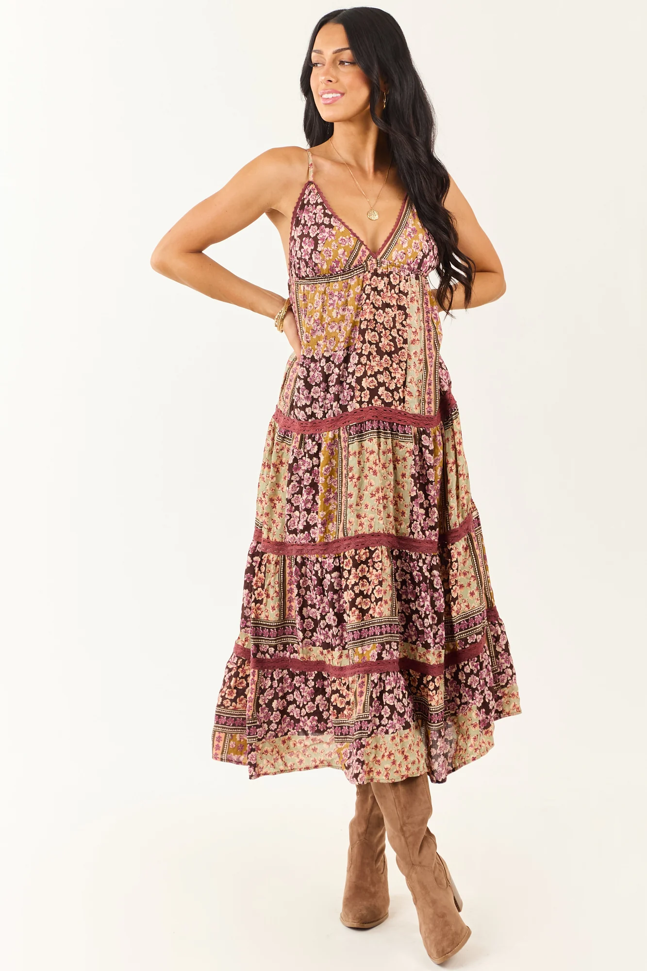 Embrace sweet, flowy style with this boho midi dress featuring a playful neckline, babydoll silhouette, elastic waistband, tiered lace skirt, deep v neck, and open back. Lined torso for comfort. Made of 100% Rayon. Please refer to the size chart for accurate measurements. Each piece is unique due to the cutting and sewing process. Dress up effortlessly with floral shades of Ivory, Plum, Desert, Blush, Cocoa, and Arctic Blue. Available in sizes XS to XL.