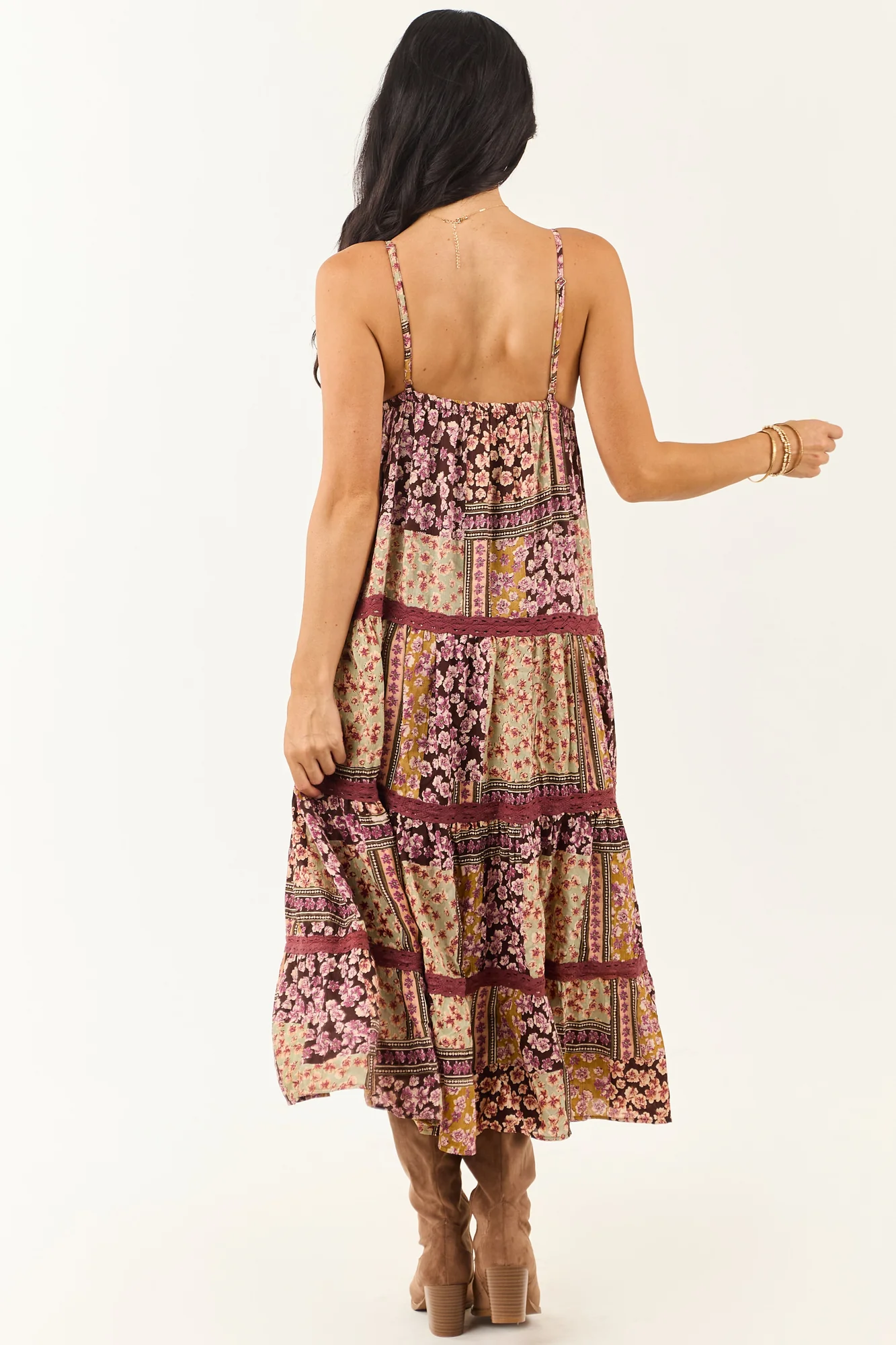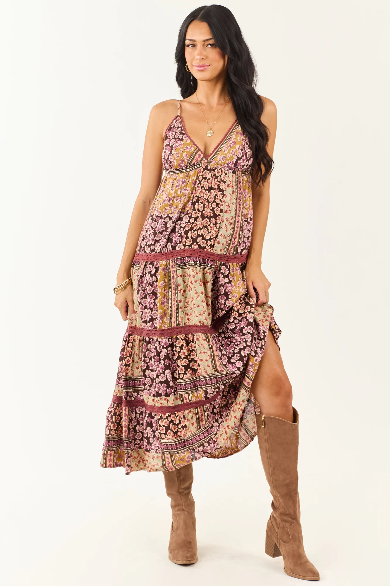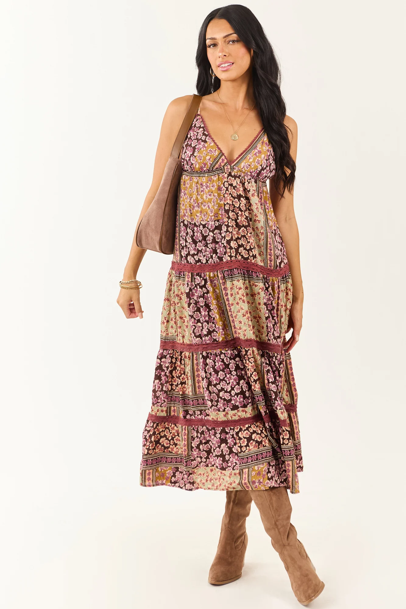 Embrace sweet, flowy style with this boho midi dress featuring a playful neckline, babydoll silhouette, elastic waistband, tiered lace skirt, deep v neck, and open back. Lined torso for comfort. Made of 100% Rayon. Please refer to the size chart for accurate measurements. Each piece is unique due to the cutting and sewing process. Dress up effortlessly with floral shades of Ivory, Plum, Desert, Blush, Cocoa, and Arctic Blue. Available in sizes XS to XL.