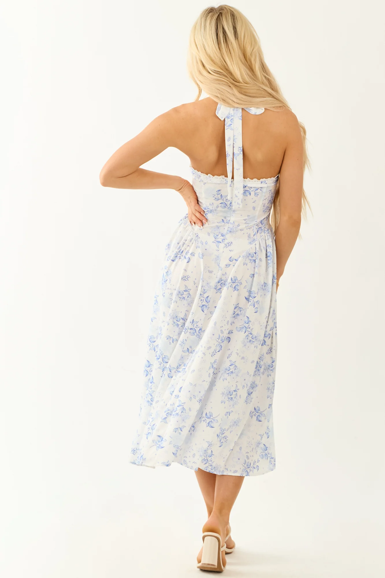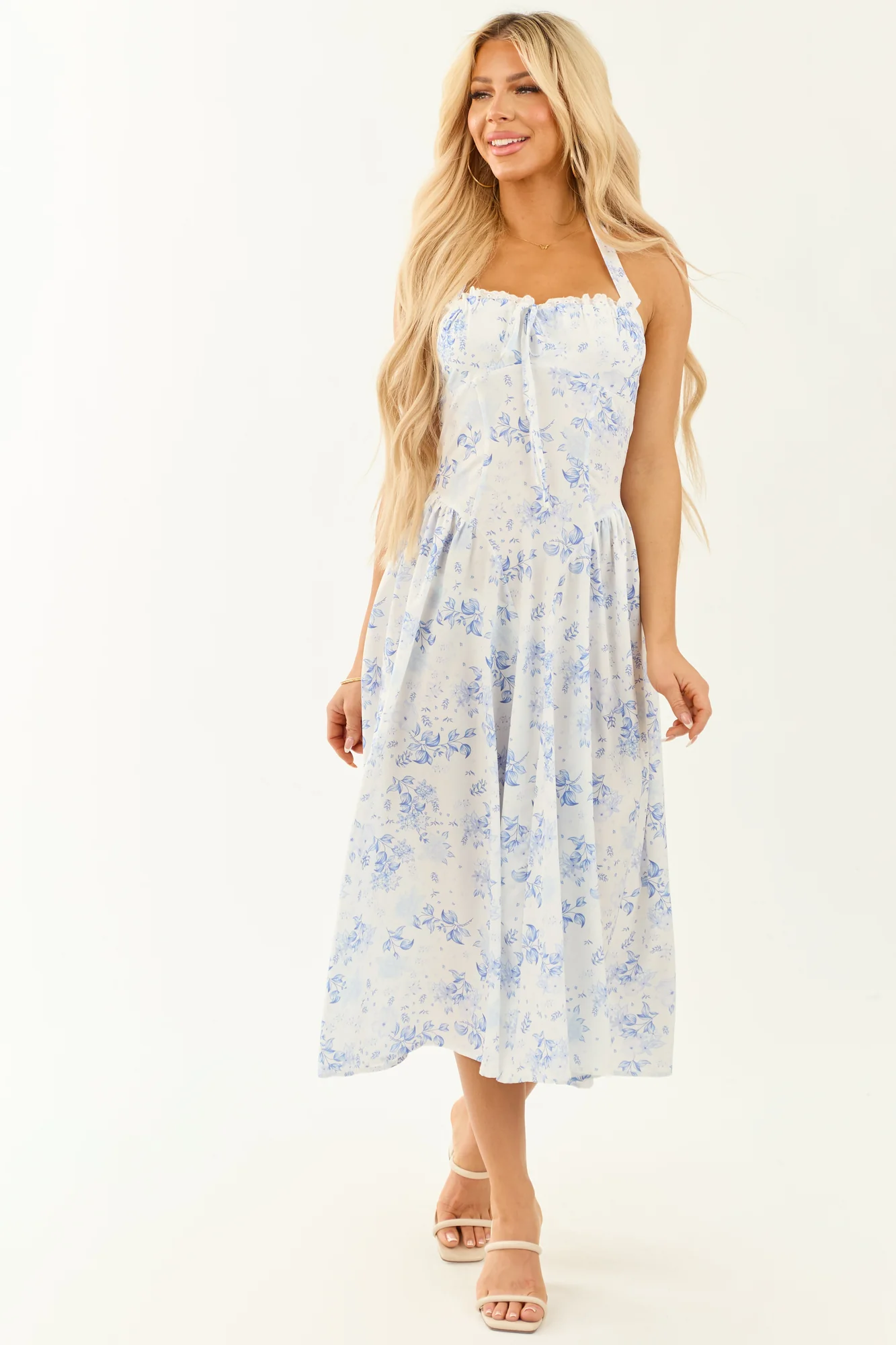 This elegant midi dress features a blend of retro charm and modern boho style! The bodice runs slightly small, so we recommend sizing up if between sizes. Crafted with cobalt and dusty blue floral prints, halter neck tie straps, adjustable cinching tie on the bust, hidden back zipper, and eyelet lace trim. Ideal for spring and summer, this sleeveless dress is perfect for various occasions. The elastic back allows extra bust space for a comfortable fit. Care instructions: Wash separately, professional dry clean recommended. Each piece is unique due to the fabrics print and cutting process. Model is wearing a size Small. Models measurements: Size 1, Height 57″, Bust 34″, Waist 26″.