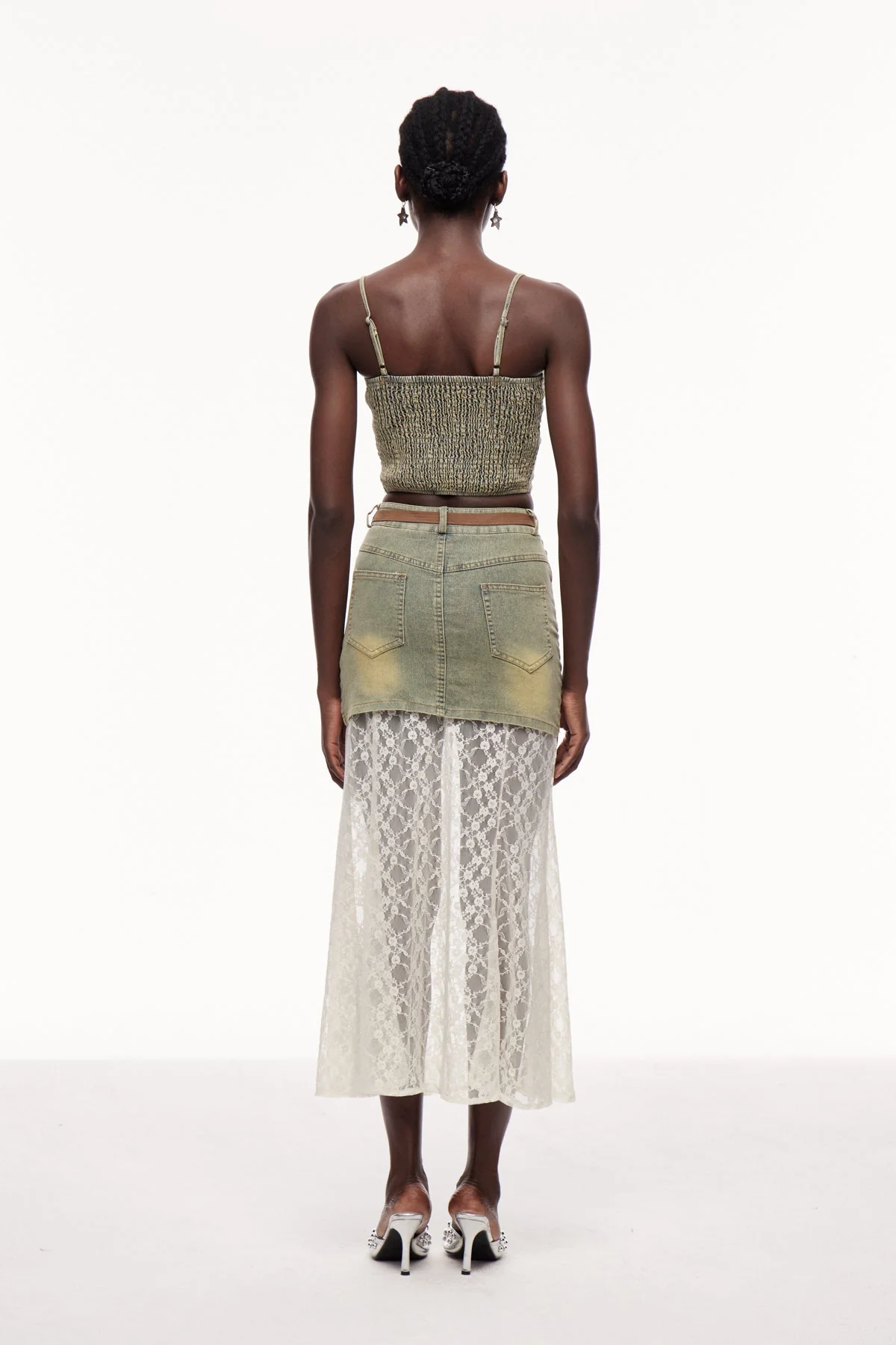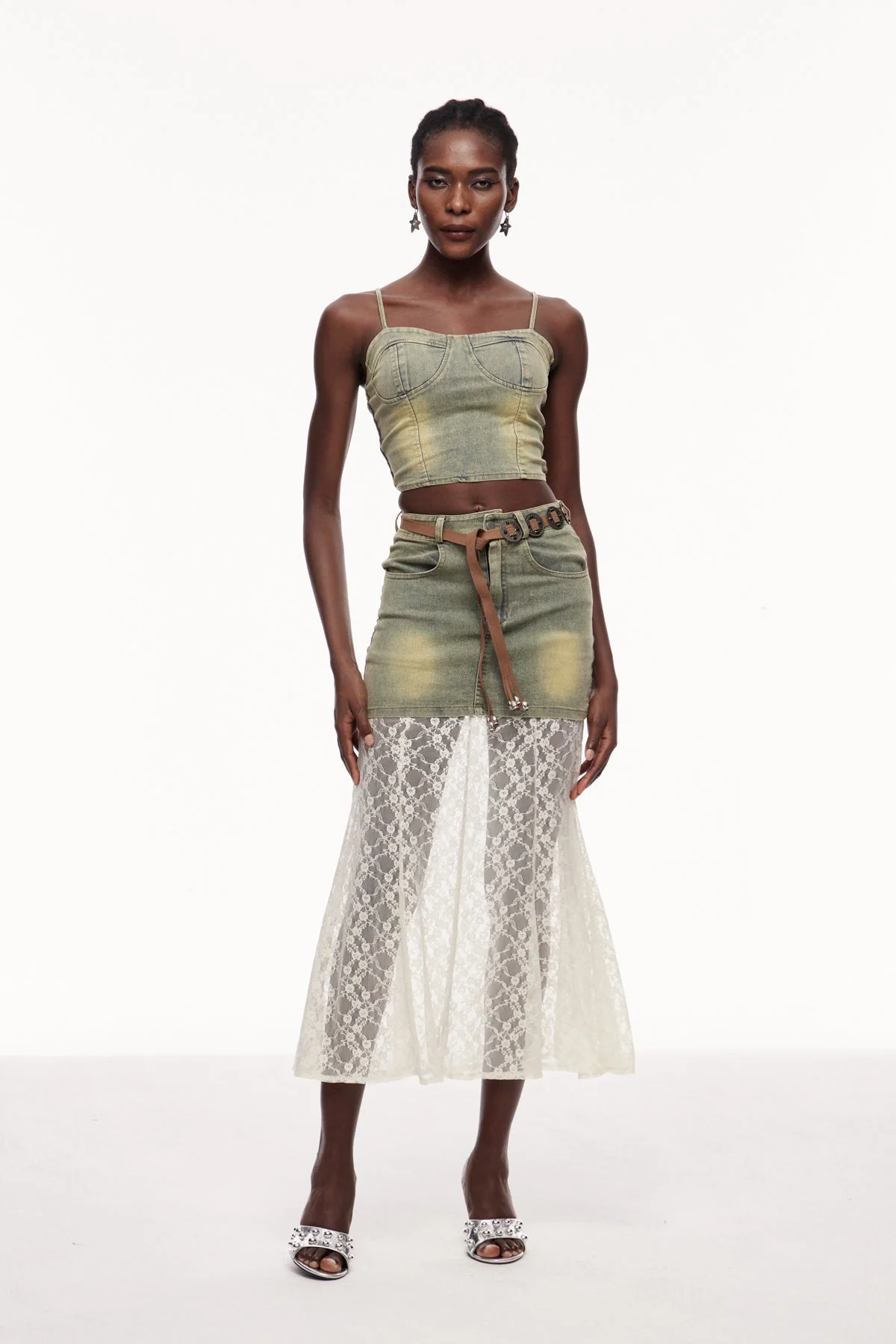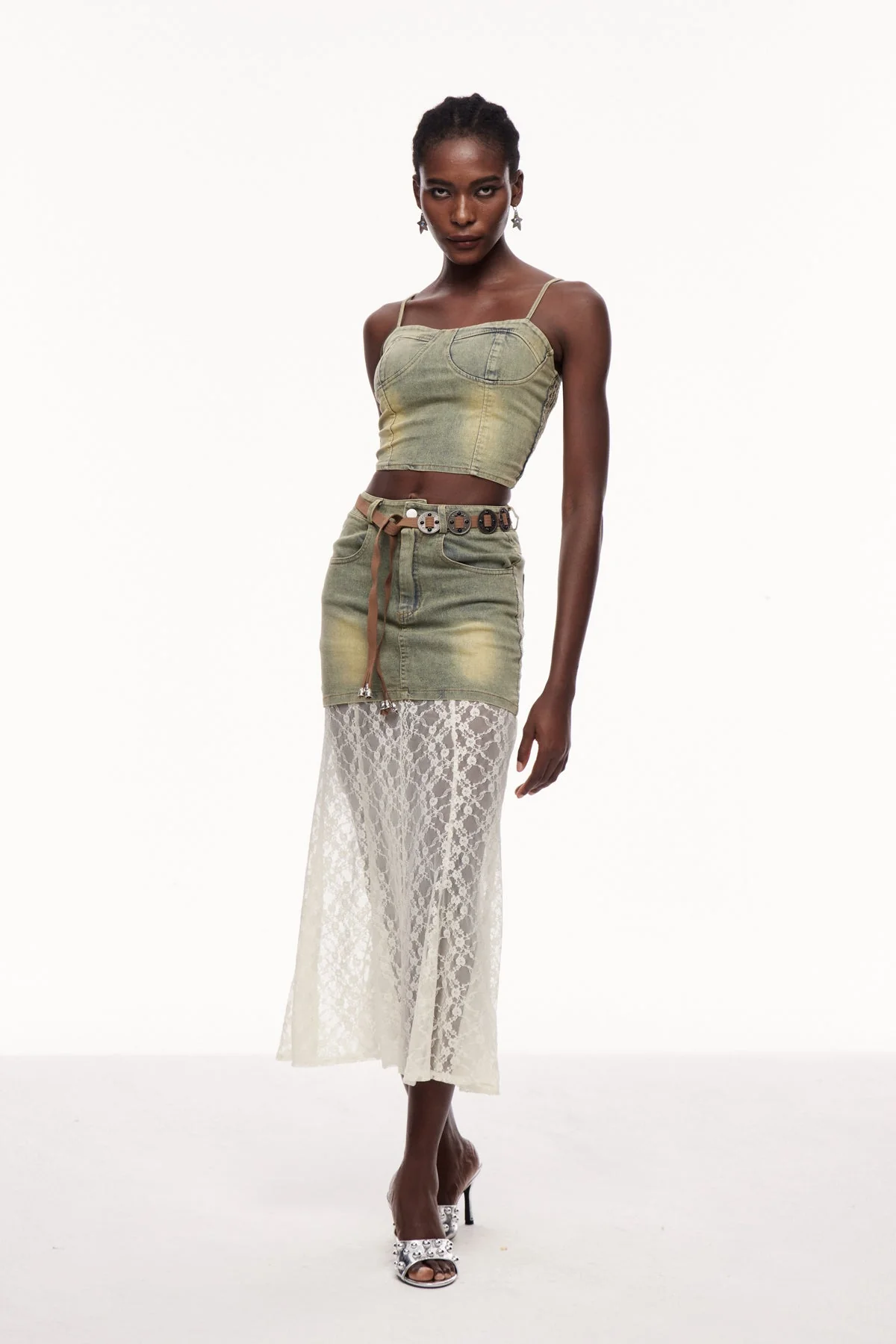 Indulge in the exquisite boho charm of the Lace Denim Skirt Set in refreshing Green. This versatile set seamlessly blends durable denim with delicate lace details for a modern, refined look. Perfect for both casual and semi-formal occasions, the expertly crafted skirt and top combo ensures a flattering fit and superior style. Enjoy comfort and elegance with lightweight spaghetti straps and intricate lace accents. Elevate your wardrobe with this sophisticated ensemble. Non-Stretch Fabric, Easy Machine Wash. Please note: Color may vary due to lighting. Includes skirt and spaghetti strap top.