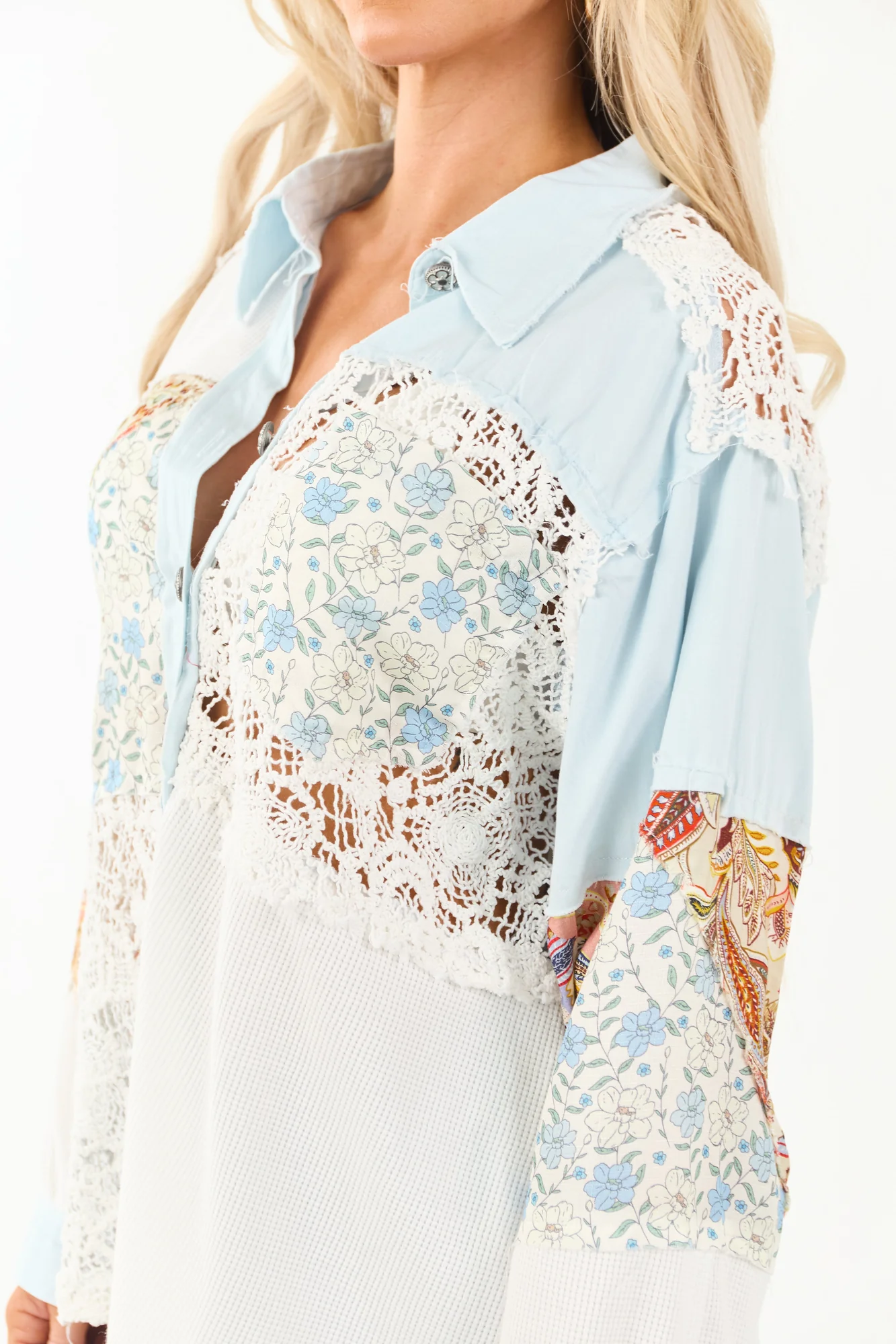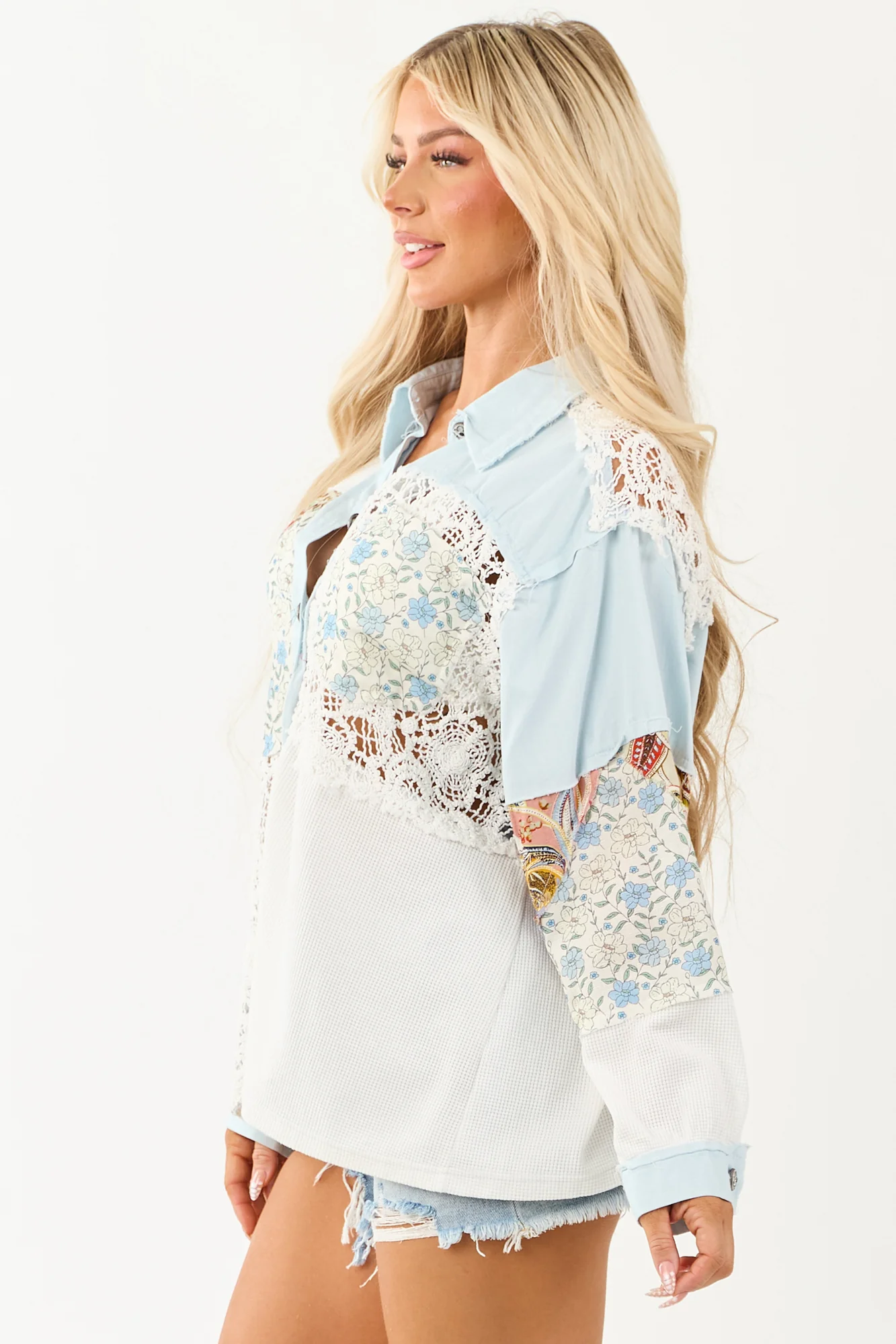 Indulge in the sophistication of our oversized boho top featuring patchwork in shades of Off White, Powder Blue, Jungle Green, Straw, Sandstone, Iris, Mustard, Brick, Mango, Blush, Maroon, Sage, and Navy. Crafted from non-stretchy chambray denim with stretchy open knit accents, this top exudes charm and versatility with raw collar trim, chest pocket, and banded buttoned cuffs. Embrace the essence of individuality with this unique piece that effortlessly blends style and comfort. Imported. Note: Each piece may vary slightly due to the cutting and sewing process. Model is wearing size Small. Model’s Profile: Size 3, Height 57″, Bust 35″, Waist 26″