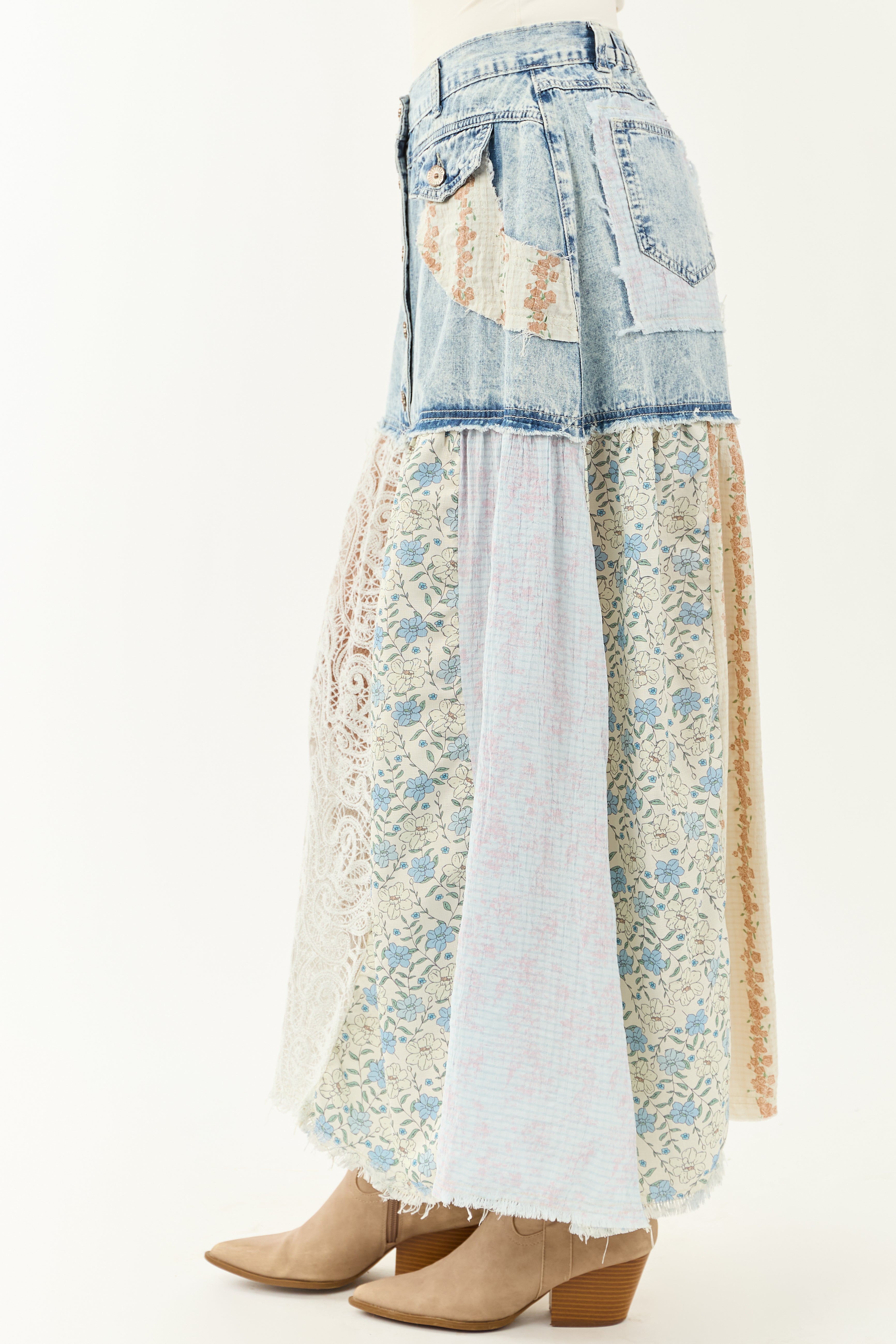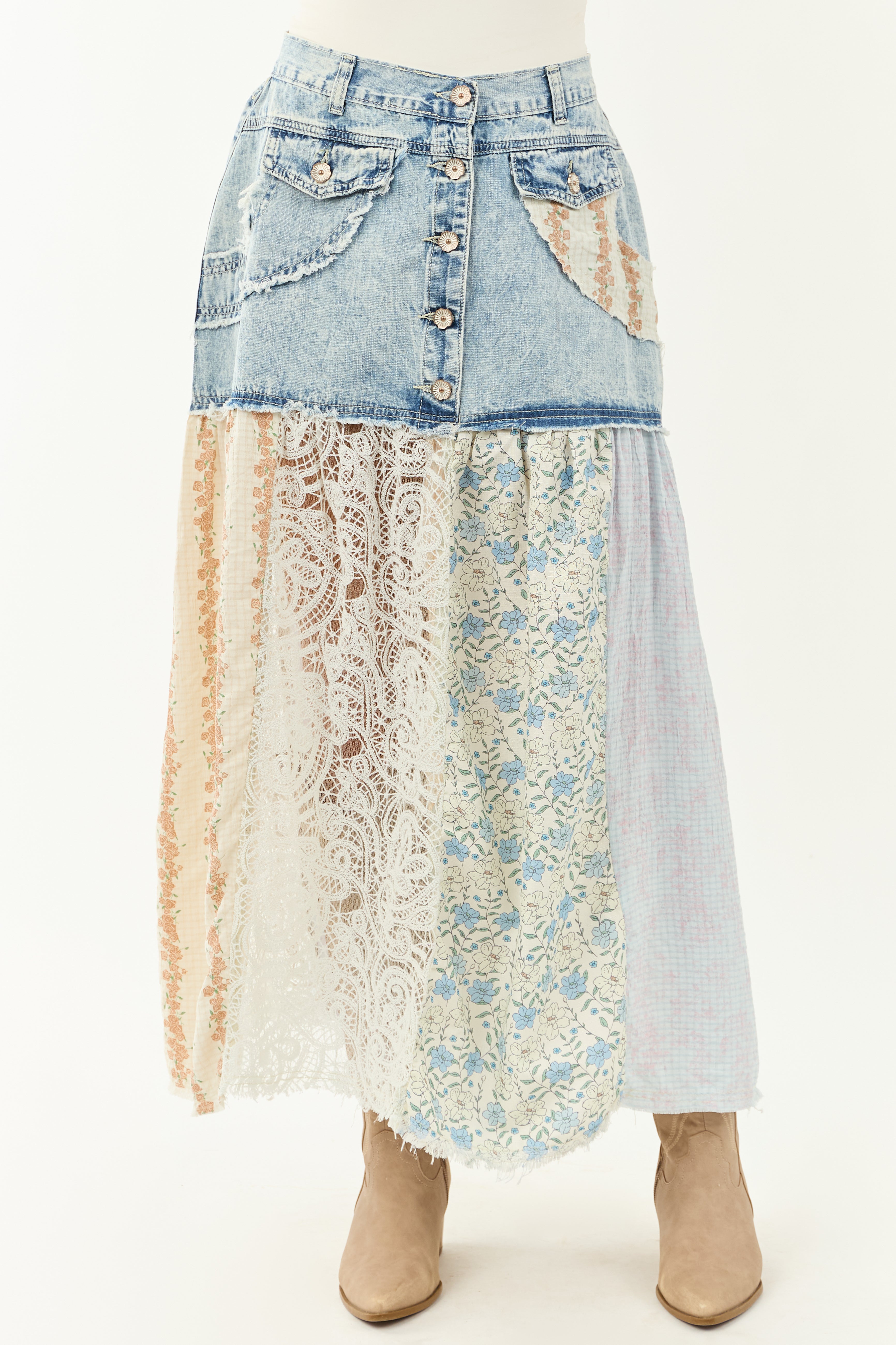 Explore the charm of vintage fashion with our Artsy Patchwork Denim Maxi Skirt! Embrace boho vibes with shades of Ivory, Terracotta, Powder Blue, Juniper, and Baby Pink. This non-stretchy lightweight denim skirt features sheer lace paneling, raw seams, and functional back pockets. Complete with a button-up front and belt loops, it exudes a retro appeal perfect for fashion-forward individuals with a penchant for unique style. Sizing tip: Waistband runs slightly large, so if you are between sizes, consider sizing down. Ideal for pairing with your favorite blouses or tops. Channel your inner bohemian spirit with this must-have skirt!
