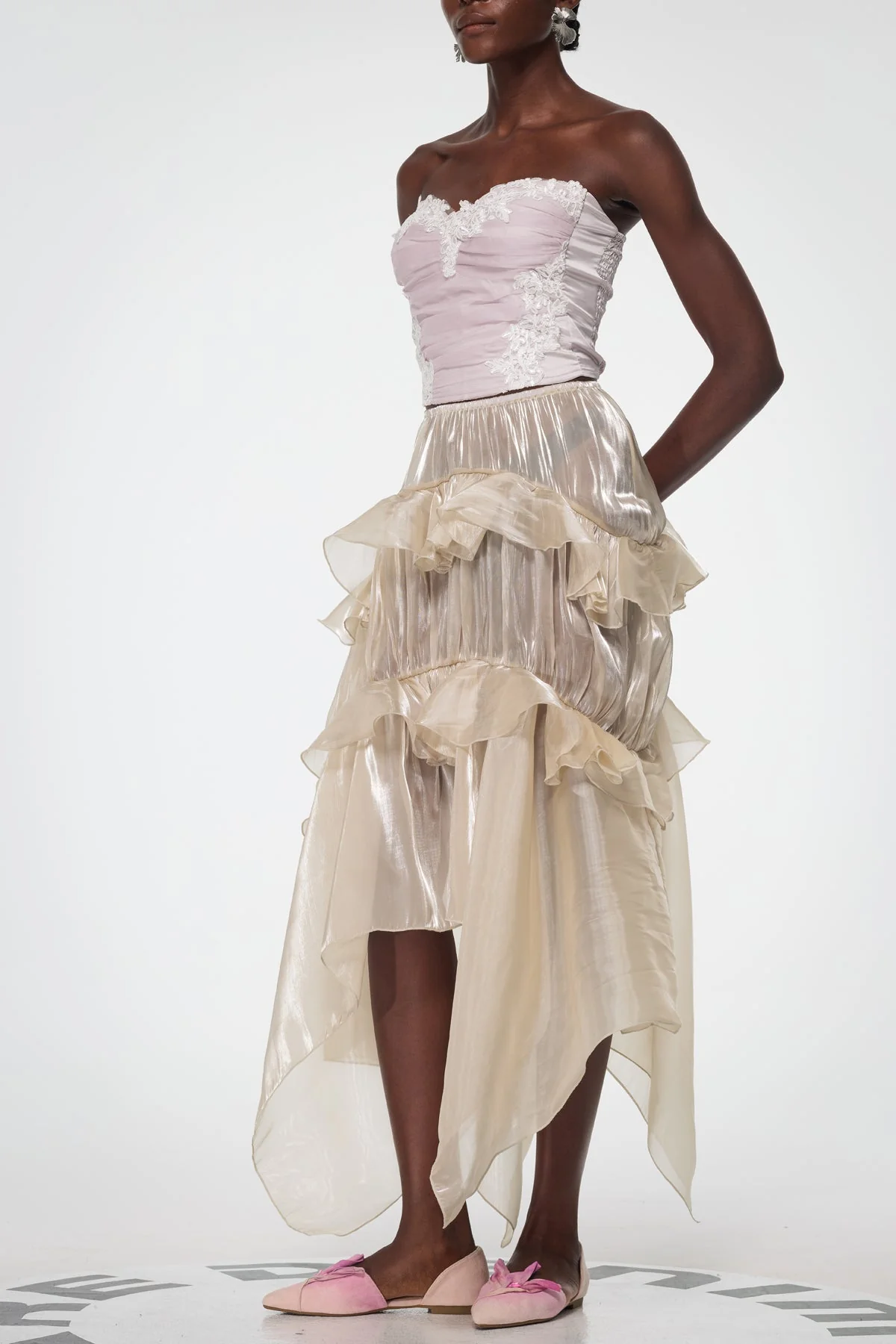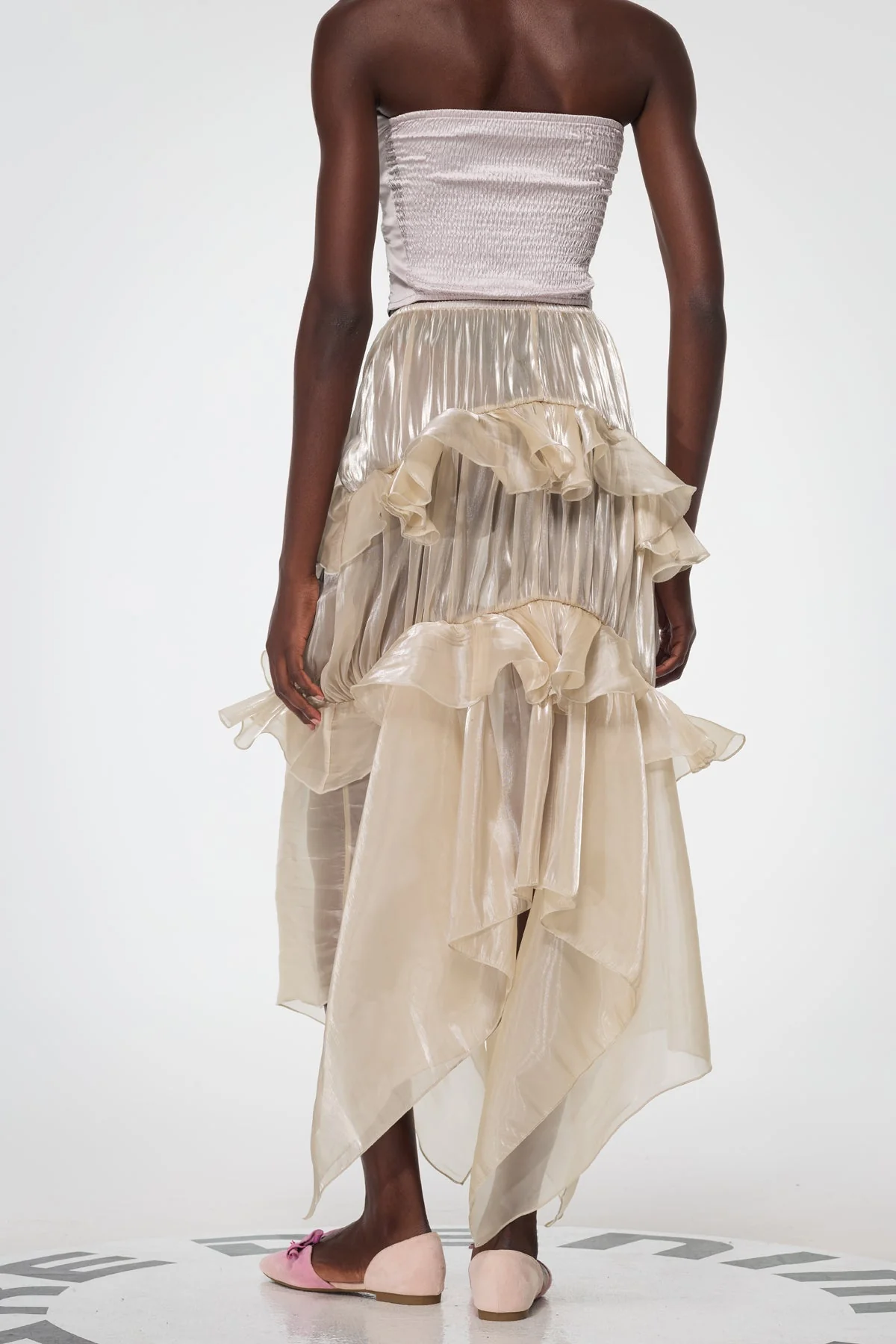 Indulge in comfort and style with our Boho Ruffle Asymmetric Maxi Skirt. The unique ruffle design and asymmetrical hem promise to capture attention wherever you go. Crafted from premium materials (50% Polyester, 50% Cotton), this skirt offers durability and softness for extended wear. Elevate your wardrobe effortlessly with this versatile and chic essential perfect for gentle machine wash. Explore non-stretch comfort for all-day elegance. Color may vary due to image lighting. Enhance your look with this champagne-colored skirt and embrace its sophisticated charm.