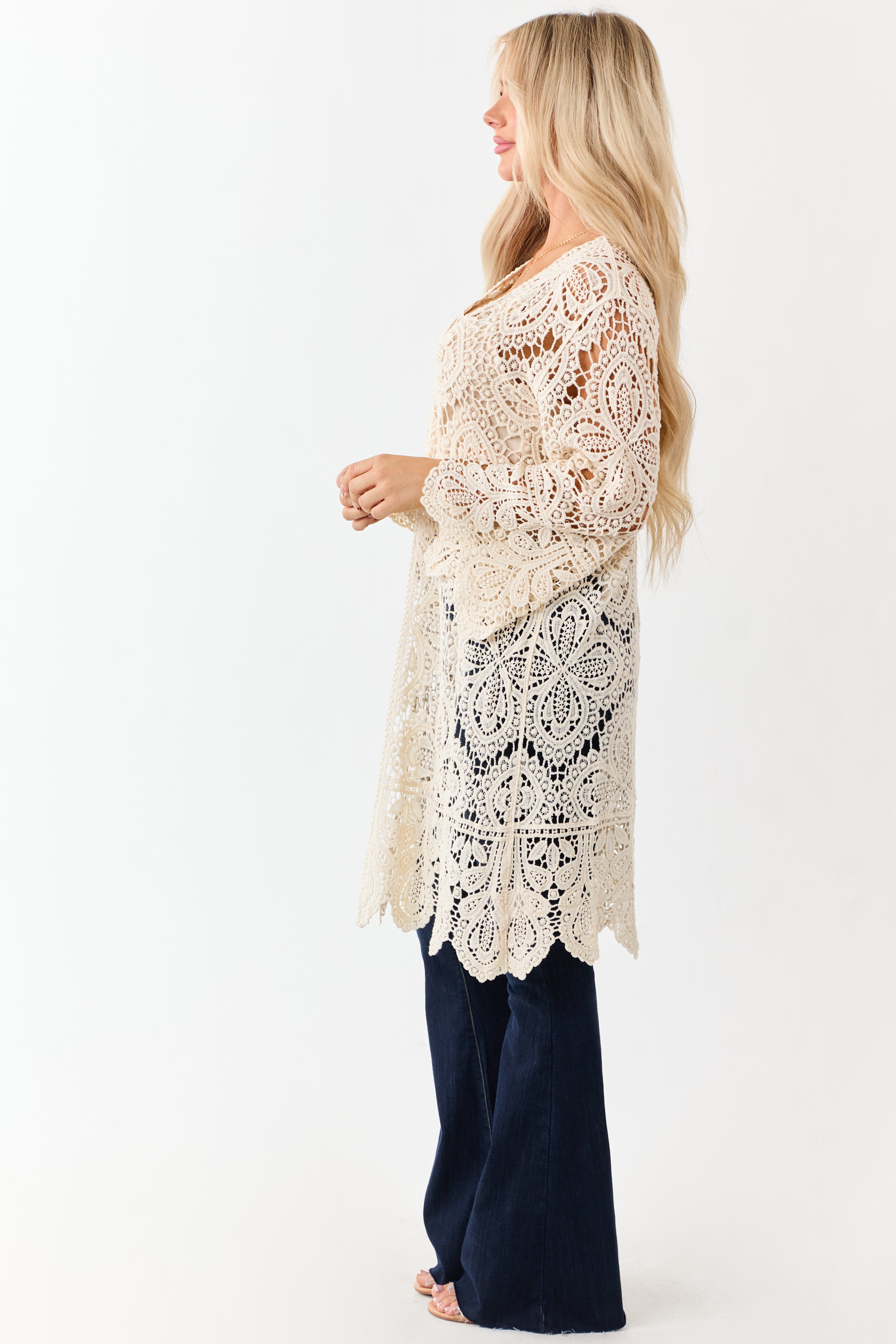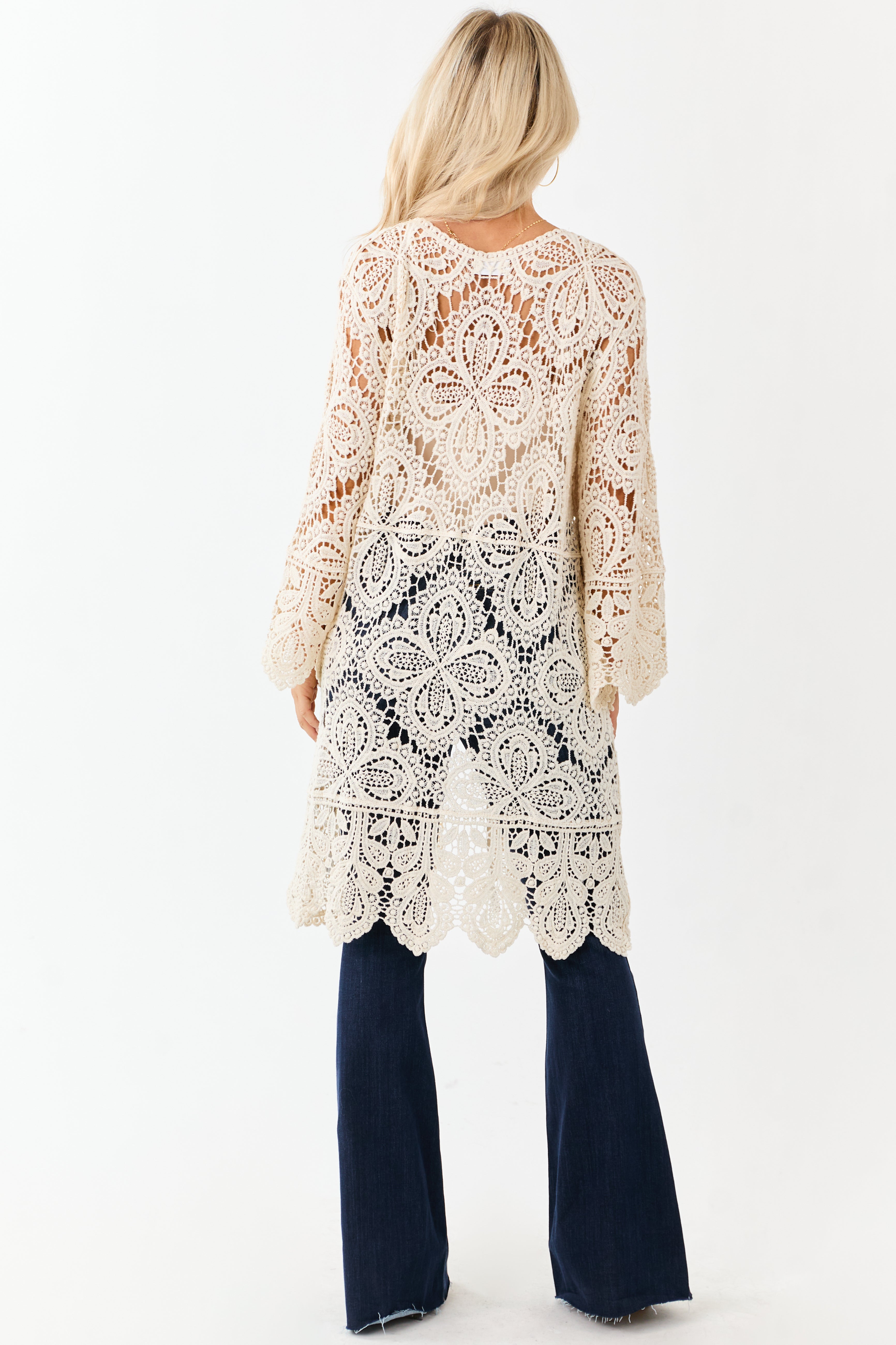 Indulge in the boho charm with our elegant white crochet floral duster cardigan. Crafted from 100% cotton with a relaxed fit, open front, scalloped trim, and high low hem for a breezy style statement. Perfect for layering and adding a touch of sophistication to your outfit. This versatile piece is a must-have for every fashion-forward wardrobe.