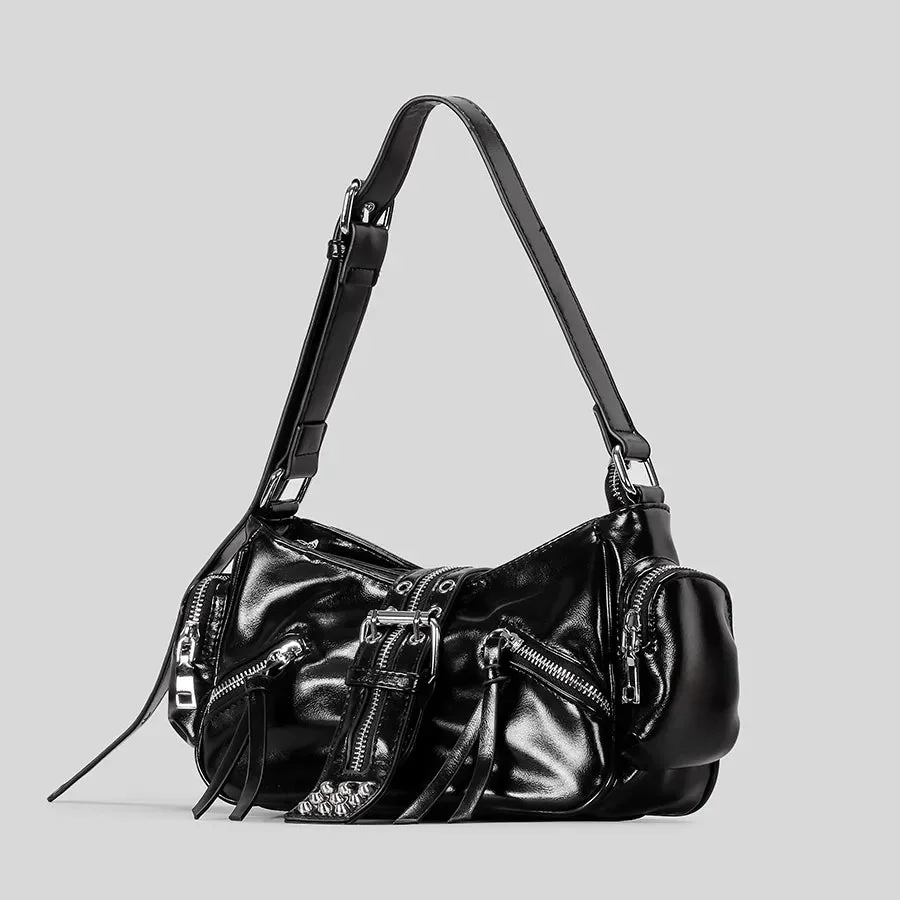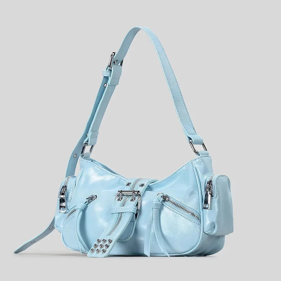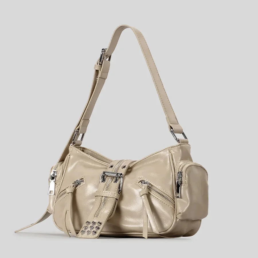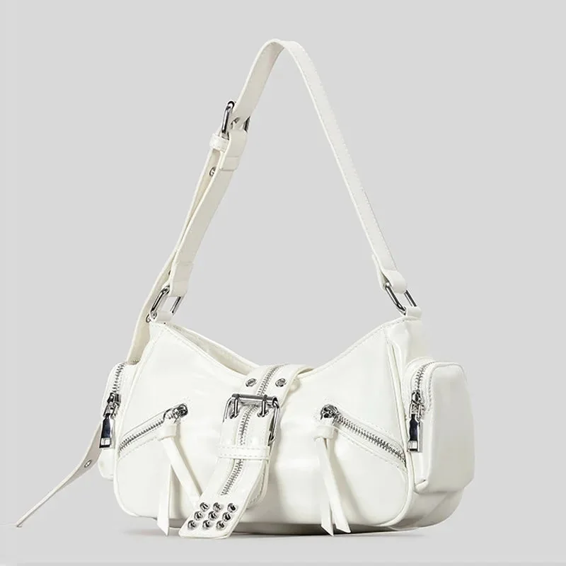 Elevate your style with the Bold Rivet Shoulder Bag featuring edgy design and impeccable practicality. Crafted with striking rivet accents, this bag offers multiple zipper compartments for organized storage of all your essentials. Its durable structure ensures long-lasting use, combining fashion and function effortlessly. The versatile strap ensures comfortable carrying, perfect for various occasions from casual outings to stylish evenings. Transition seamlessly between events with this trendy and reliable bag. Discover more styling ideas on Instagram @mermaidway.
