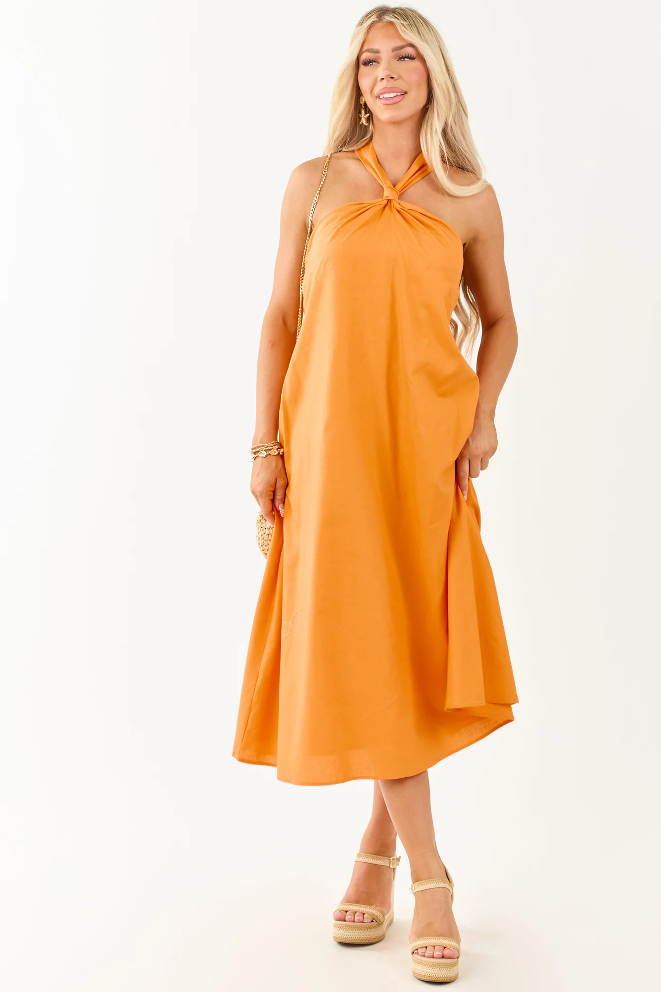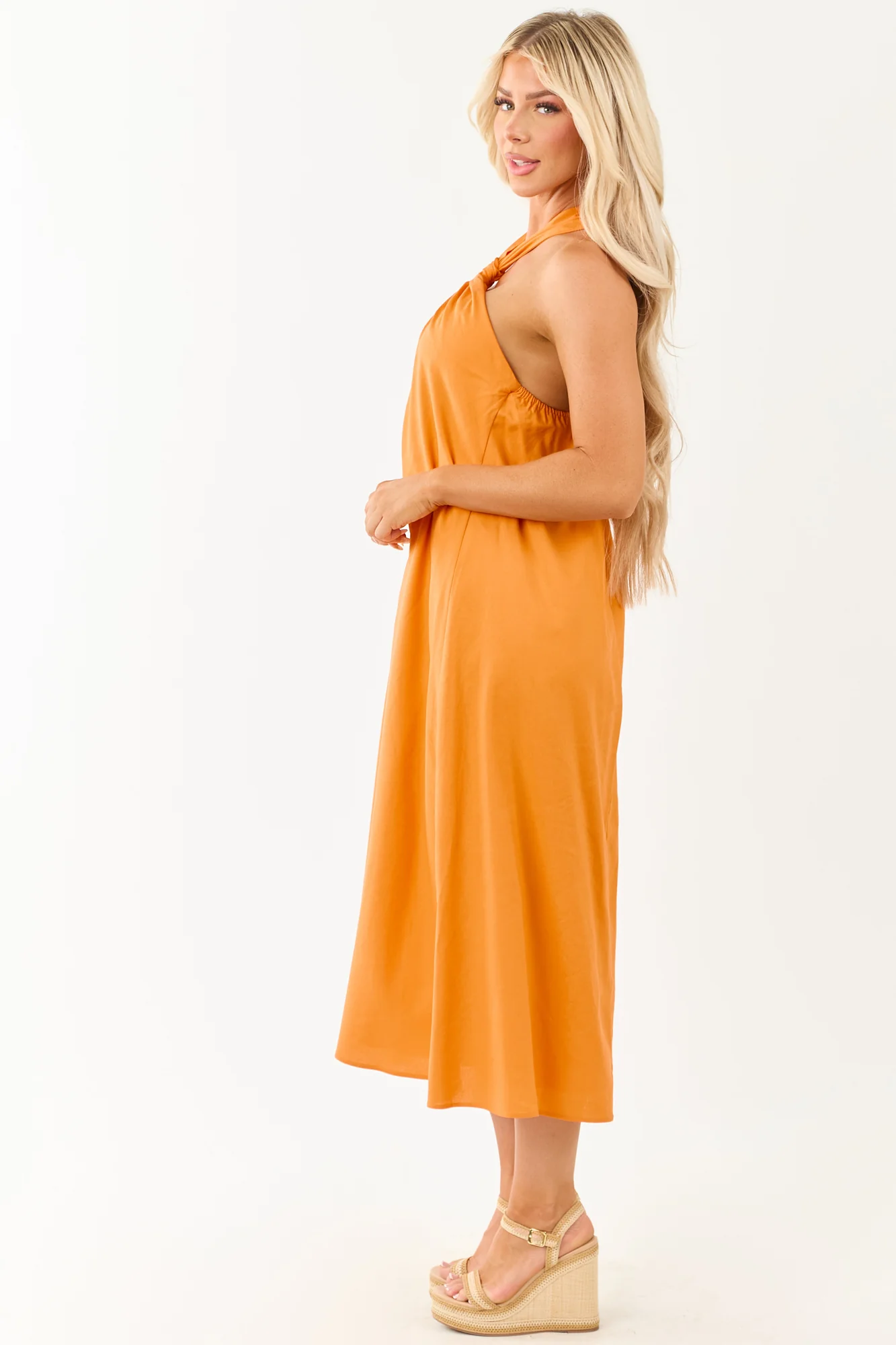 Stay stylish and cool in this bright orange halter midi dress made from a lightweight linen blend. Featuring a knot tie neckline and a non-stretchy silhouette, this dress is perfect for sunny days. This tent-fit dress fits true to size and is designed with an elastic back neckline for comfort. Crafted from 55% Viscose and 45% Linen with a 100% Rayon lining. Imported. Garment measurements for size small: Bust – 33″, Waist – 36″, Length – 49″. Model is wearing a size Small. Size 3, Height 57″, Bust 35″, Waist 26″.