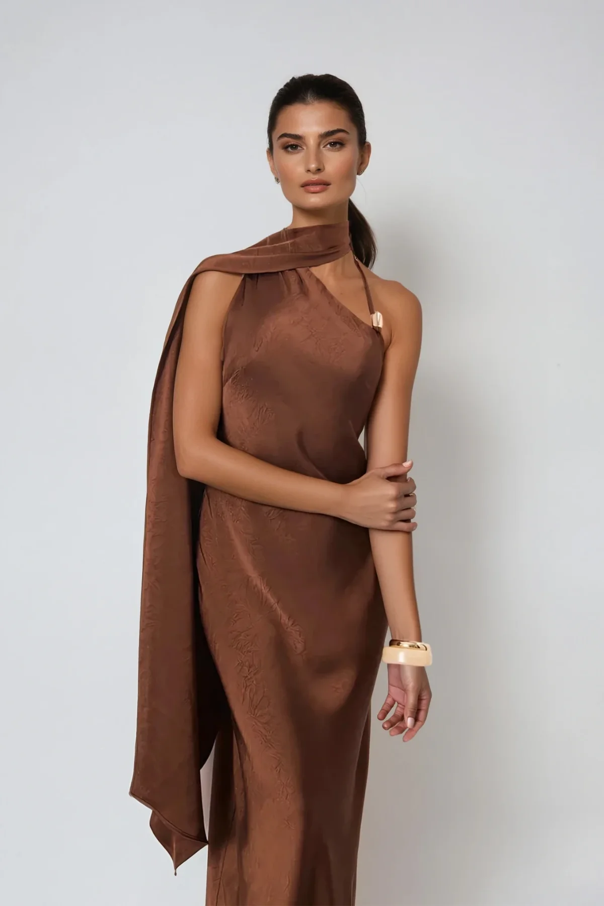Elevate your wardrobe with the Brown Asymmetric Scarf Maxi Dress . This chic essential boasts a contemporary design with an elegant scarf detail, offering a blend of sophistication and style. The dress ensures a flattering silhouette that effortlessly transitions from day to night, providing versatility and refinement. Crafted for comfort and movement, this non-stretch dress is perfect for various occasions. While gentle machine wash maintains its quality, please note that actual color may slightly vary due to lighting in images. Discover the perfect balance of fashion and function with this must-have masterpiece.