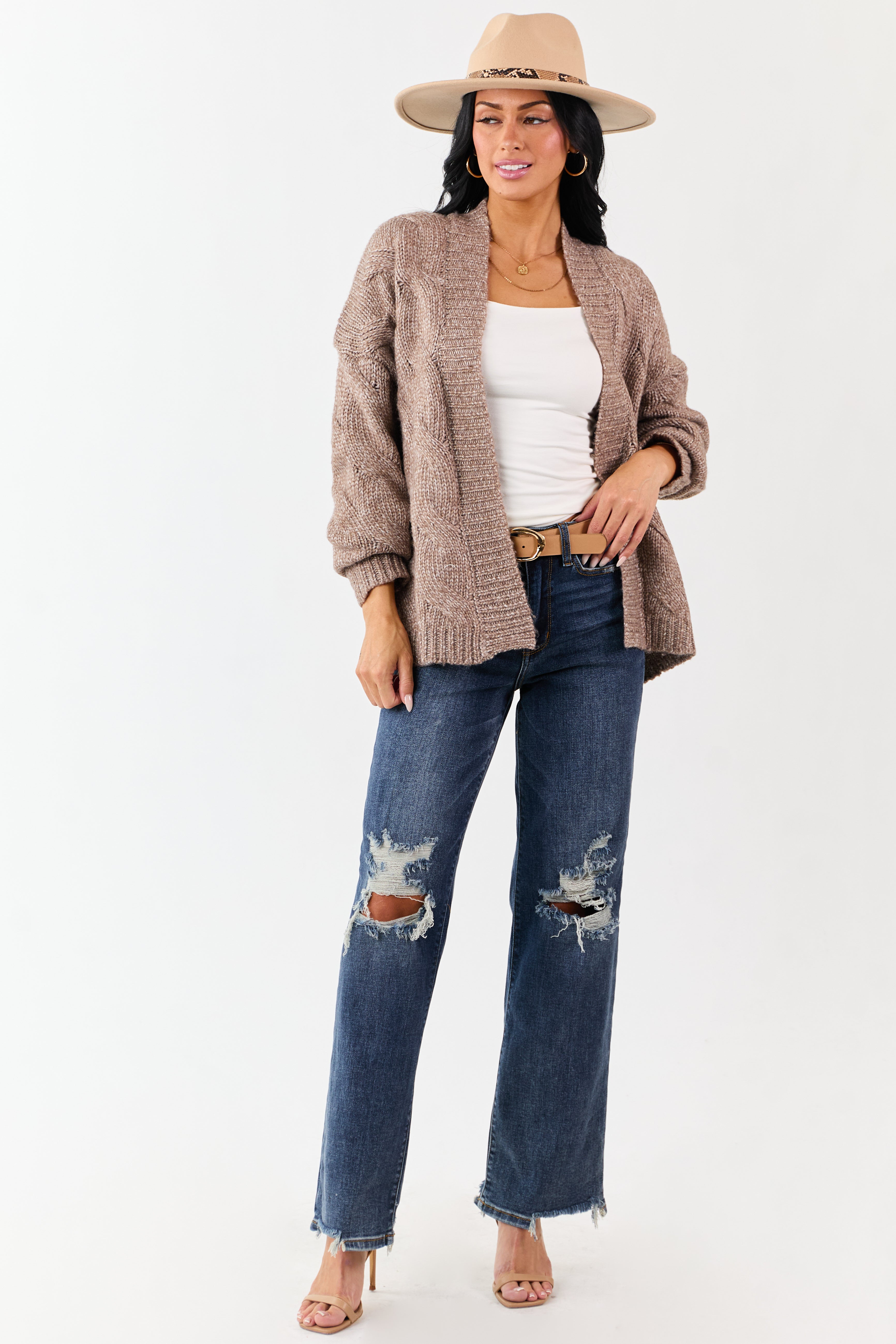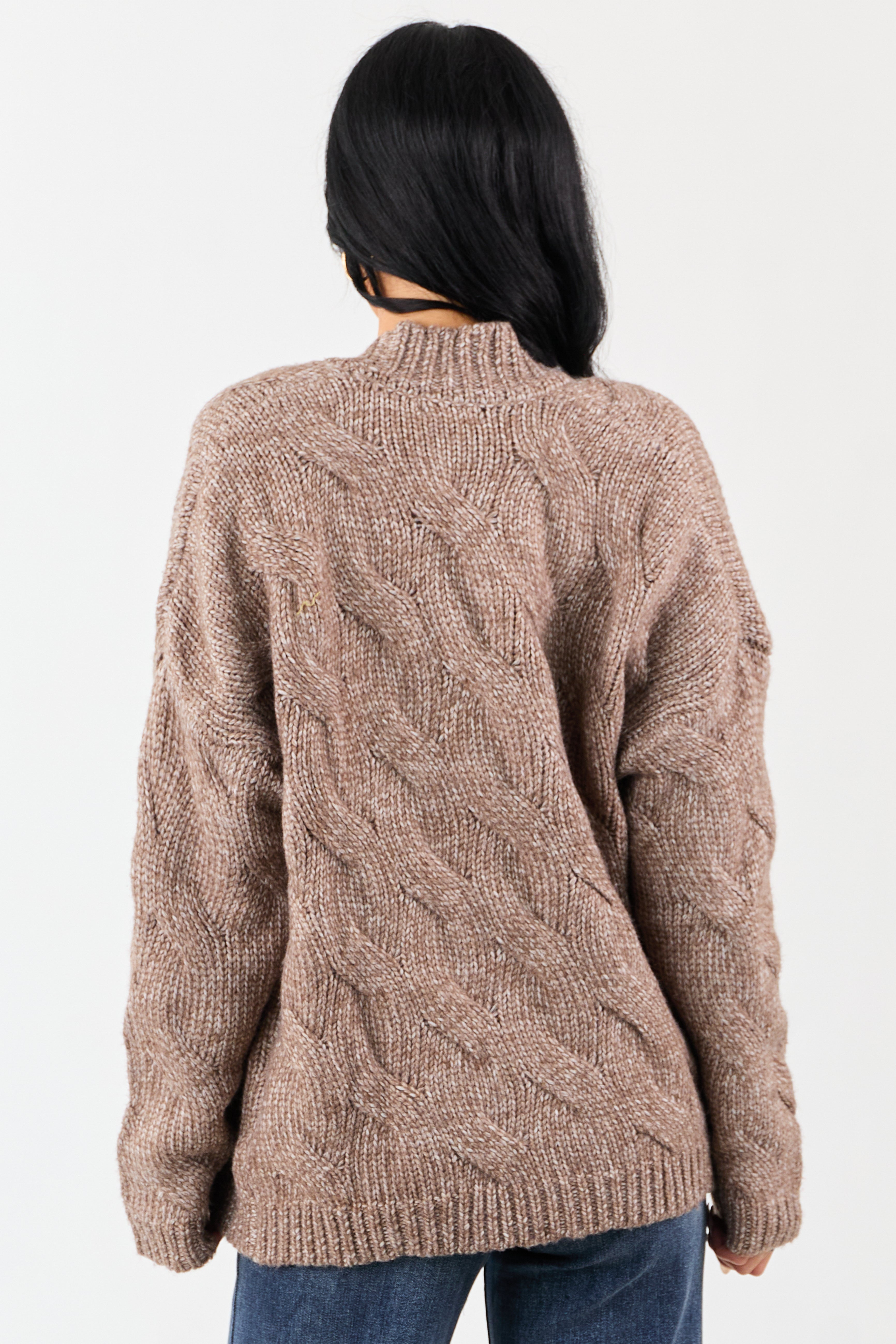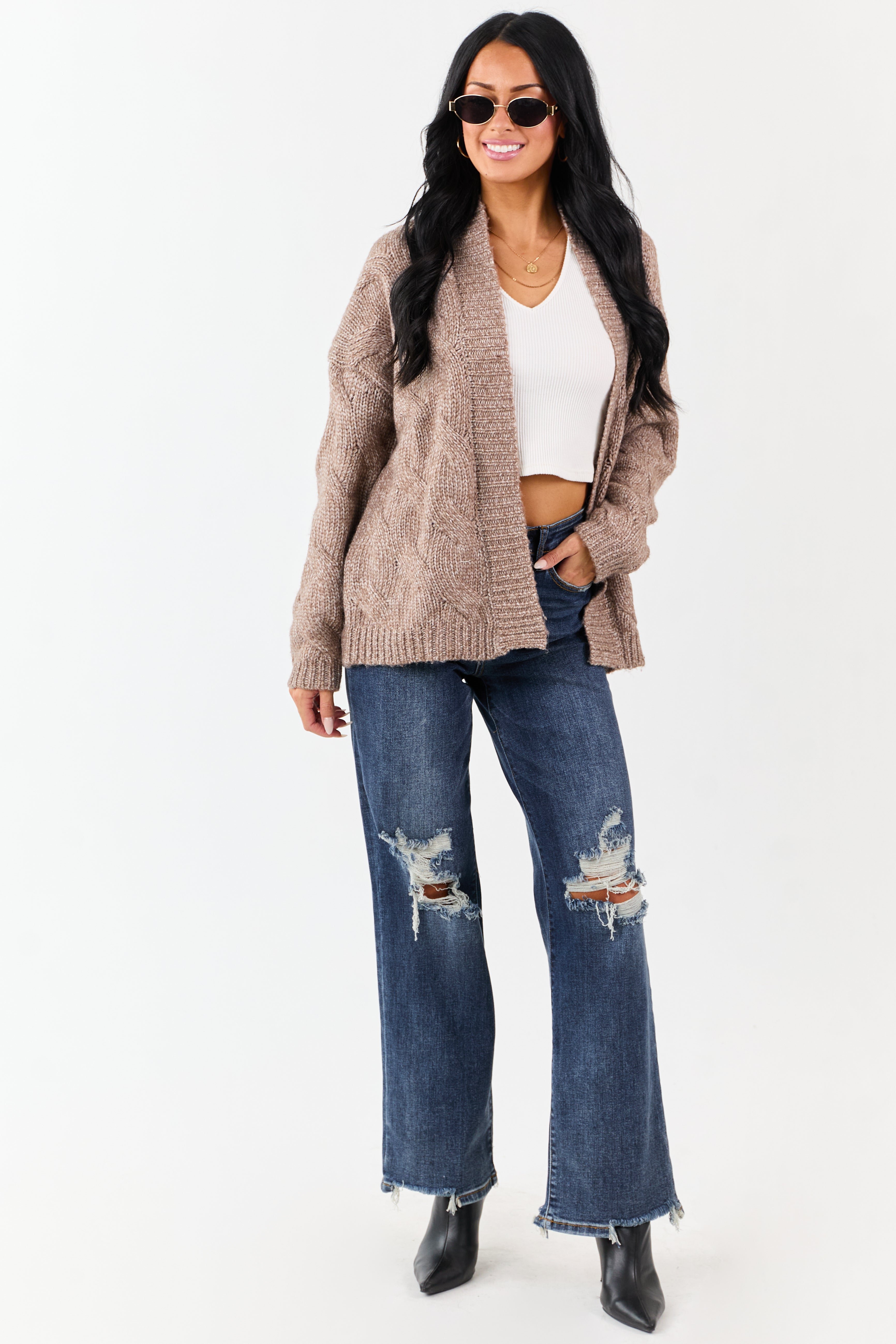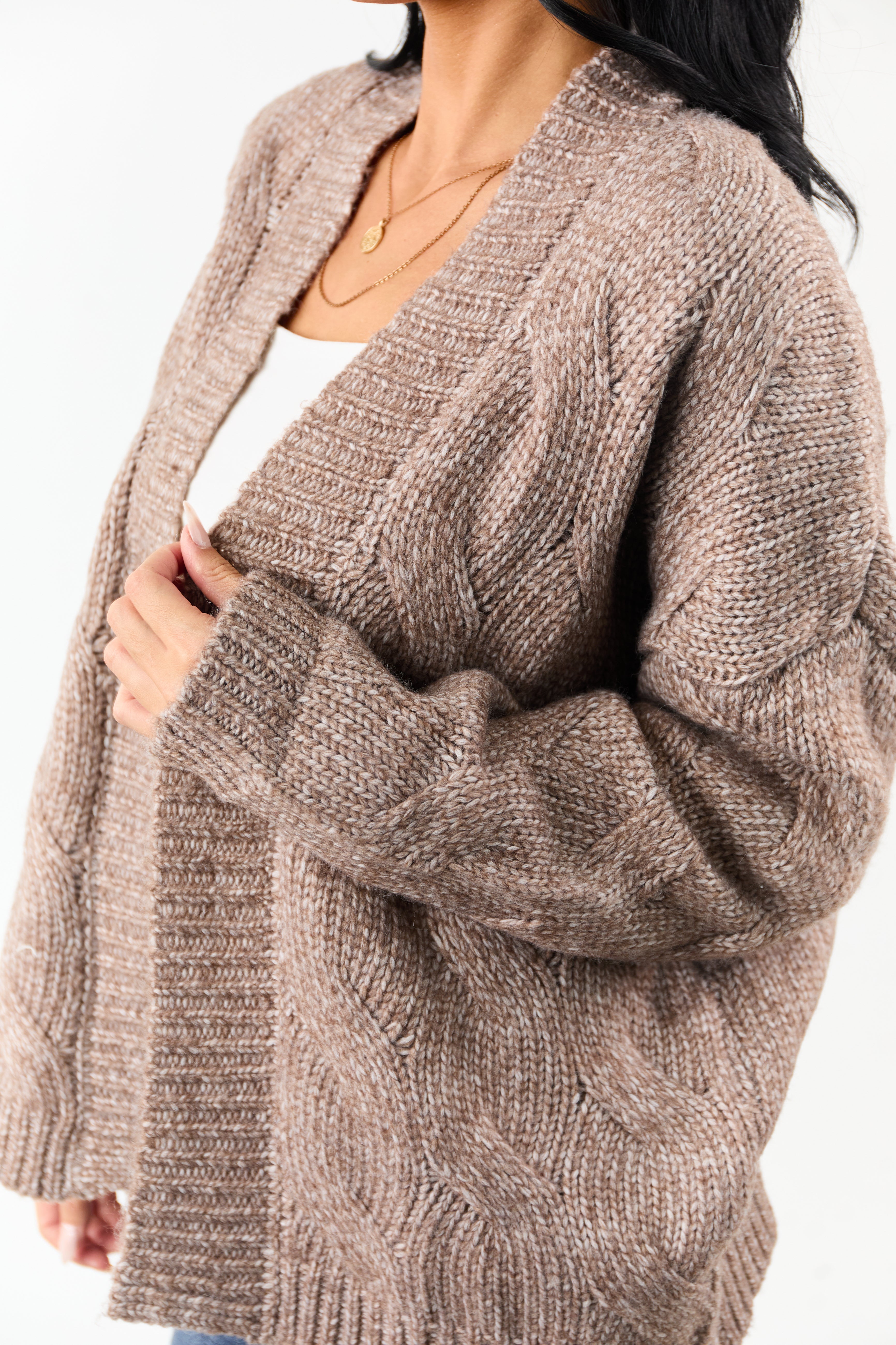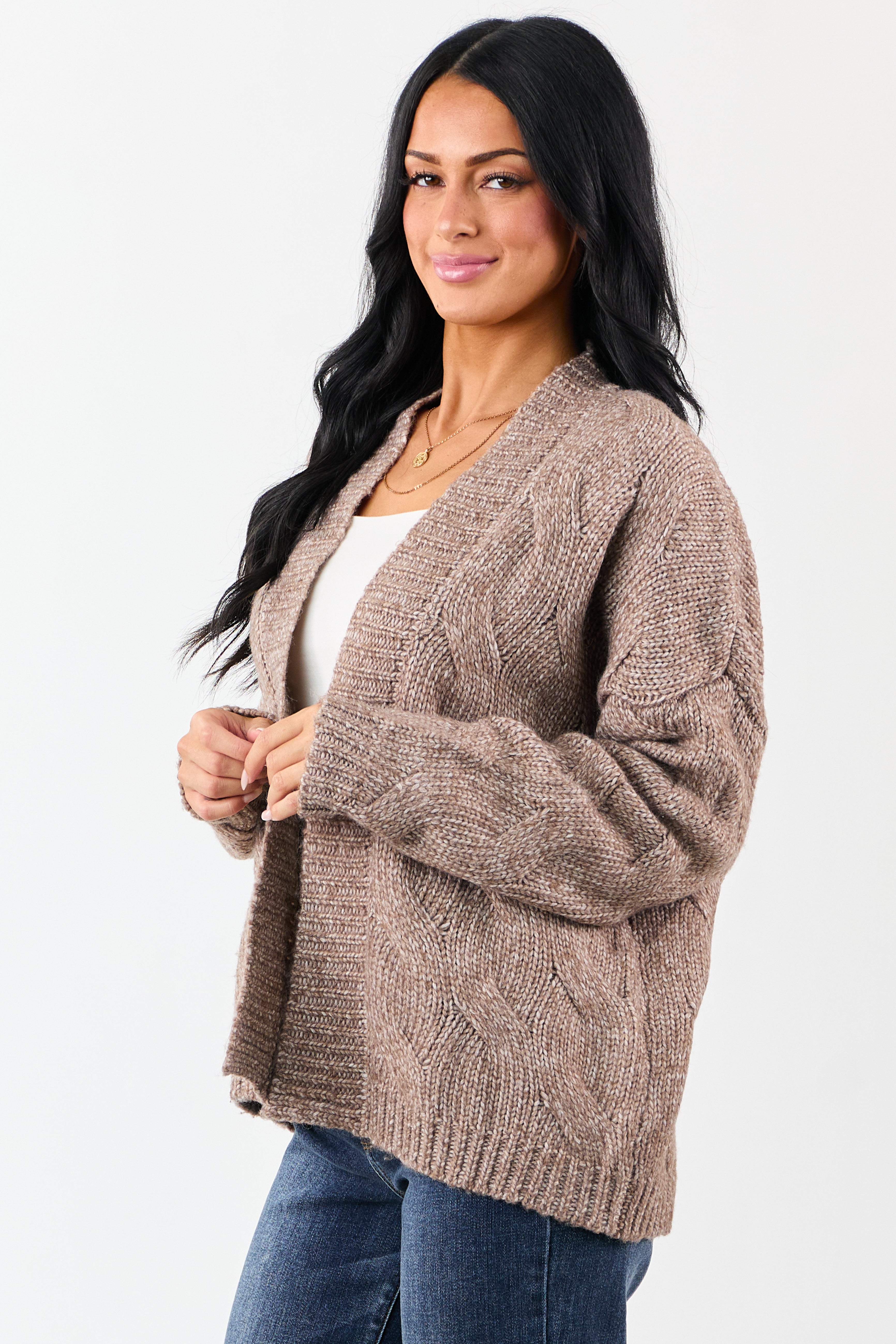 Indulge in the cozy warmth of our Brown Cable Knit Open Front Cardigan. Crafted from a luxurious blend of recycled polyester, polyester, and wool, this cardigan features a stretchy soft cable knit design with a drop shoulder and ribbed trim. Perfect for layering over jeans, dresses, or loungewear sets, its a versatile cold-weather essential that adds style and comfort to any outfit. Available in sizes S, M, and L.