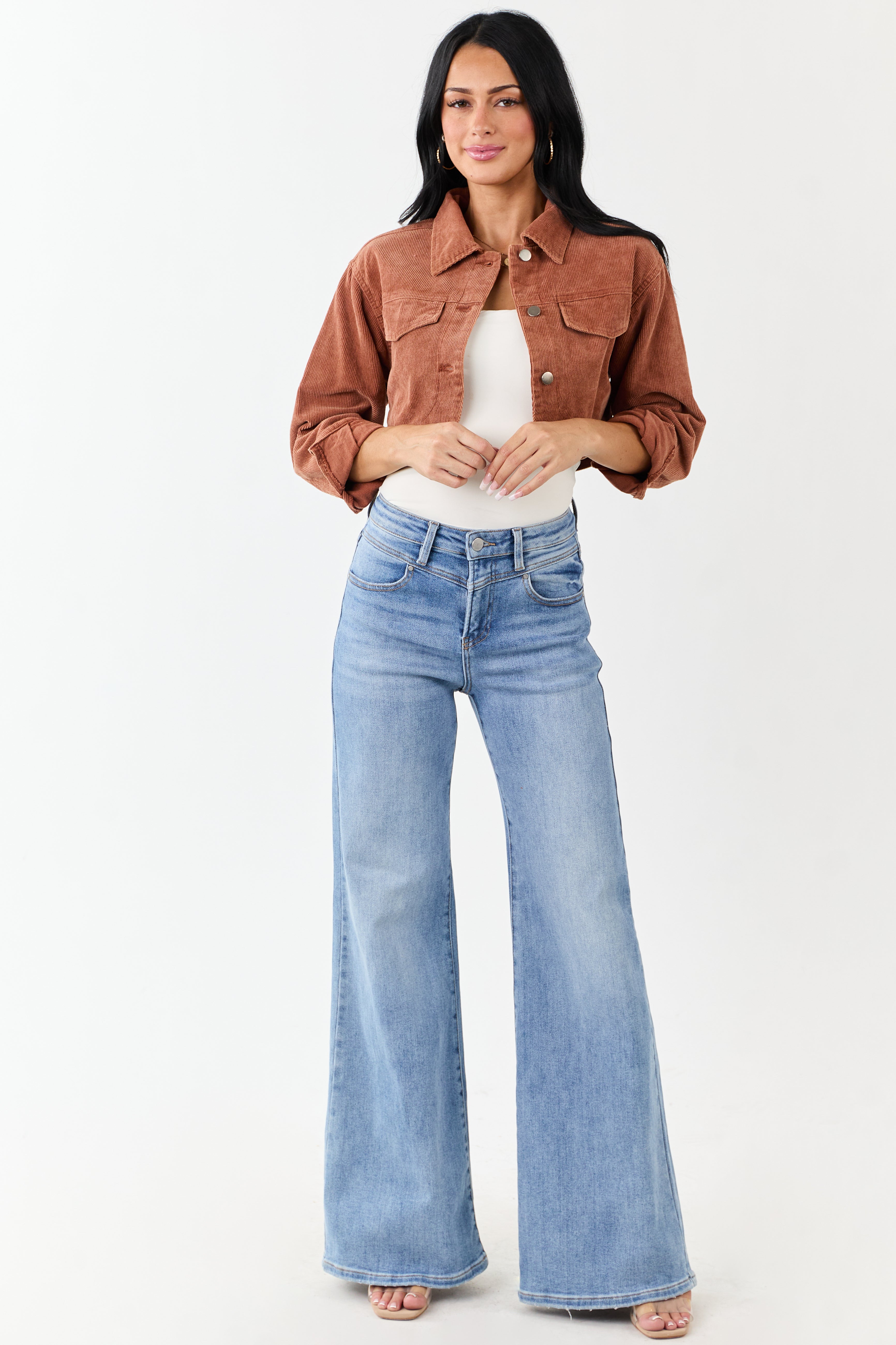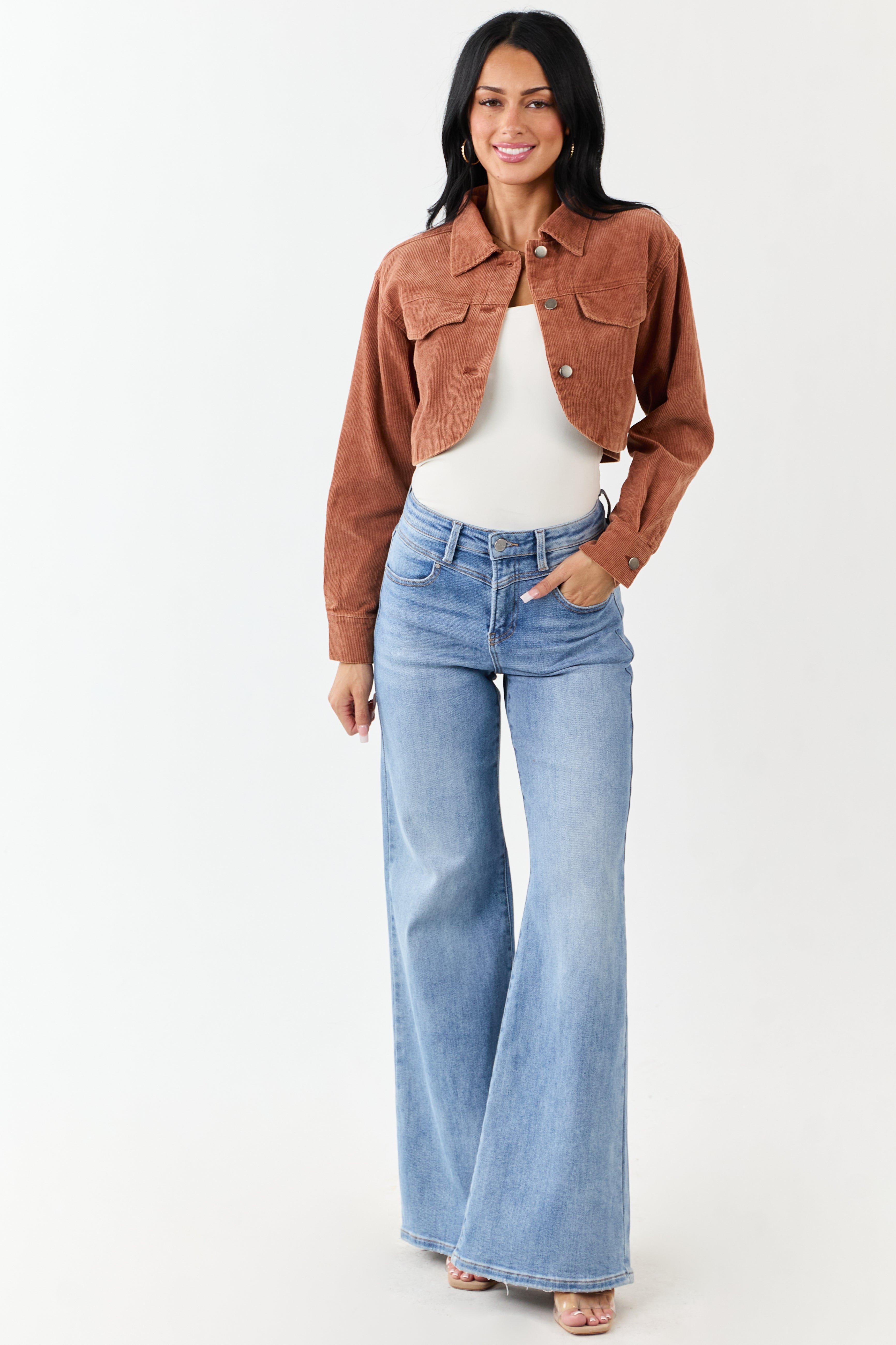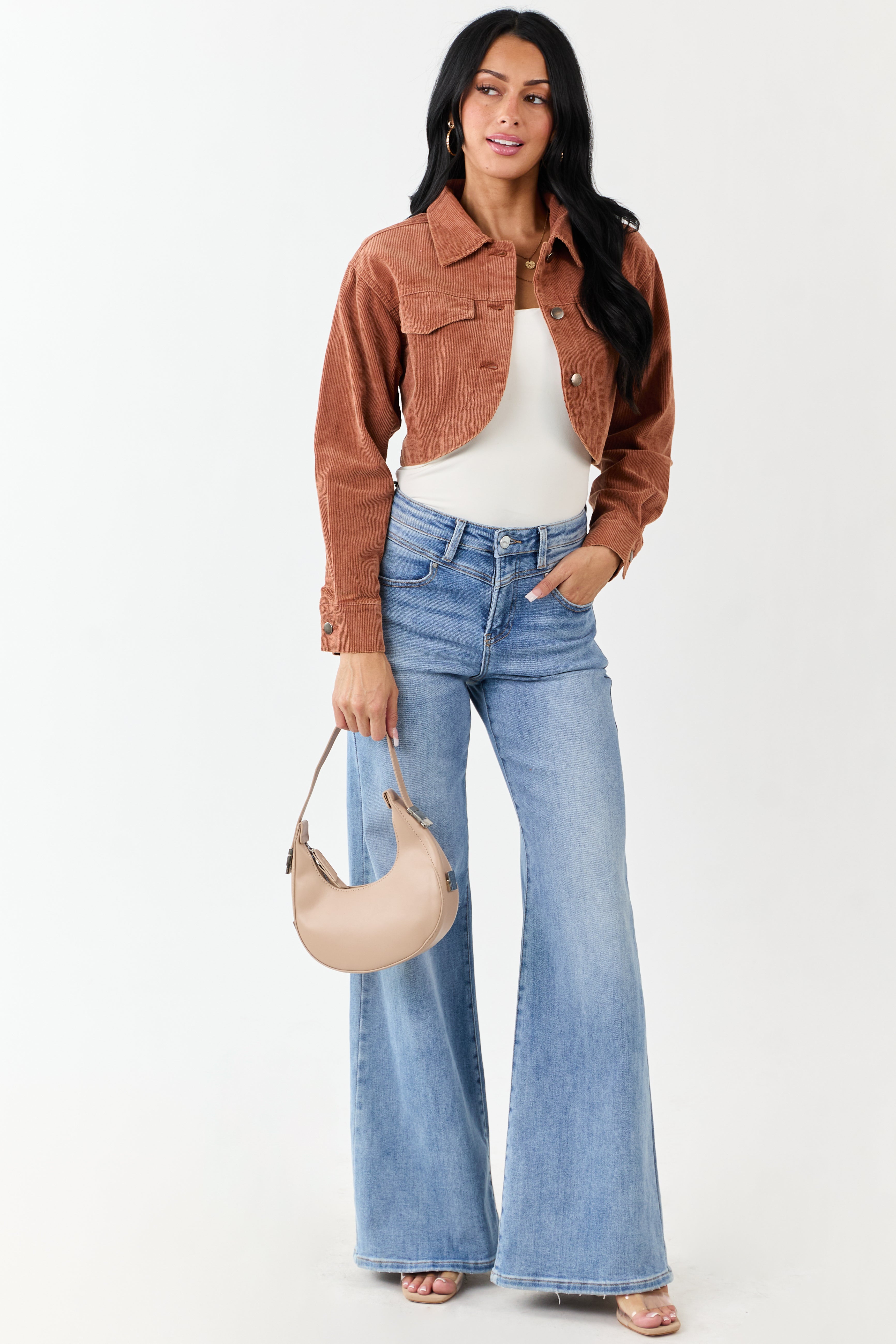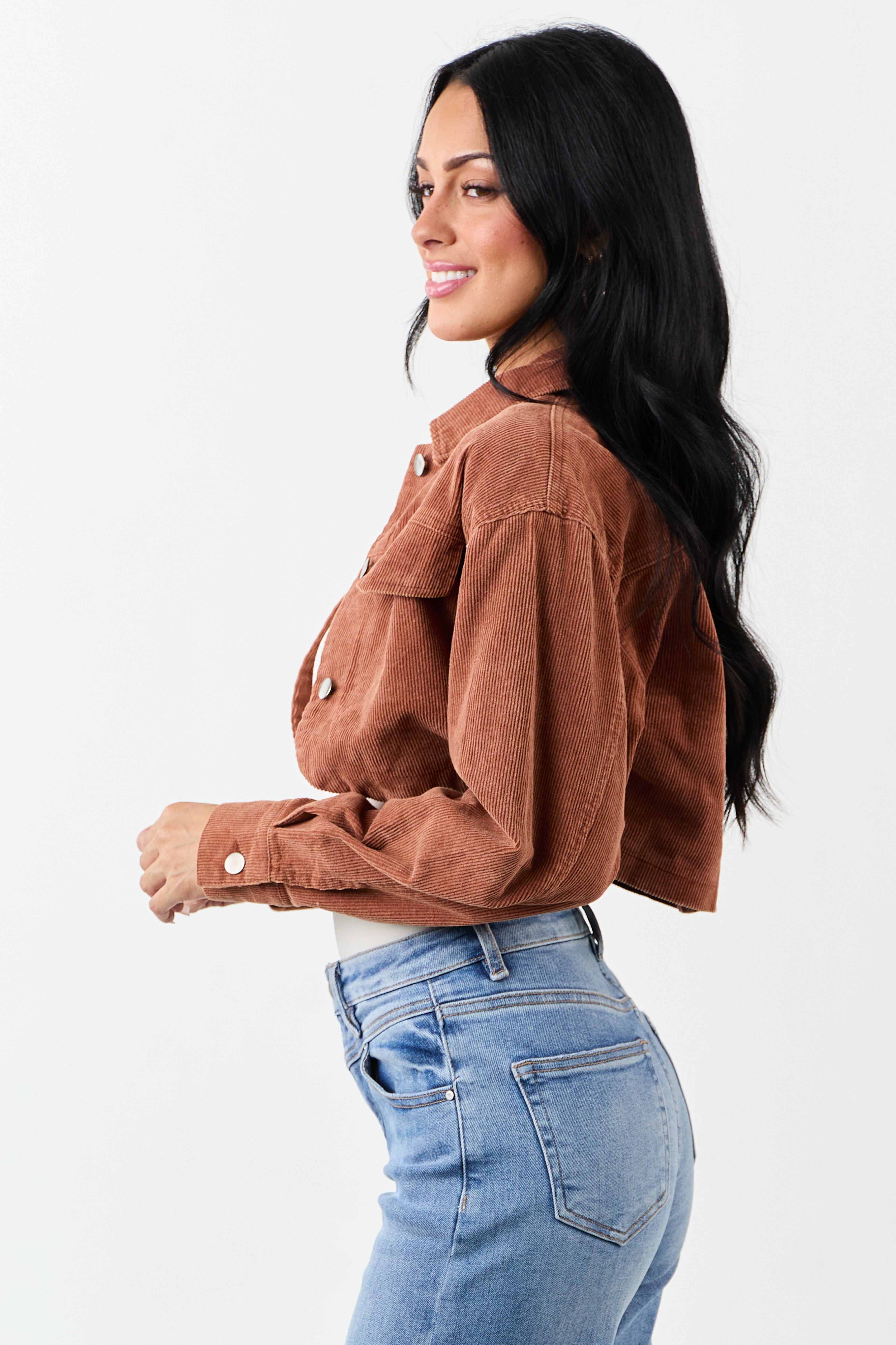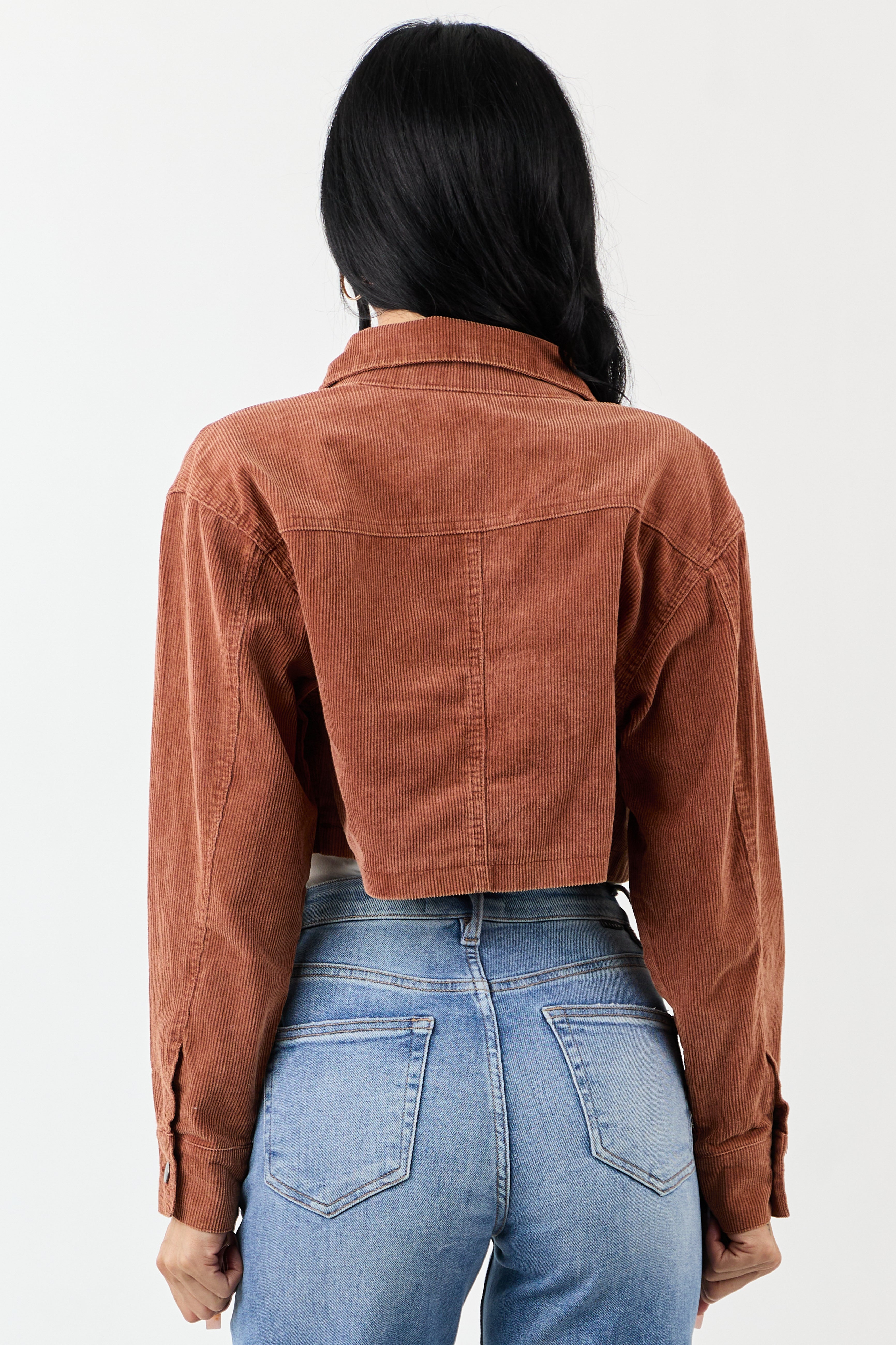 This stylish Corduroy Cropped Jacket in brown is a must-have for your wardrobe. Crafted from a blend of 75% Cotton and 25% Viscose, this non-stretchy jacket features banded button cuffs, faux chest pockets, a spread collar, and a rounded hemline. The cropped length flatters your waistline while adding vintage charm. Perfect for the fall season. Available in sizes S, M, and L.