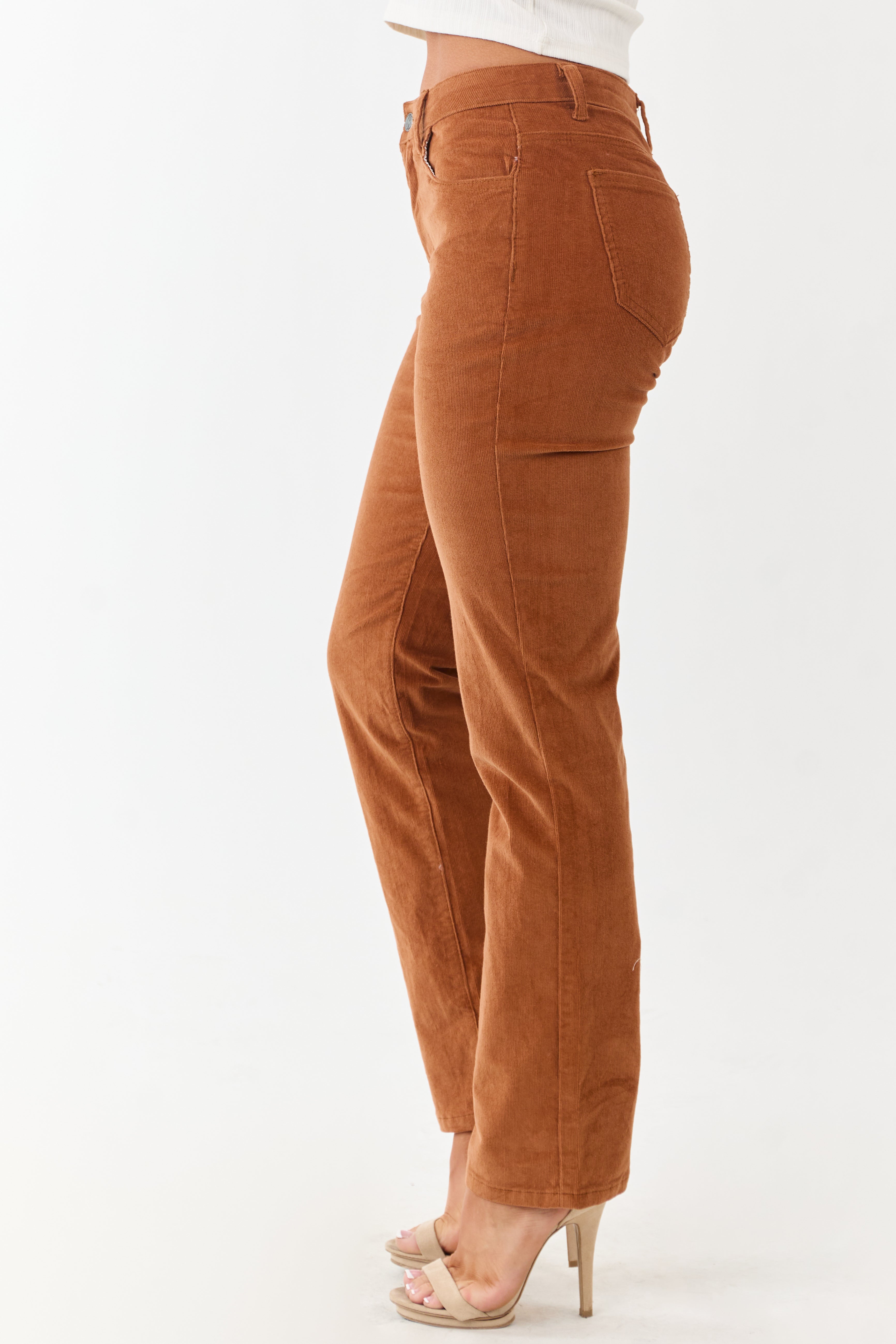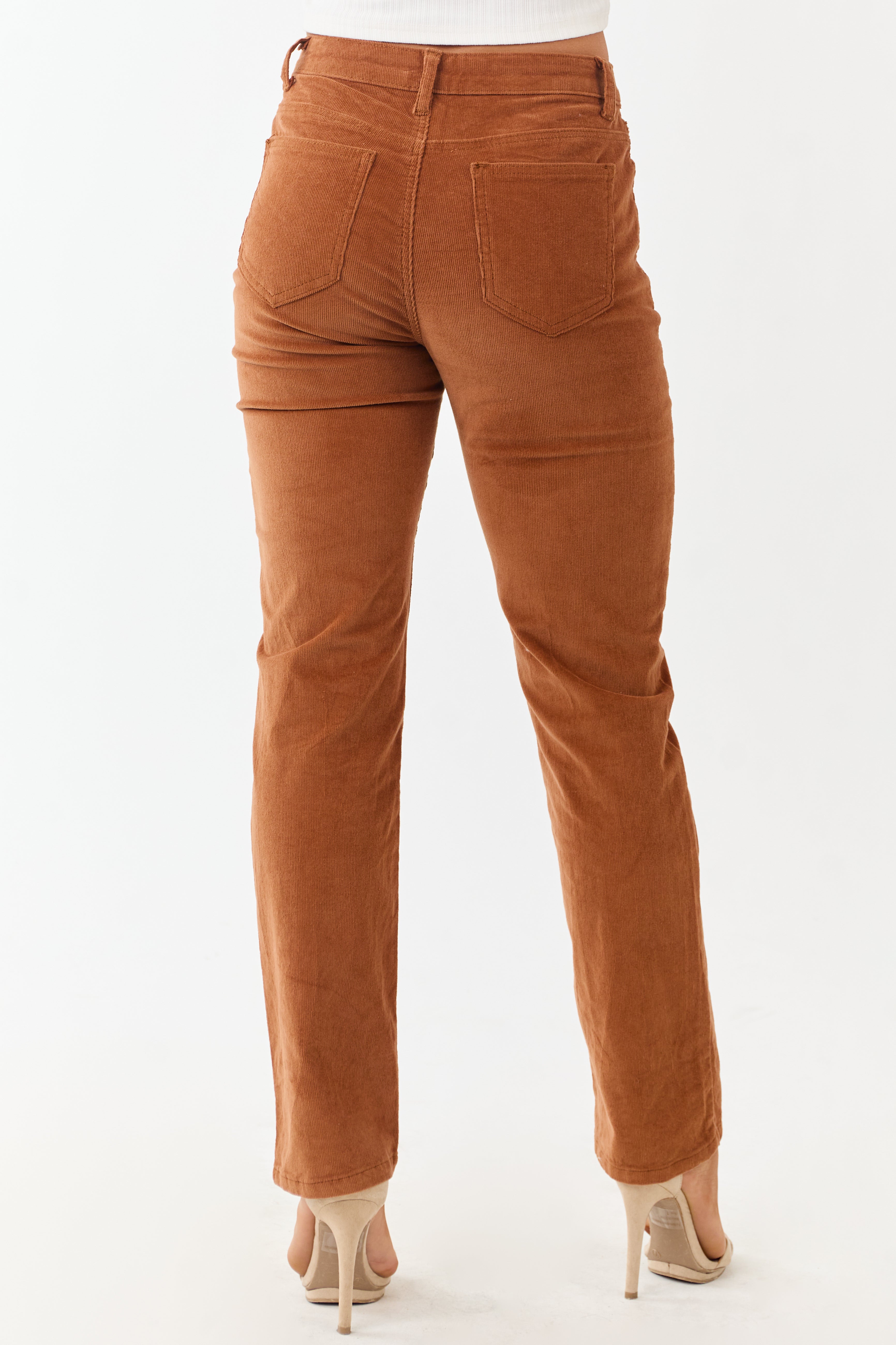 Elevate your style with these retro-inspired Brown Corduroy High Rise Straight Leg Pants . Made of semi-stretchy corduroy for comfort and style, these pants feature a forgiving waistband for up to 3″ extra space. Zipper fly, button closure, 5 pockets, and belt loops add functionality. Ideal for fall, the neutral warm tone complements any wardrobe. Crafted from 98% Cotton, 2% Spandex for a perfect fit, these pants have a 30″ inseam. Model is 57″ and wears a size 1.