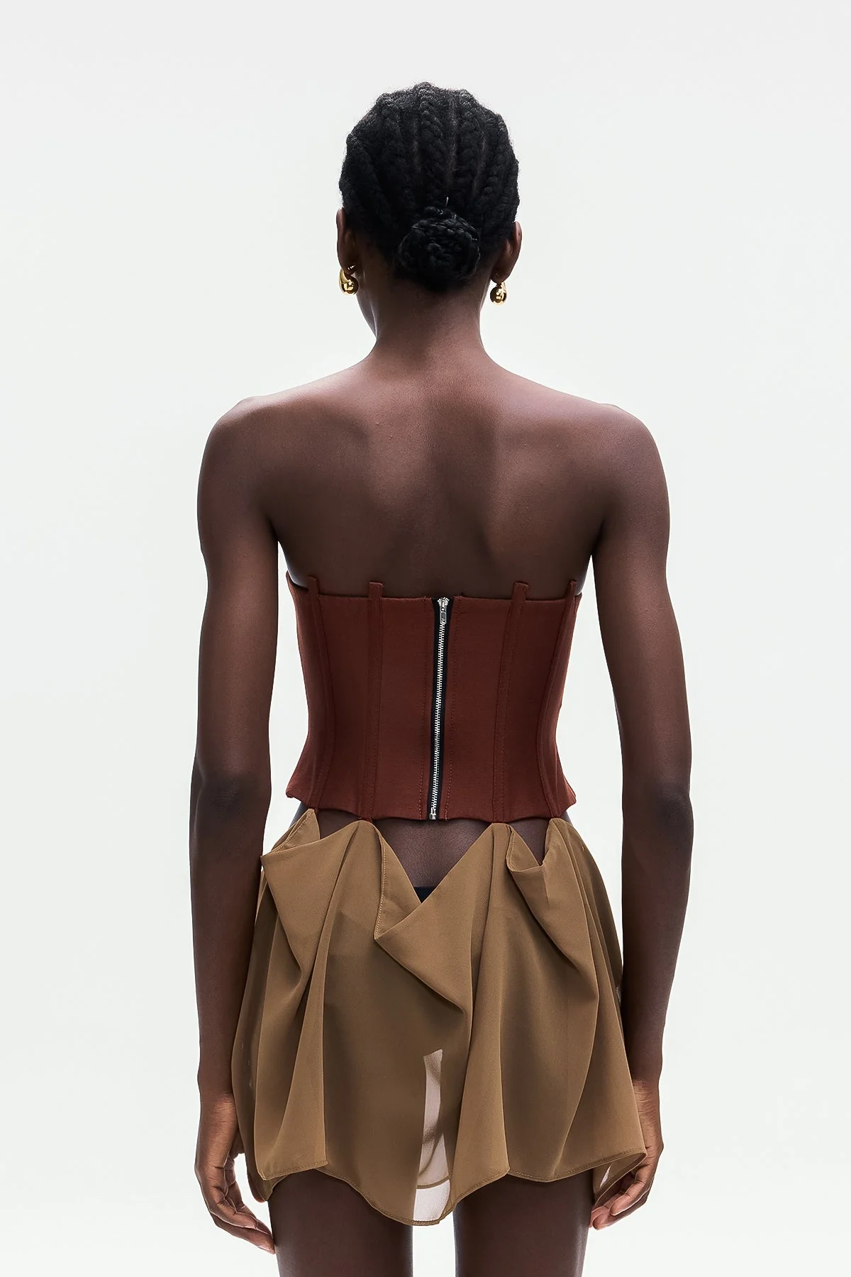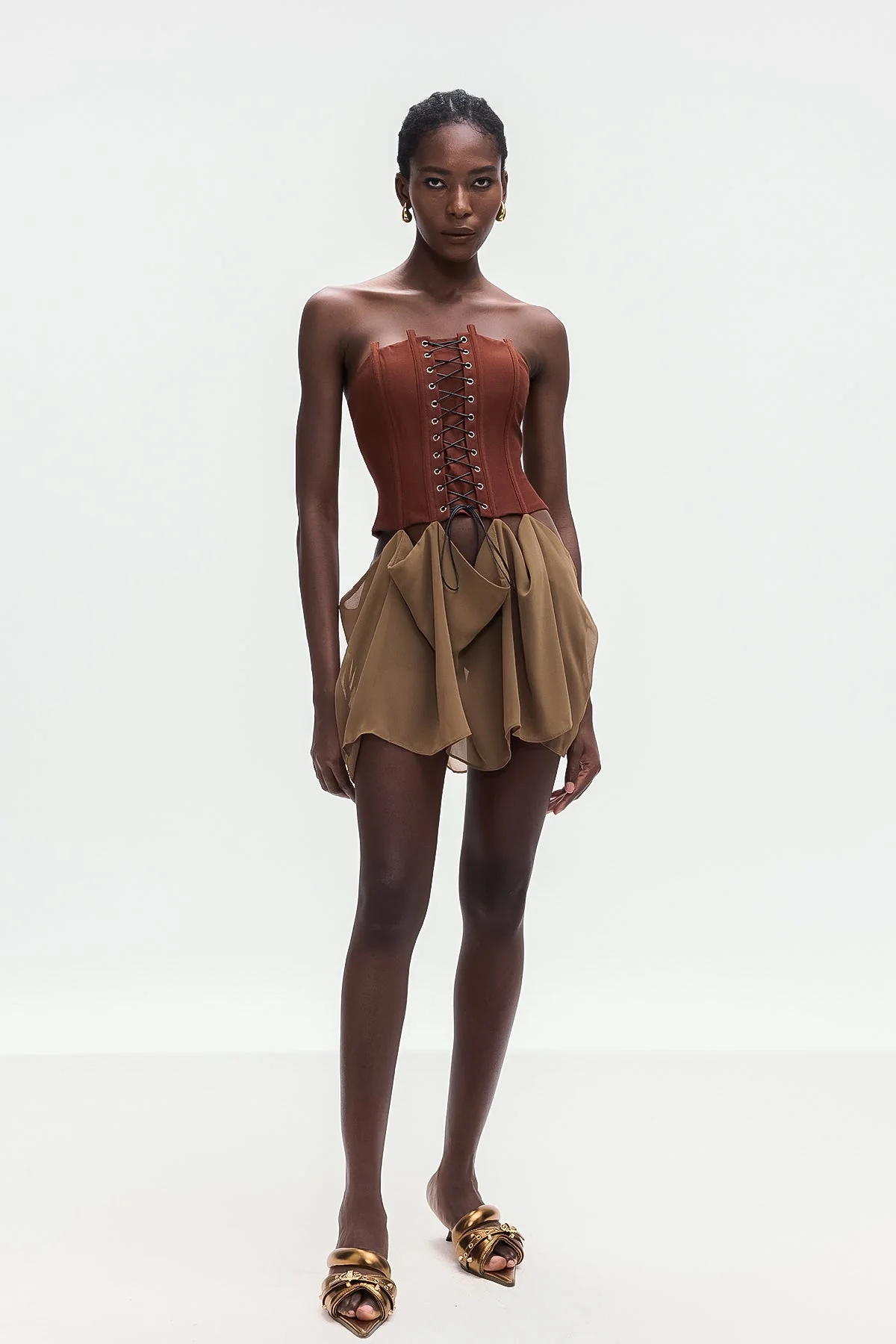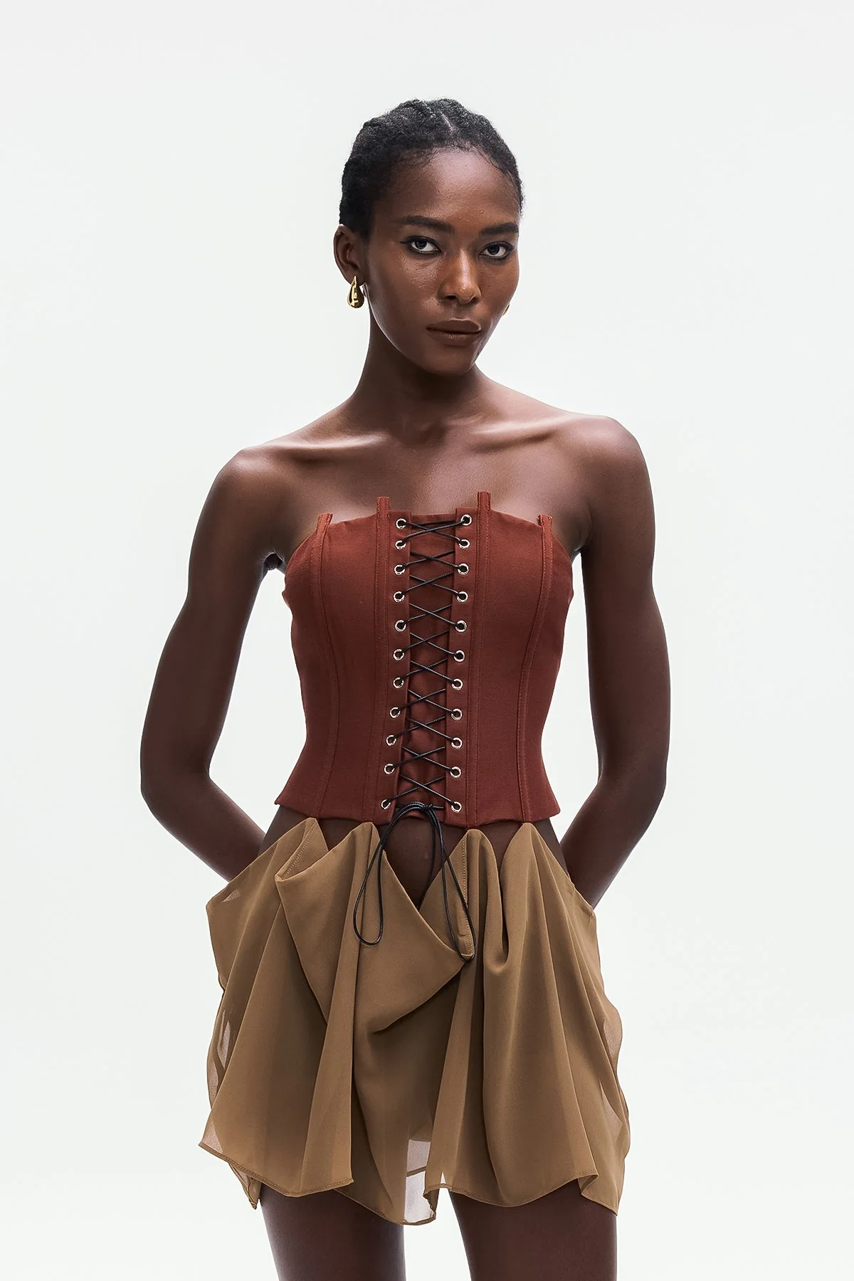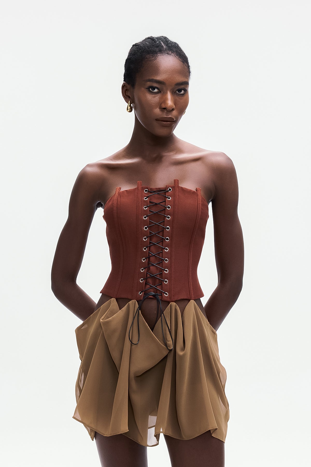 Elevate your style with the Brown Corset Lace-Up Mini Dress . This dress combines elegant design with a flattering silhouette, featuring a structured corset bodice with adjustable lace-up detailing that provides support while accentuating your waist. The strapless cut highlights your shoulders and neckline, making it perfect for formal events or stylish evenings out. Achieve a look that balances sophistication and allure effortlessly. Crafted for confidence, this mini dress is a versatile addition to your wardrobe. The non-stretch fabric requires gentle machine wash. Please note, color may vary due to lighting in images.