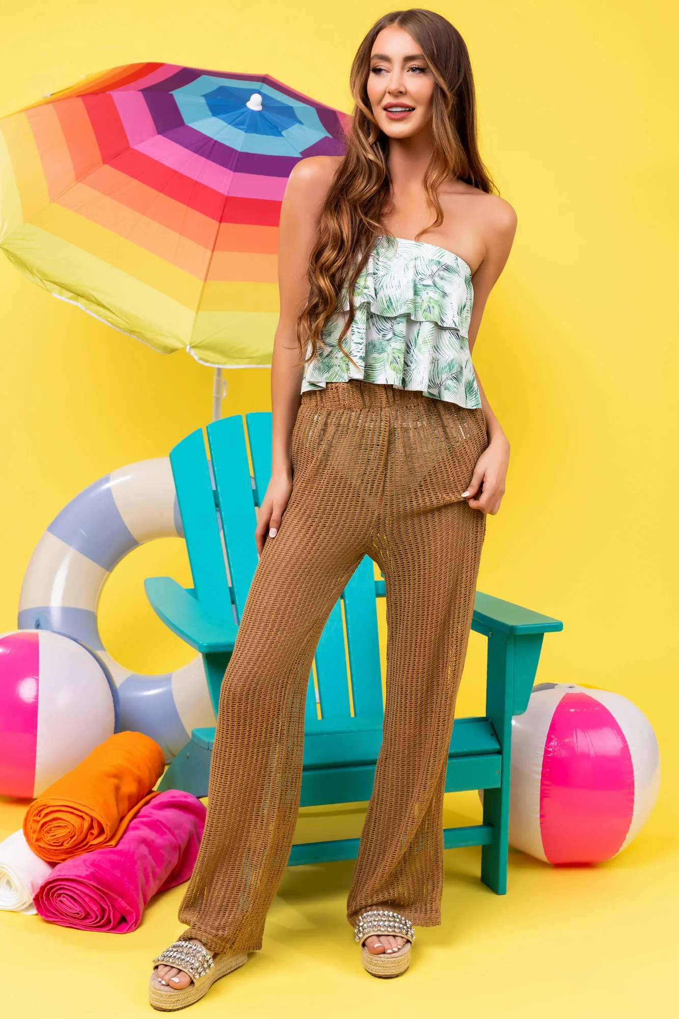 These loose crochet net pants + Sky are the perfect addition to your beachwear collection. Made of 100% polyester, these high-waisted pants feature a non-stretchy elastic waistband for a comfortable fit. Ideal for swim cover-ups, these pants are unlined and imported. Available in sizes S, M, and L (equivalent to 2-4, 6-8, and 10-12). The waist measurements range from 27 inches to 46 inches, ensuring a true-to-size fit. With a 32-inch inseam, these pants offer a stylish and breezy look. For care instructions, hand wash them in cold water separately to prevent color bleeding, avoid bleach, and hang to dry. Model is wearing a size Small and has the following measurements: Size 2, Height 58, Bust 32, Waist 25.
