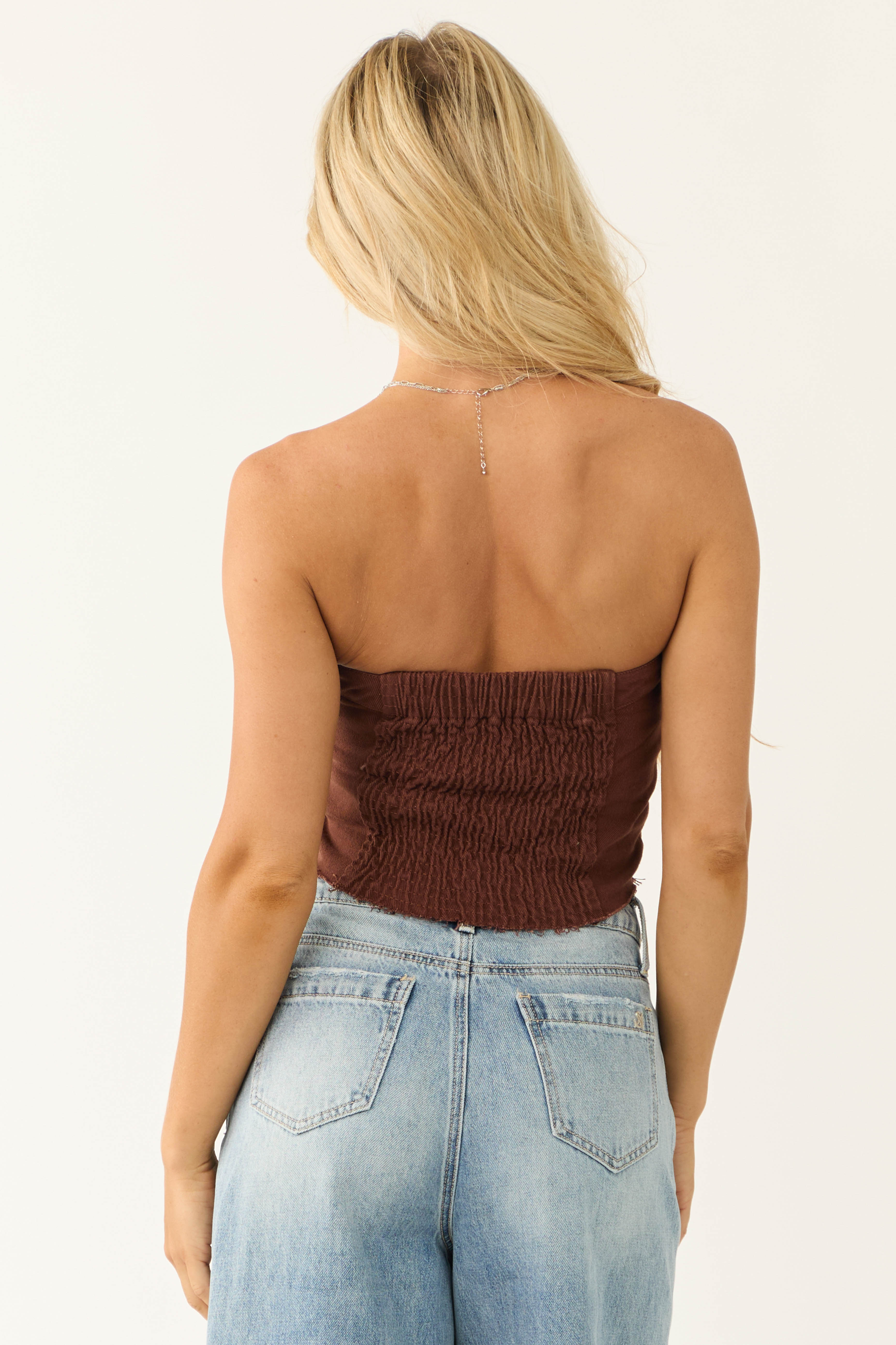 Embrace casual chic with our Brown Denim Smocked Back Tank Top. Crafted from non-stretchy denim, this top features two chest pockets with button closure, corset seam details, and a raw hem for added flair. The smocked back offers a comfortable fit and extra room to move while maintaining a stylish silhouette. Made of 100% cotton, this unlined top exudes quality and versatility. Perfect for summer days or fall layering, pair it with your favorite bottoms for a trendy look. Available in sizes S, M, and L.