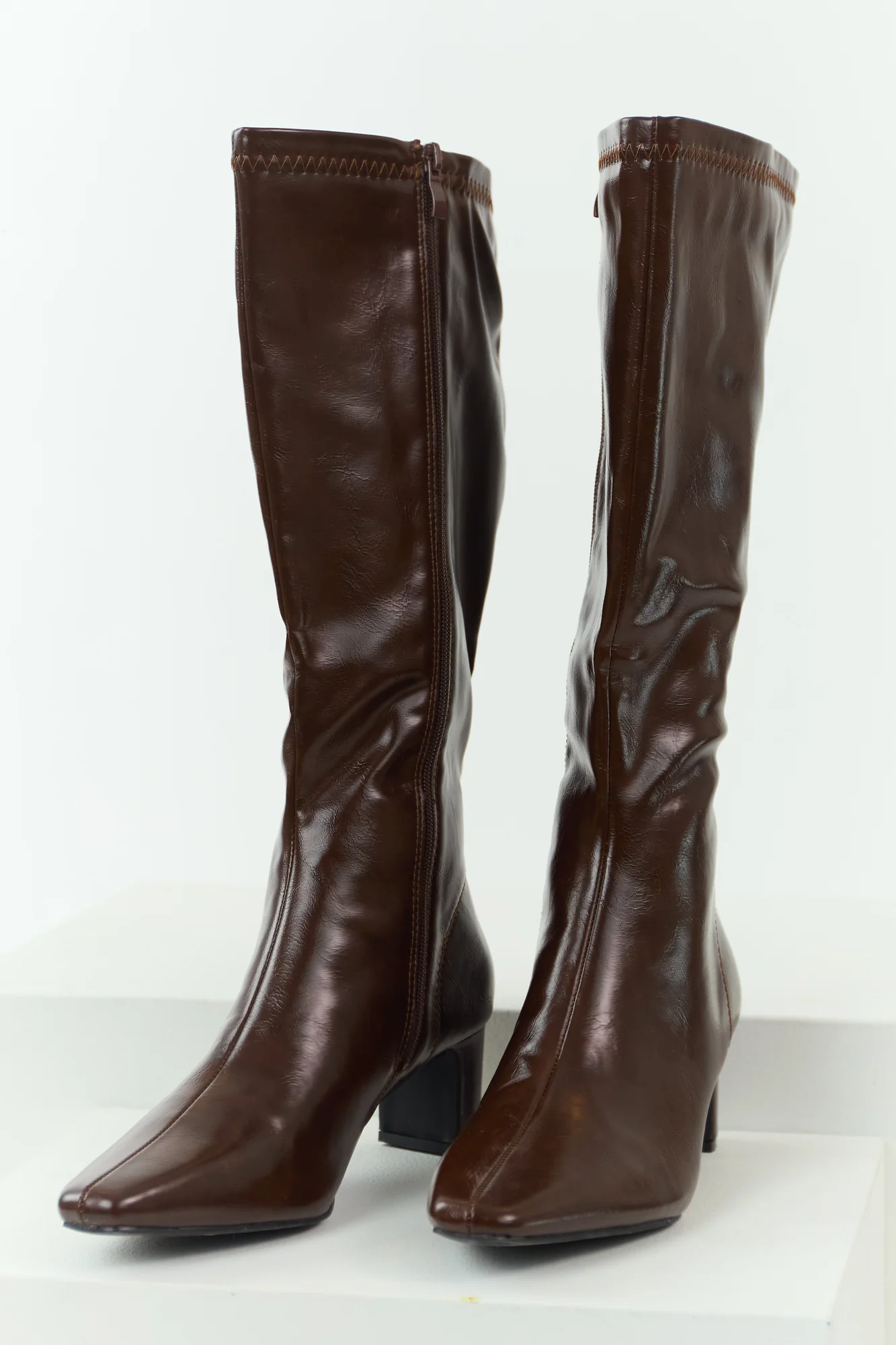 Elevate your look with these chic brown faux leather tall boots featuring a sleek pointed toe and a stable block heel. From casual denim to upscale night-out ensembles, these non-stretchy boots add a bold and polished edge. The side zipper ensures easy wear, while the 16″ shaft and 2.25″ heel offer both style and comfort. Imported and measured on size 8 for the perfect fit.