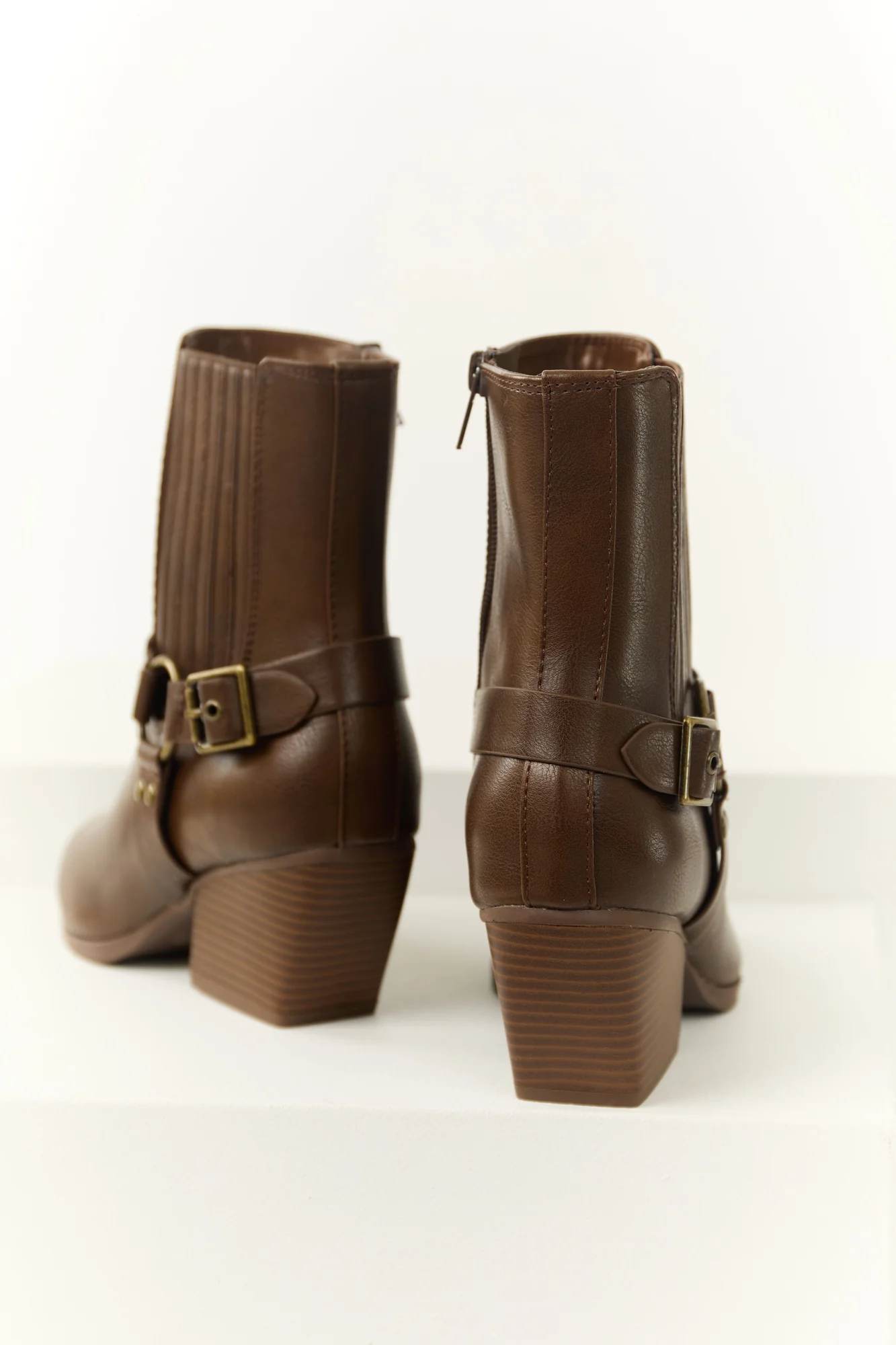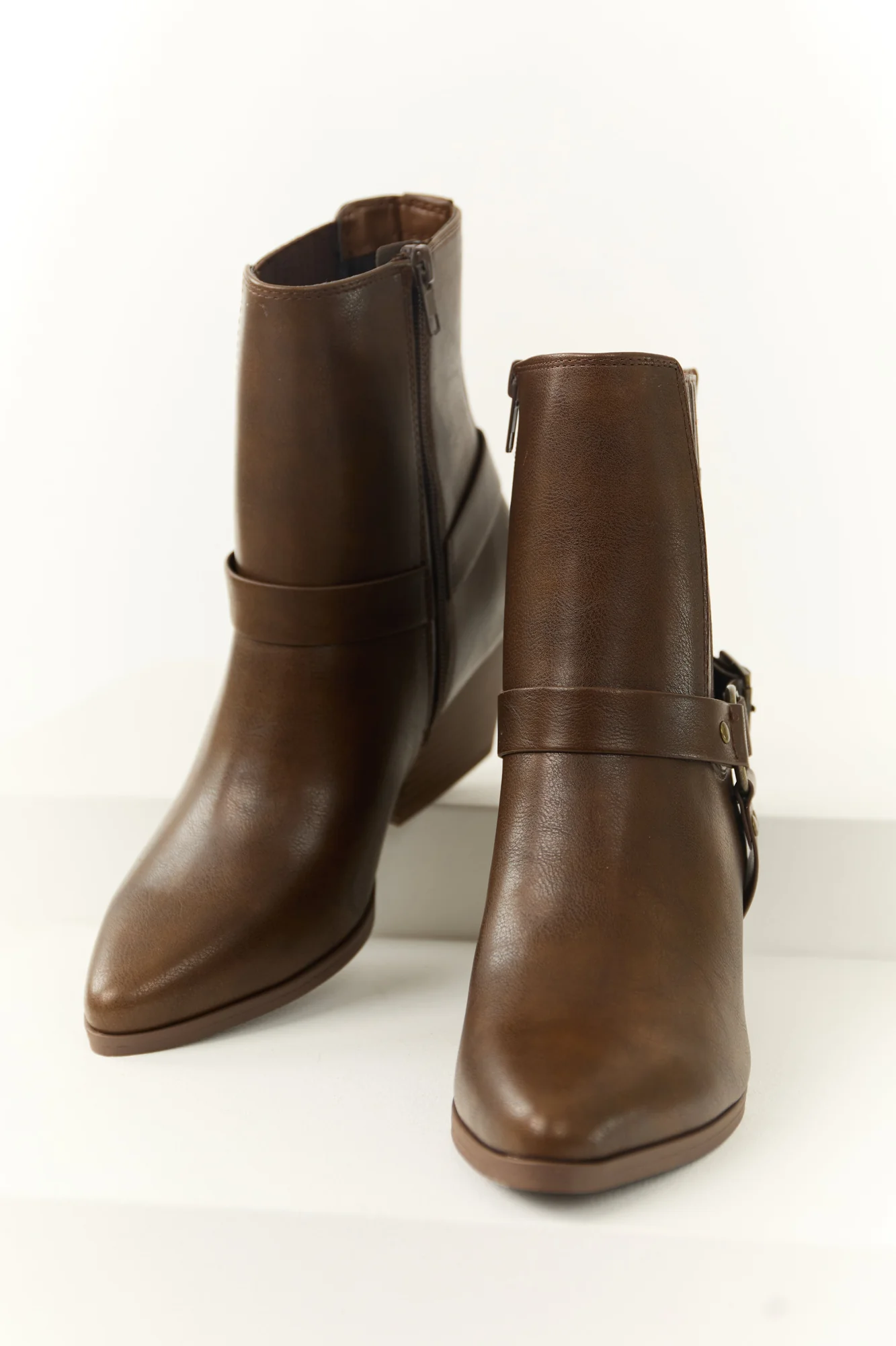 Step up your style with these chic brown faux leather ankle booties. Featuring antiqued gold metal strap details, an adjustable ankle strap, elastic side ankle details, and a block heel for all-day comfort. Complete with a pointed closed toe, side zipper, and rubber sole. The lightly cushioned insole ensures support and durability. Shaft Height: 7.5. Circumference: 11. Heel Height: 2.5. Step out in confidence with these imported ankle booties that are true to size.