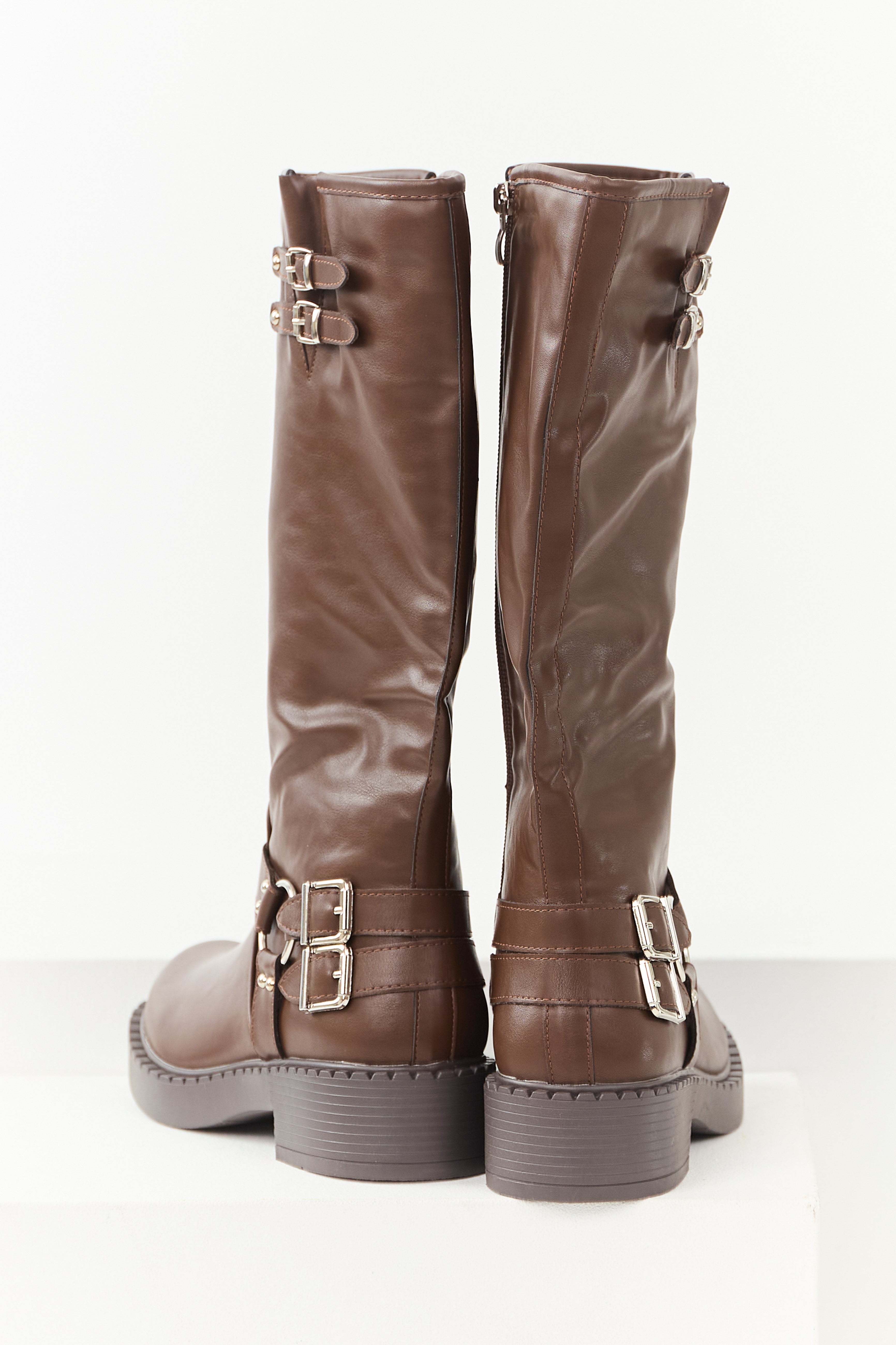 Elevate your style with these luxurious faux leather tall boots designed with chic buckle accents for a modern edge. Crafted from non-stretchy faux leather, featuring a side zipper, rounded toe, and a moderate heel height of 2 inches with a 1-inch platform for added comfort. Imported and available in size 8.