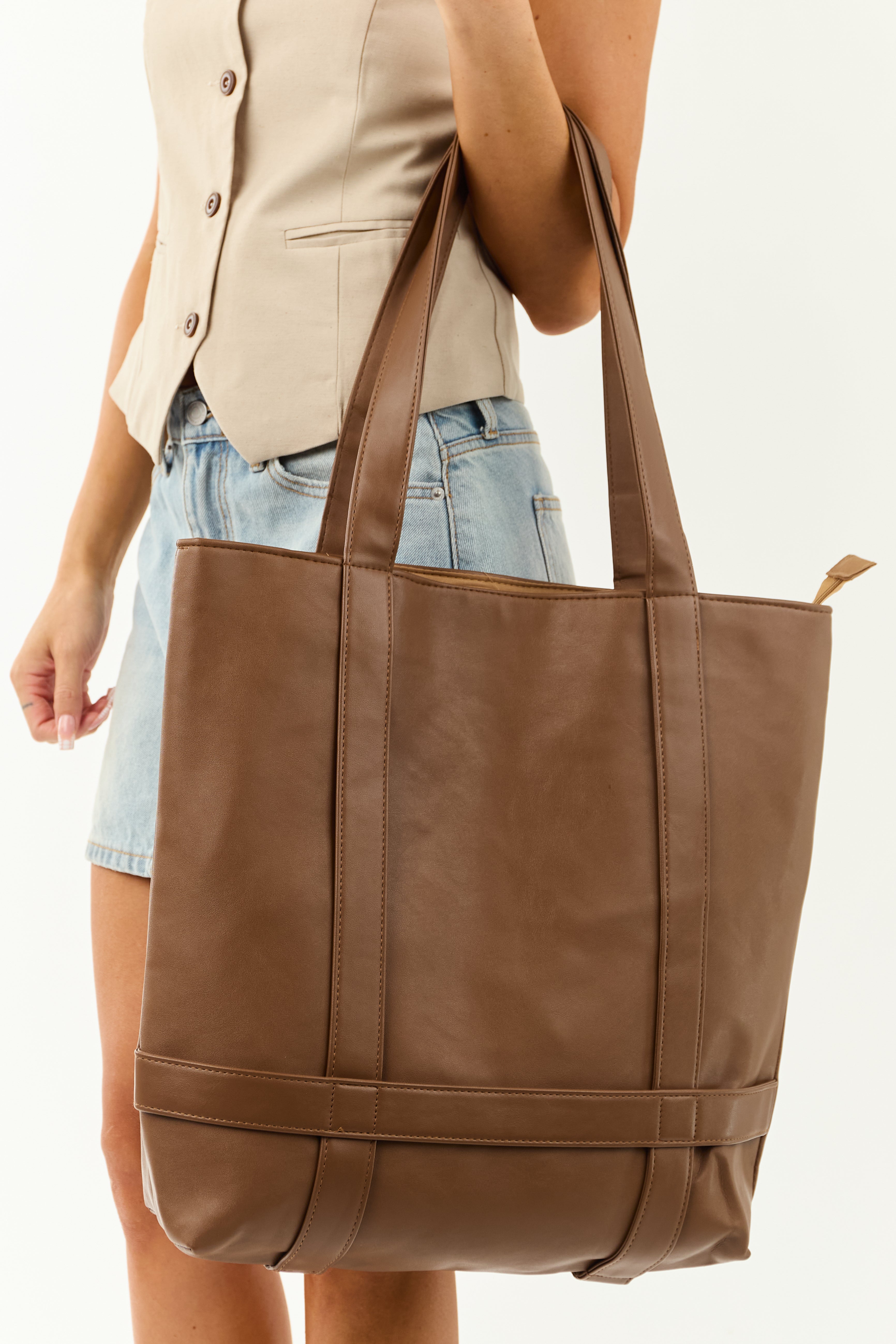 Upgrade your accessory collection with this stylish Cognac-colored faux leather tote bag. Featuring an inner pocket, zipper closure, and a spacious design, this bag is perfect for everyday use. The tote is lined for durability and measures 18″ in height, 19″ in width, with a convenient 12″ handle drop. Crafted from 90% PU and 10% Polyester, this imported bag offers both style and functionality.