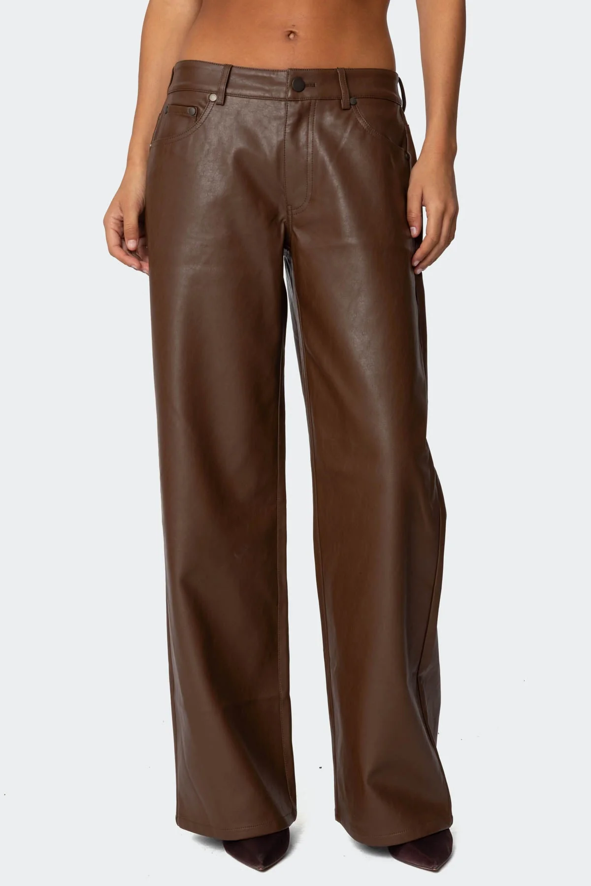 Indulge in the chic appeal of our Brown Faux Leather Pants. Made from durable polyurethane and cotton blend, these pants offer a loose fit for a comfortable yet fashionable silhouette. The machine-washable design ensures easy care. Elevate your wardrobe with these stylish bottoms that pair perfectly with a variety of tops for versatile outfit options.