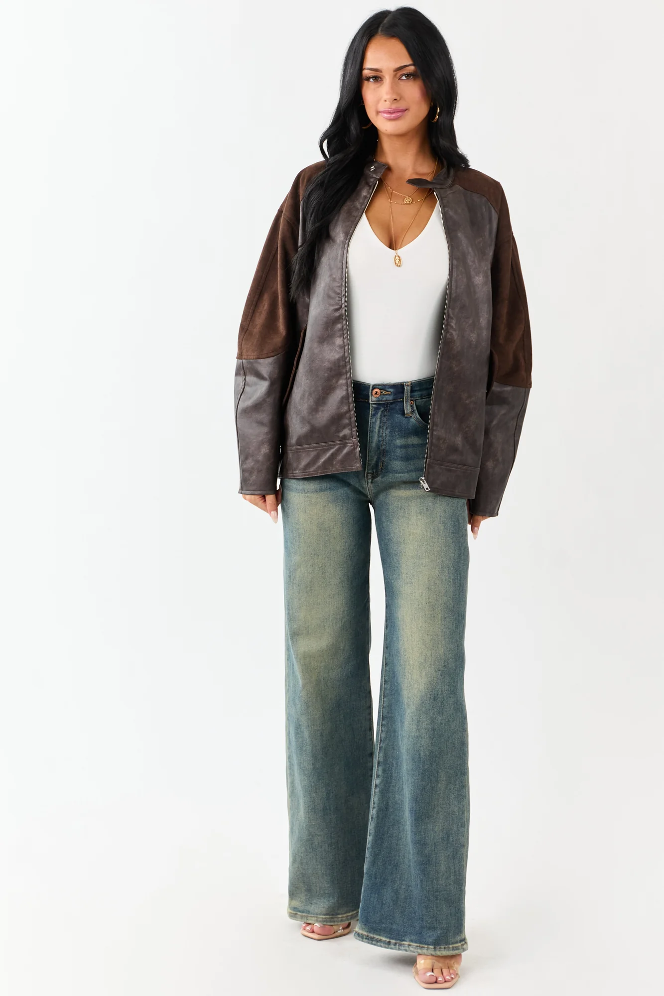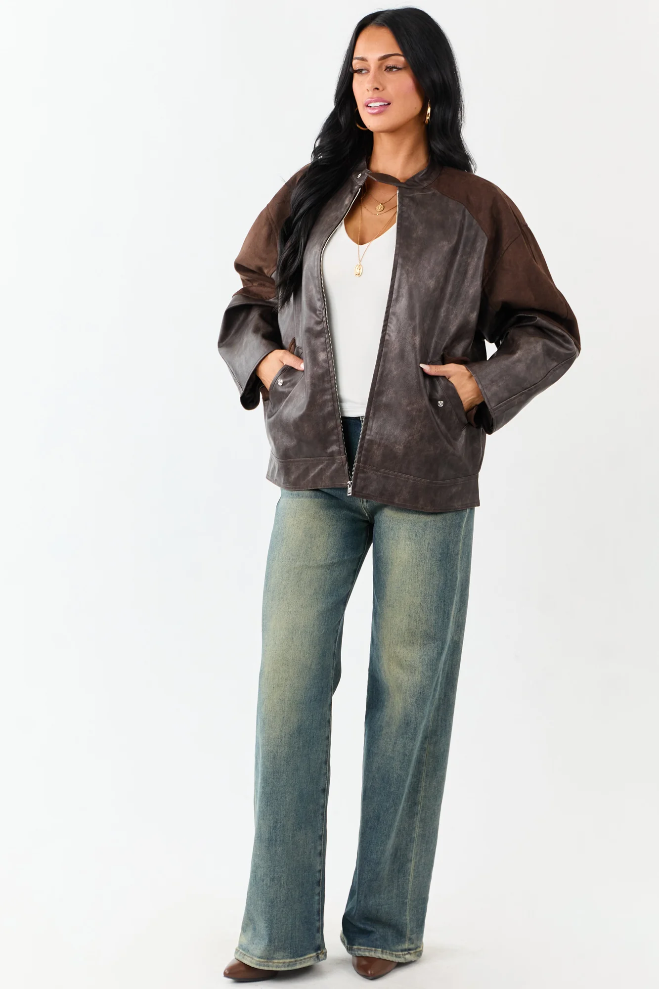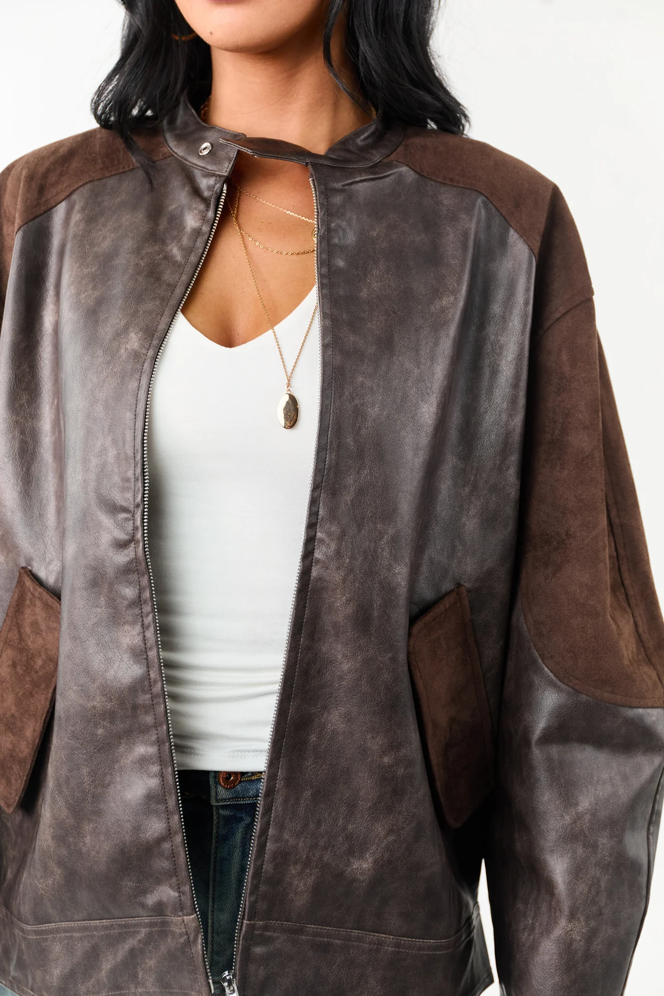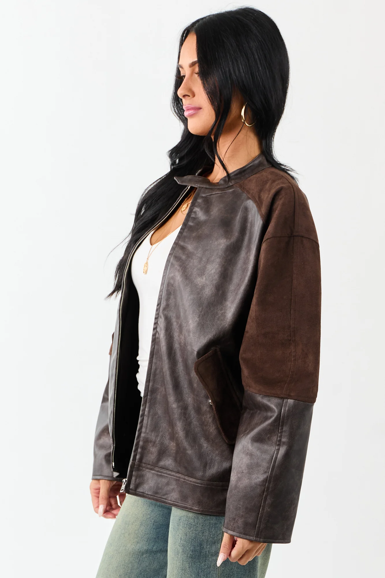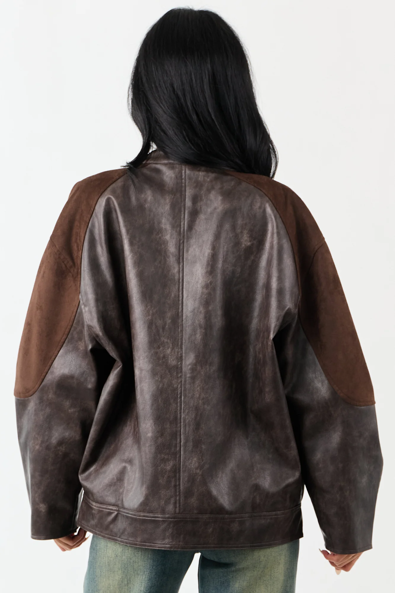 Elevate your outerwear collection with this stylish brown faux leather jacket featuring faux suede contrast panels, oversized fit, non-stretchy material, barrel sleeves, collar with button closure, and side pockets. Stay cozy with this cozy piece lined with 95% polyester and 5% spandex. The imported jacket offers a sleek zip-up front design and is perfect for fall and winter seasons. Available in sizes S, M, and L.