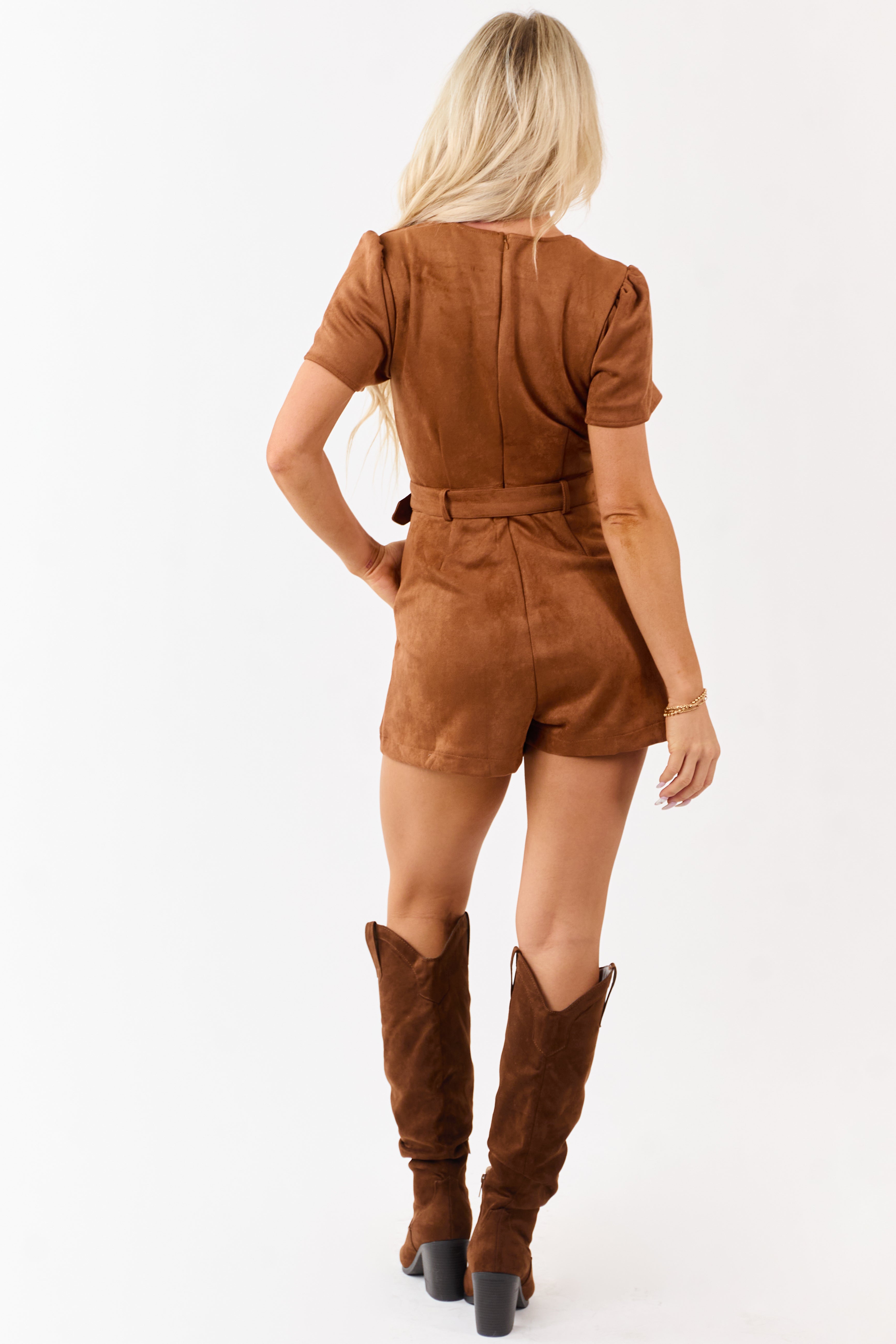 Discover the perfect one-piece outfit with our Brown Faux Suede Belted Romper Dress. Crafted from semi-stretchy faux suede, this romper features a belted waist, hidden back zipper, side pockets, and a flattering figure. Embrace comfort and style effortlessly!