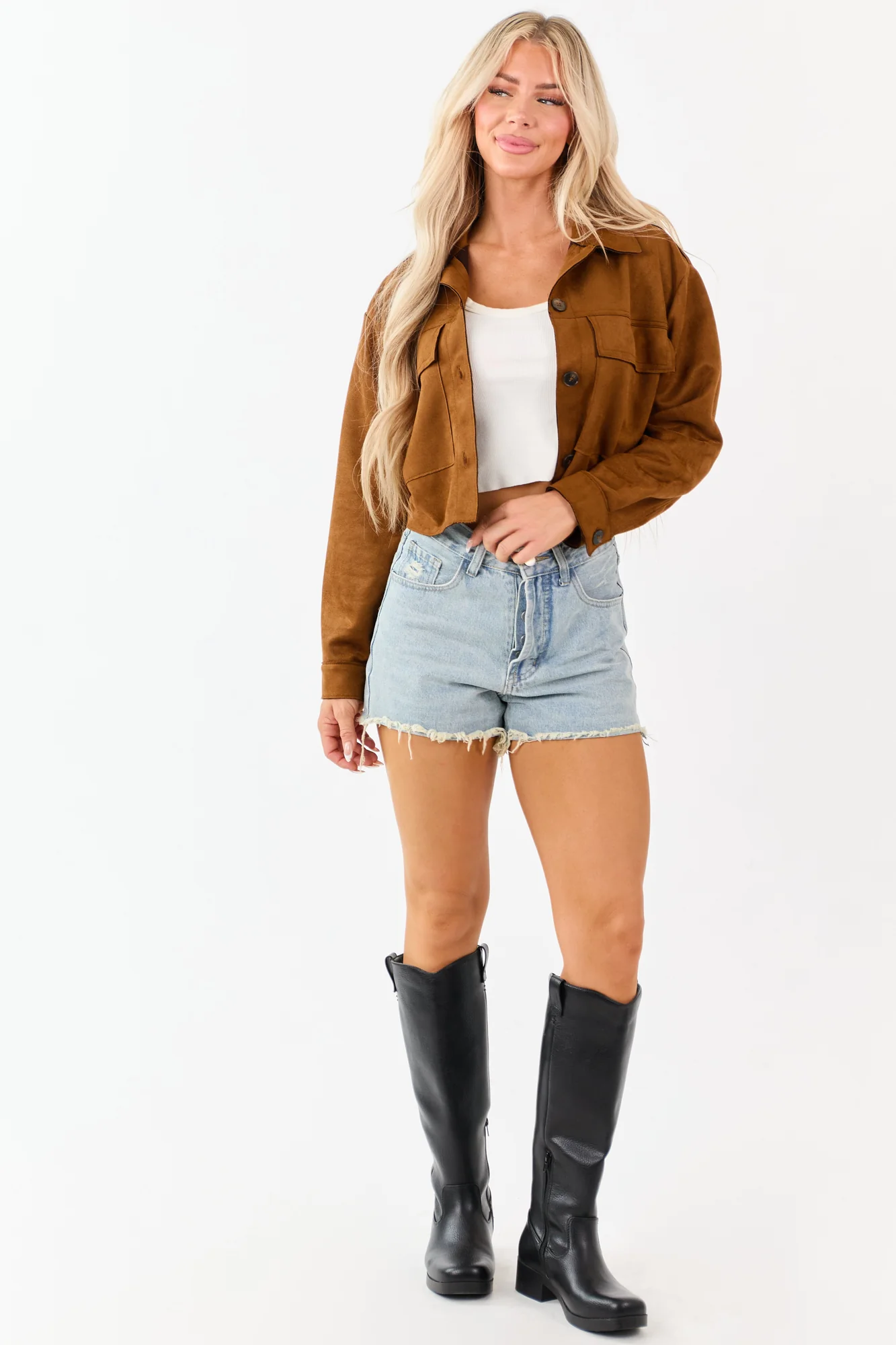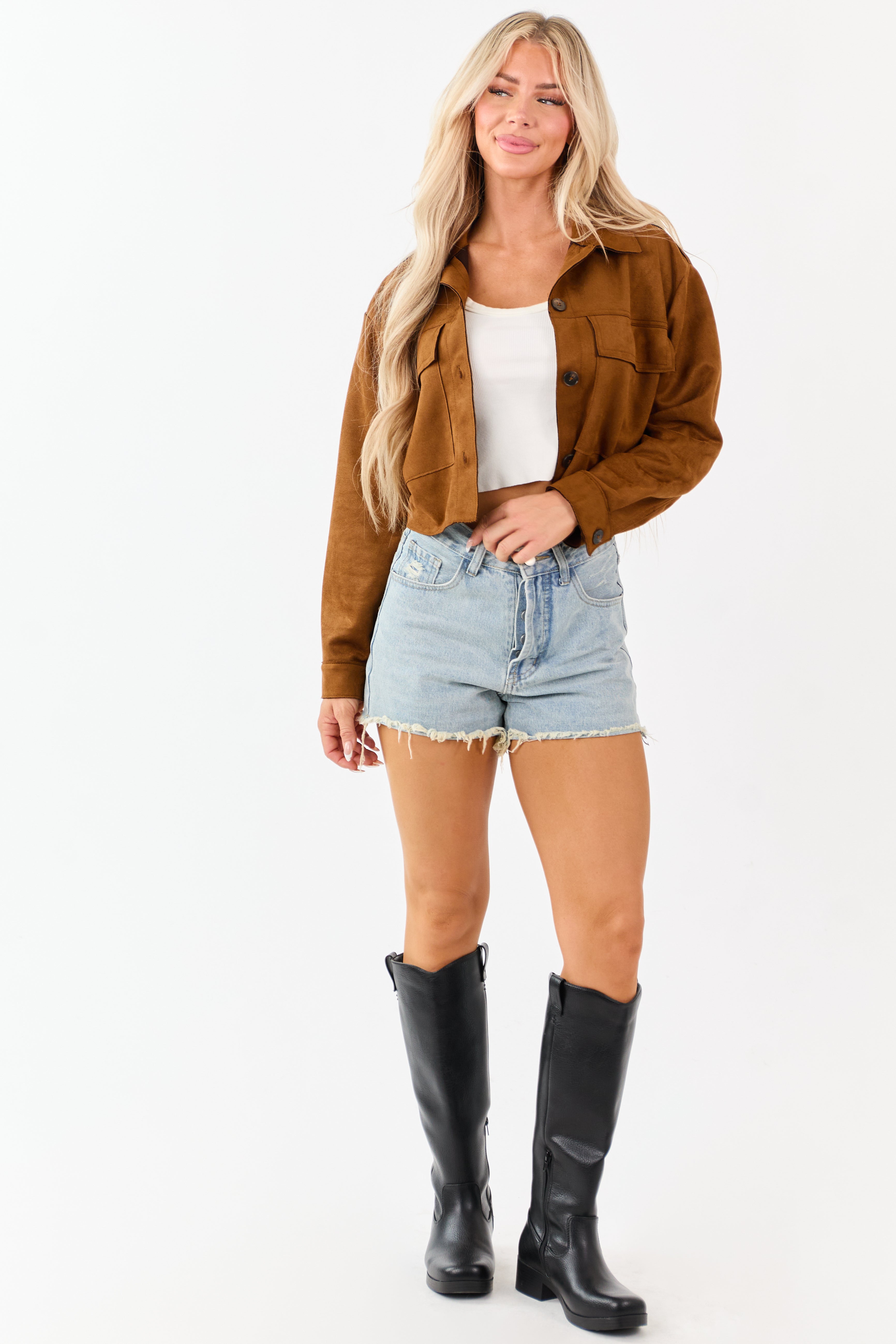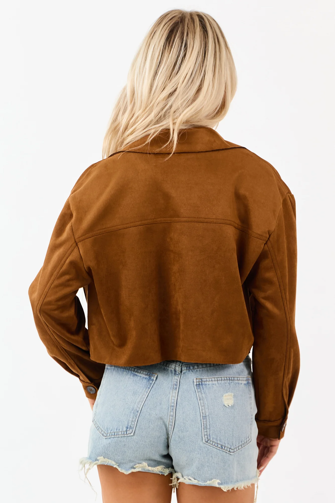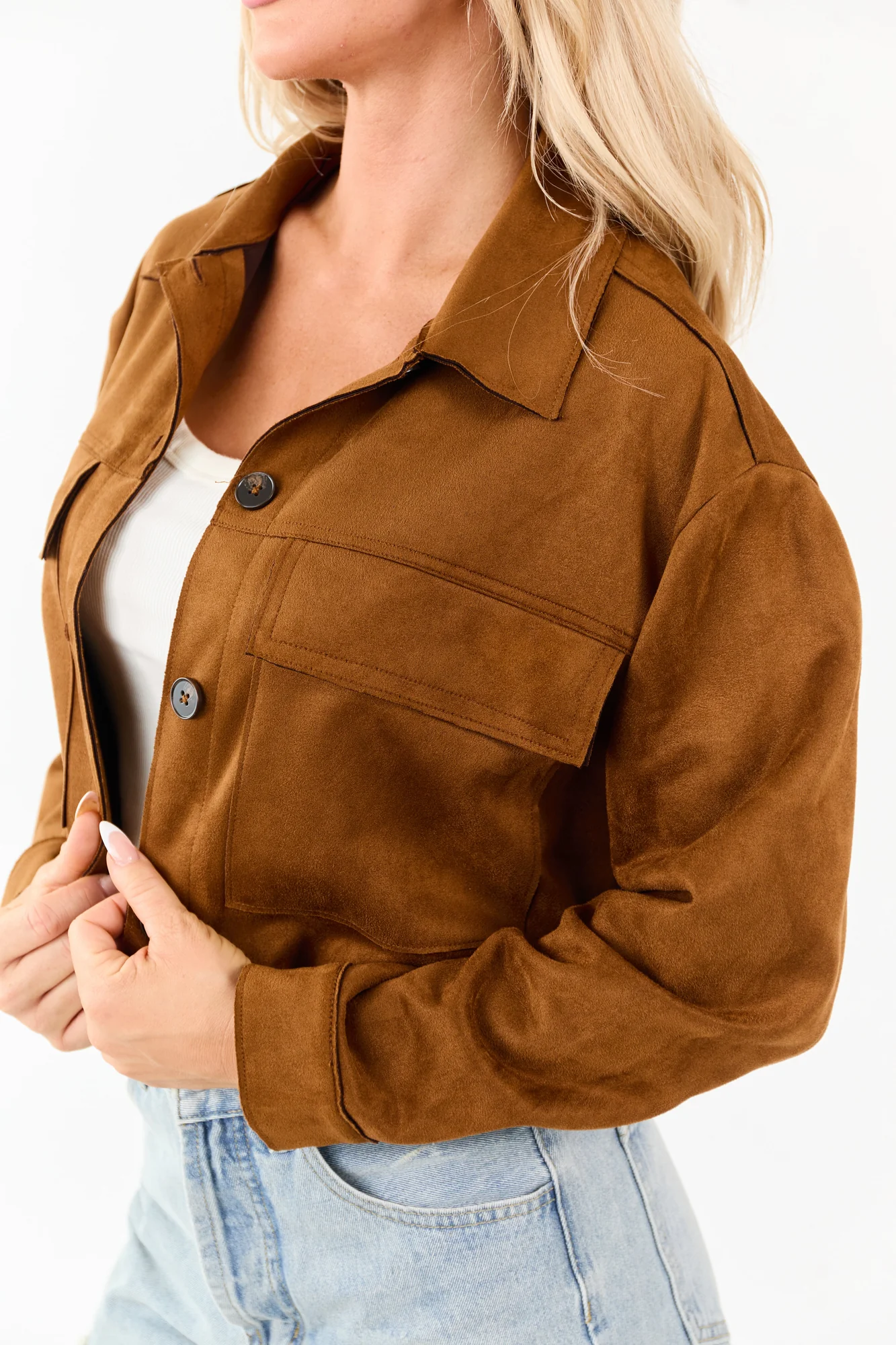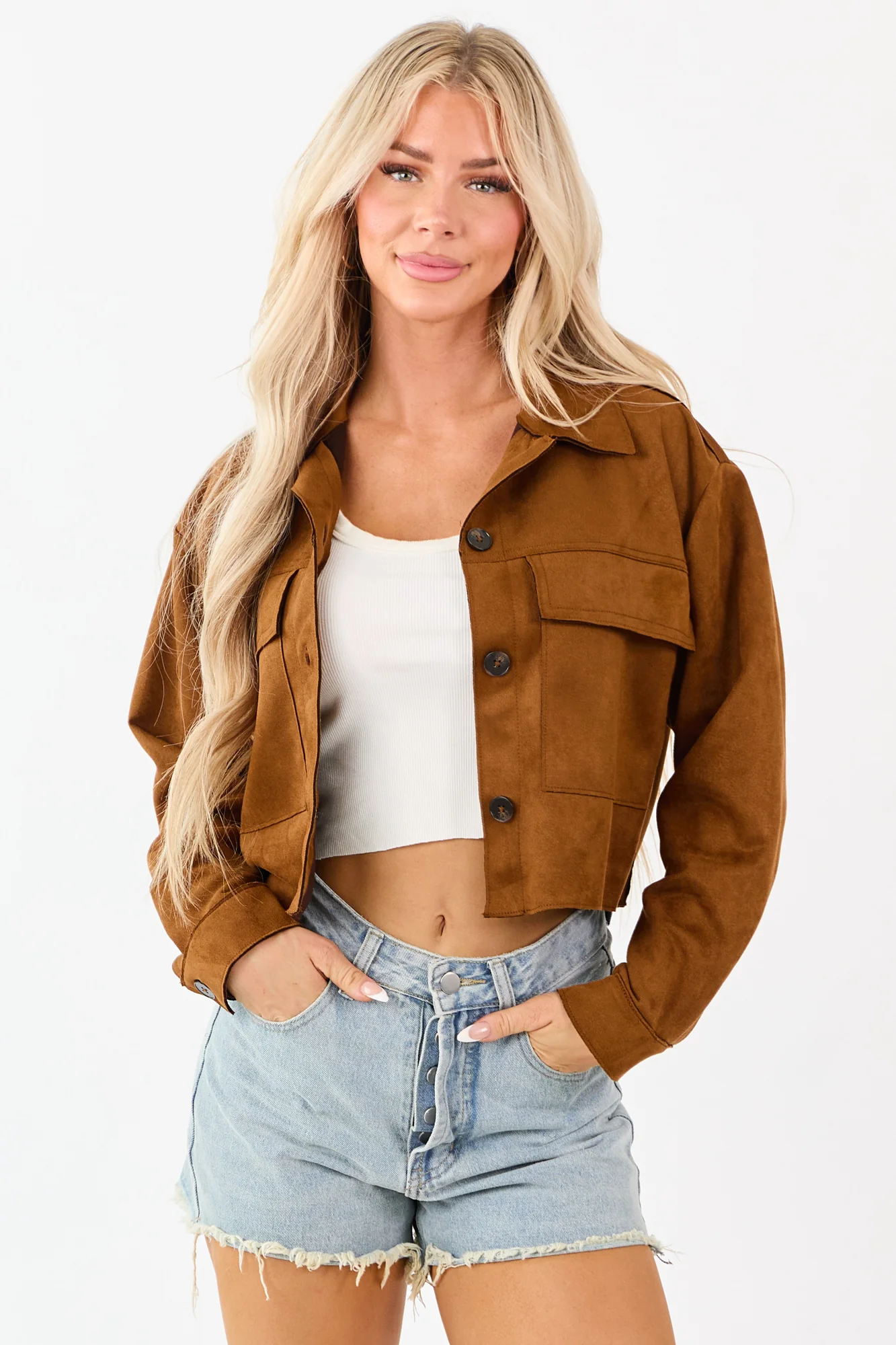 Stay stylish and cozy with our brown faux suede collared jacket featuring roomy flap pockets, banded button cuffs, and a wide boxy fit. This casual yet chic outerwear is made of semi-stretchy faux suede for ultimate comfort. It includes 2 front pockets and is crafted from 95% Polyester and 5% Spandex. Imported. Available in sizes S, M, and L. Length varies from 20.5″ to 22.5″ and sleeve length from 21″ to 22″.