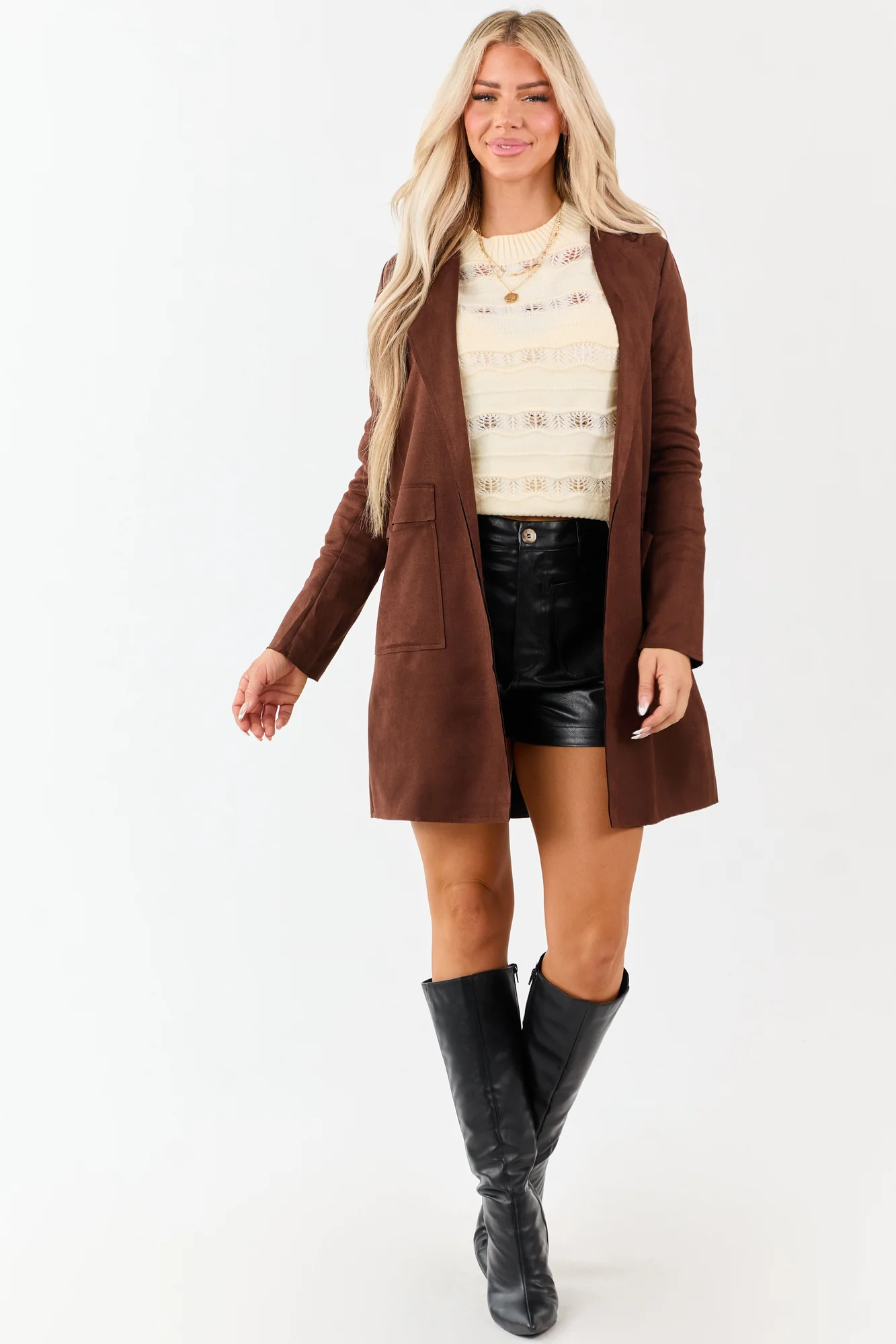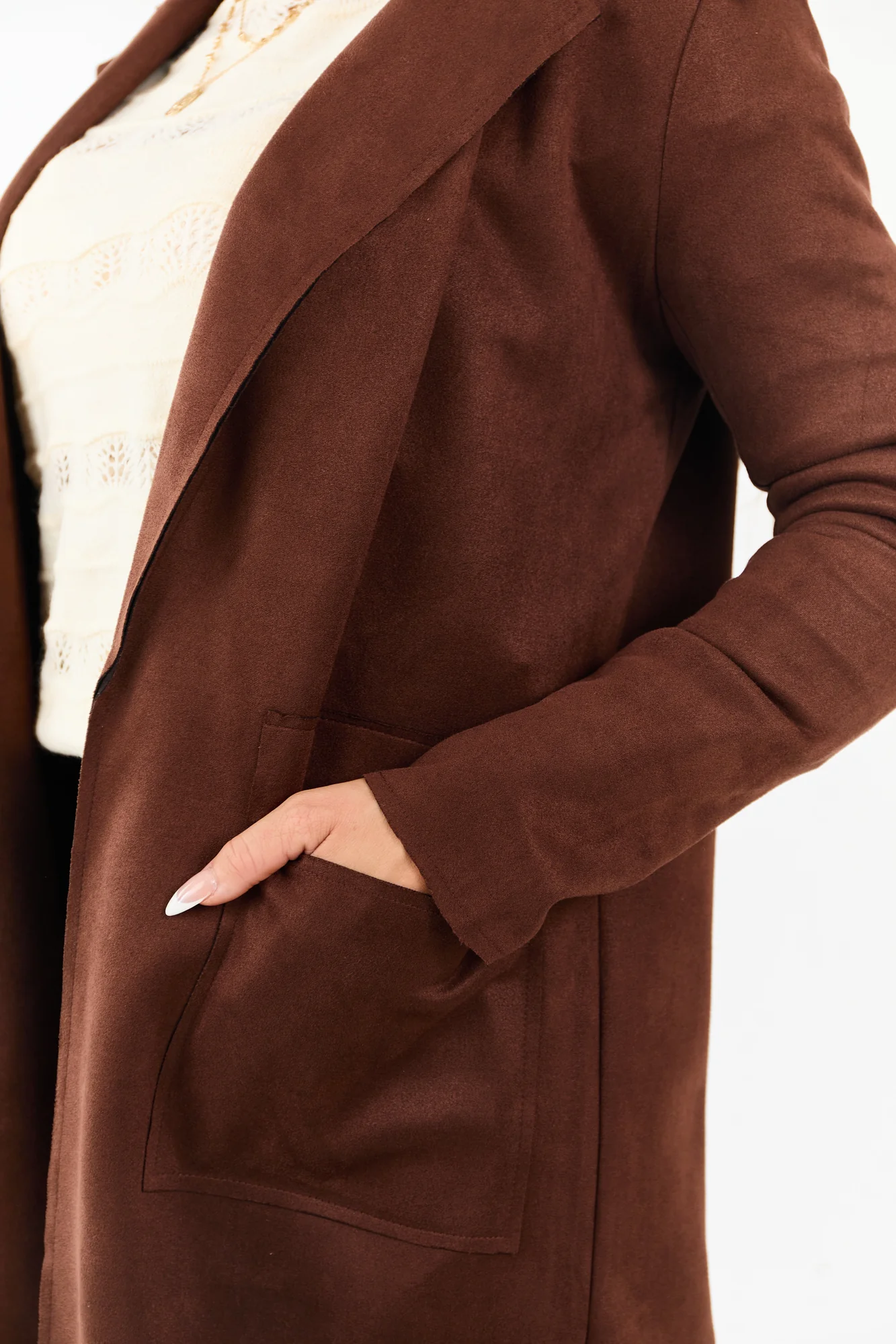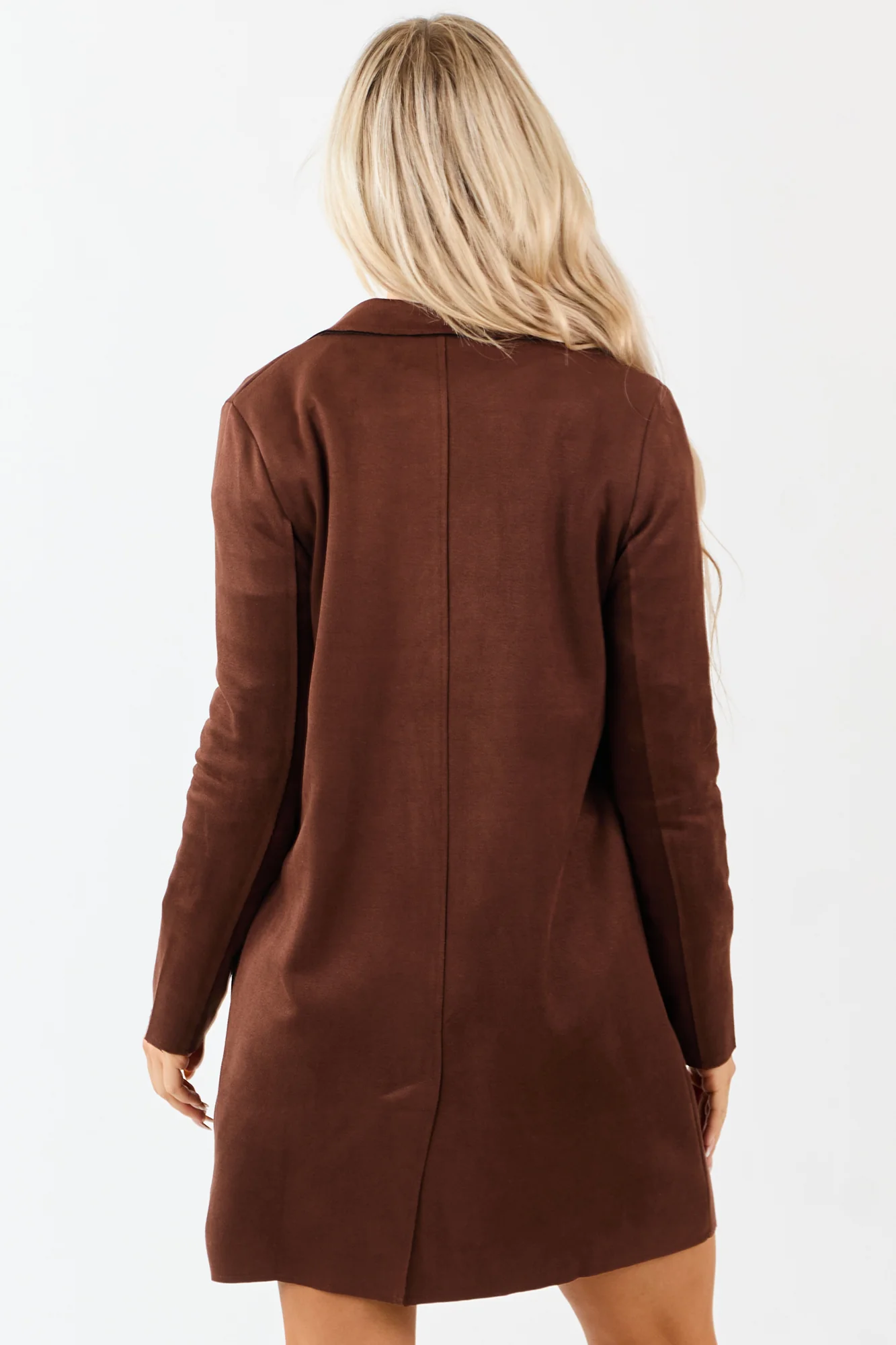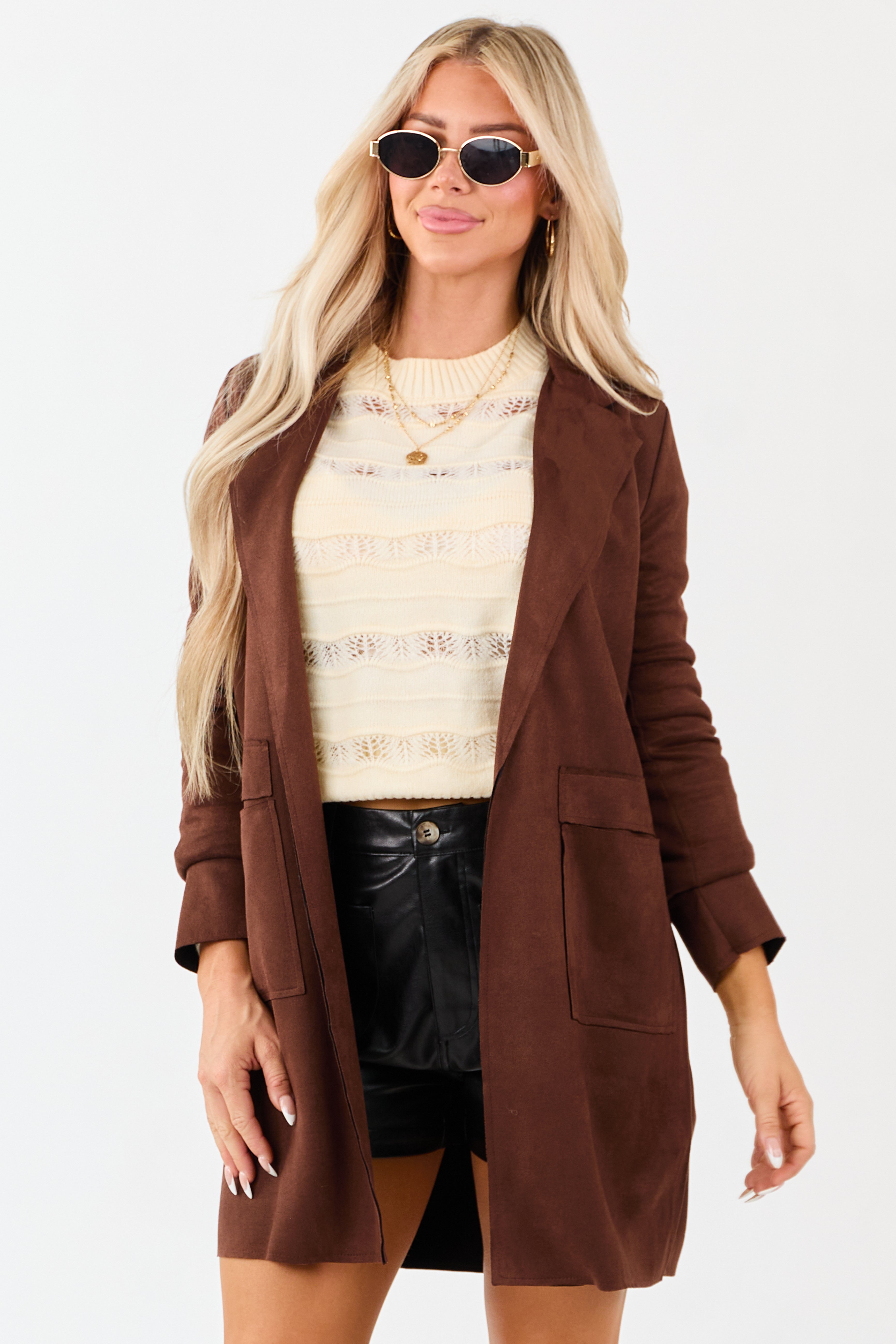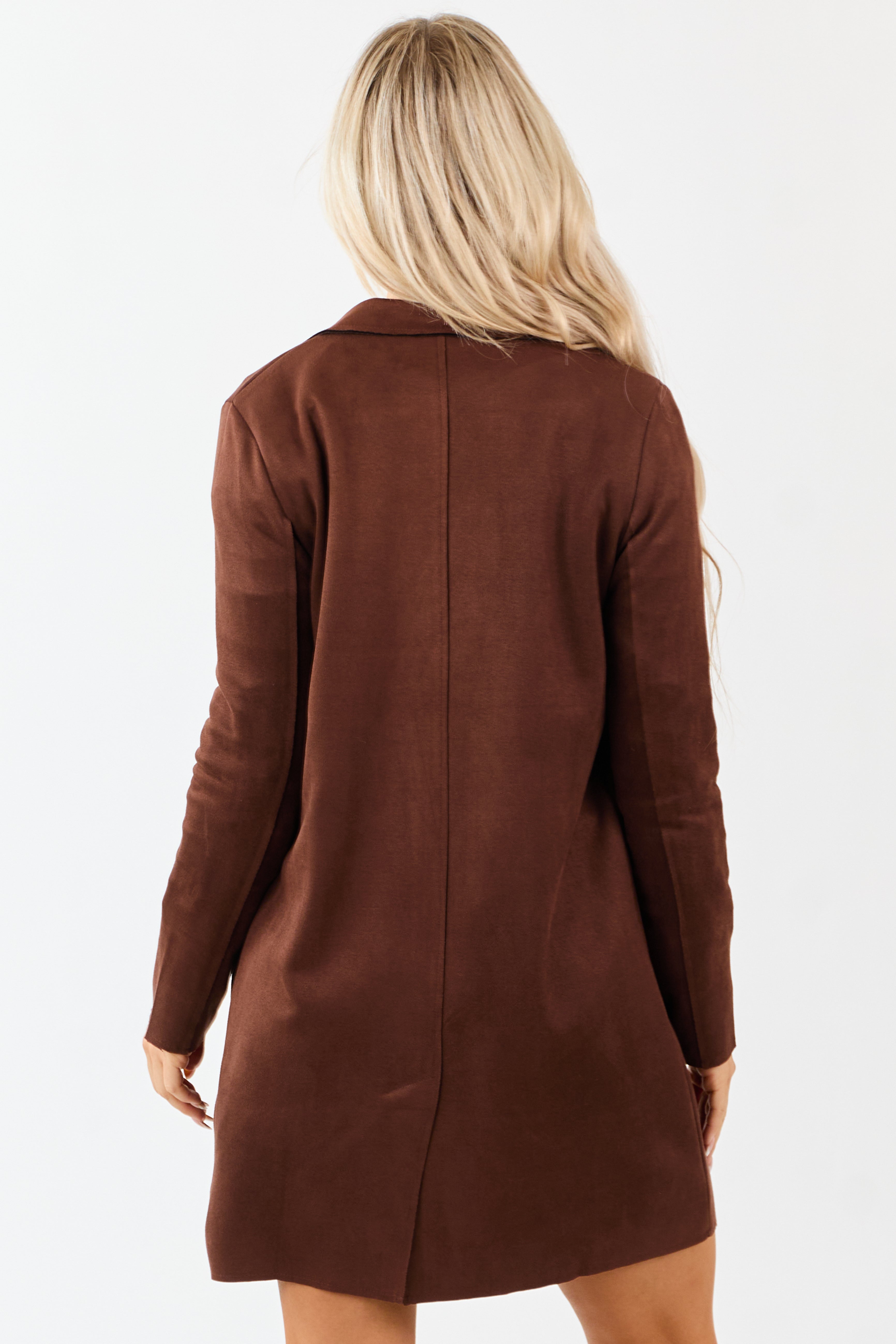 Elevate your style with this soft faux suede overcoat-style jacket in brown. Featuring an open front, lapel collar, and front pockets, this polished jacket offers a layered look. Made with semi-stretchy 95% polyester and 5% spandex blend, it ensures both comfort and sophistication. Available in sizes S, M, and L with different length and sleeve options. Ideal for fall, this solid-colored jacket complements any outfit effortlessly. Imported.