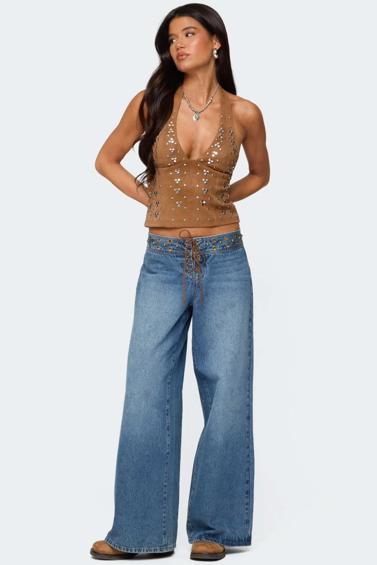 Experience chic comfort with our brown faux suede halter top. This festival-ready piece features stunning studded detailing and a button neck closure for effortless style. Crafted from a blend of polyurethane and cotton, this top is a wardrobe essential. Machine washable for easy care. Elevate your fashion game with this versatile piece. Suitable for casual outings, events, and concerts.