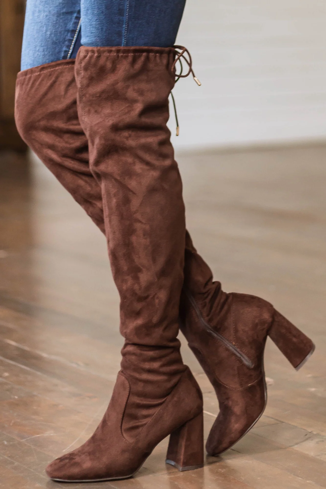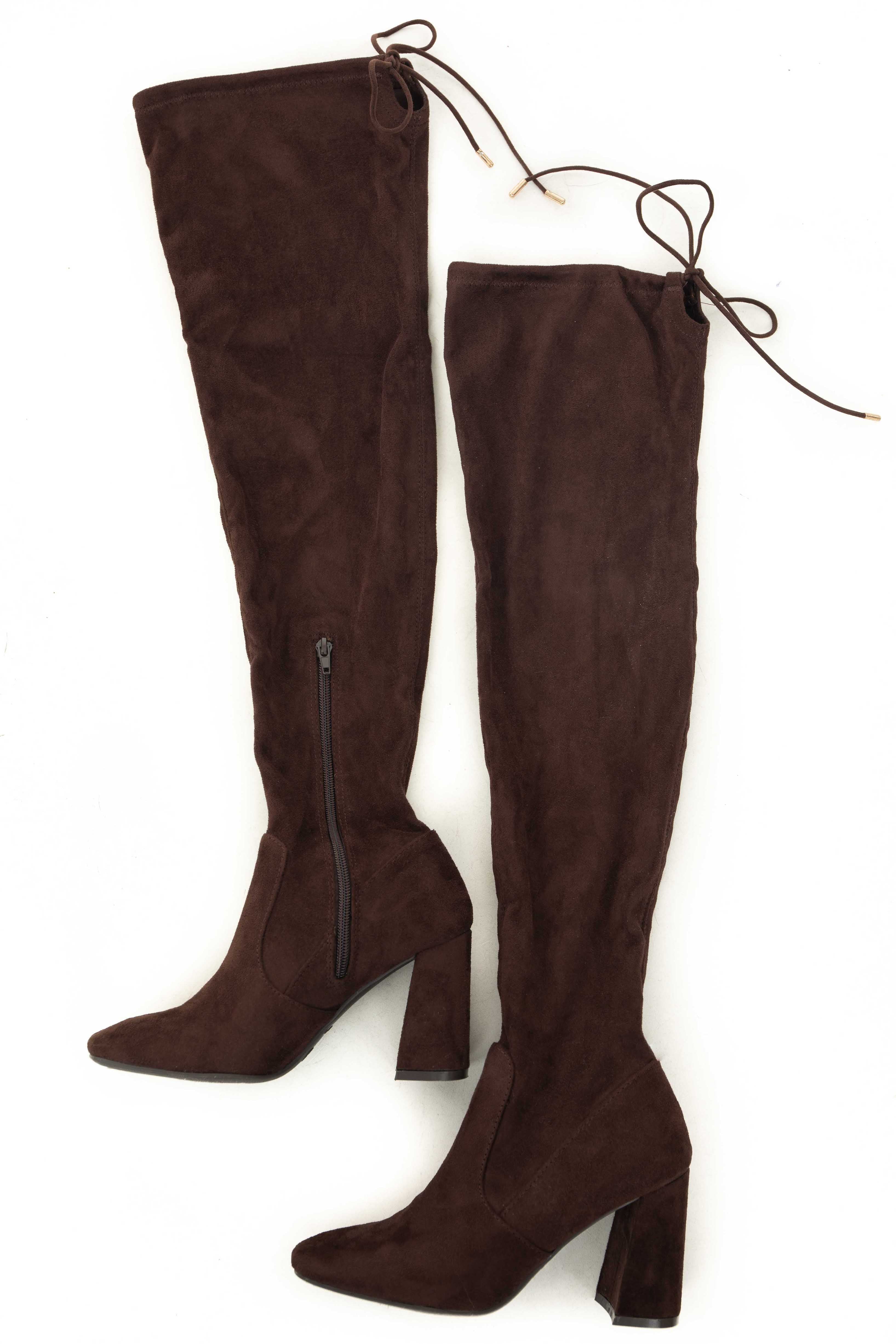 Indulge in luxury with these elegant brown faux suede thigh-high boots designed for ultimate comfort and style. Featuring a drawstring detail, lightly cushioned interior, and a chocolate rubber sole for a secure stride. The rounded square toe and side zipper closure add a modern touch. Shaft height is 24.5 inches with a 17-inch circumference and a 3.5-inch heel. Get the perfect fit for every fashionable occasion. Measurements are based on size 8; model wears a size 6.5.