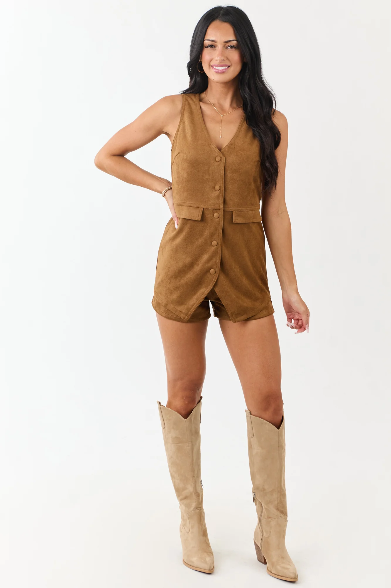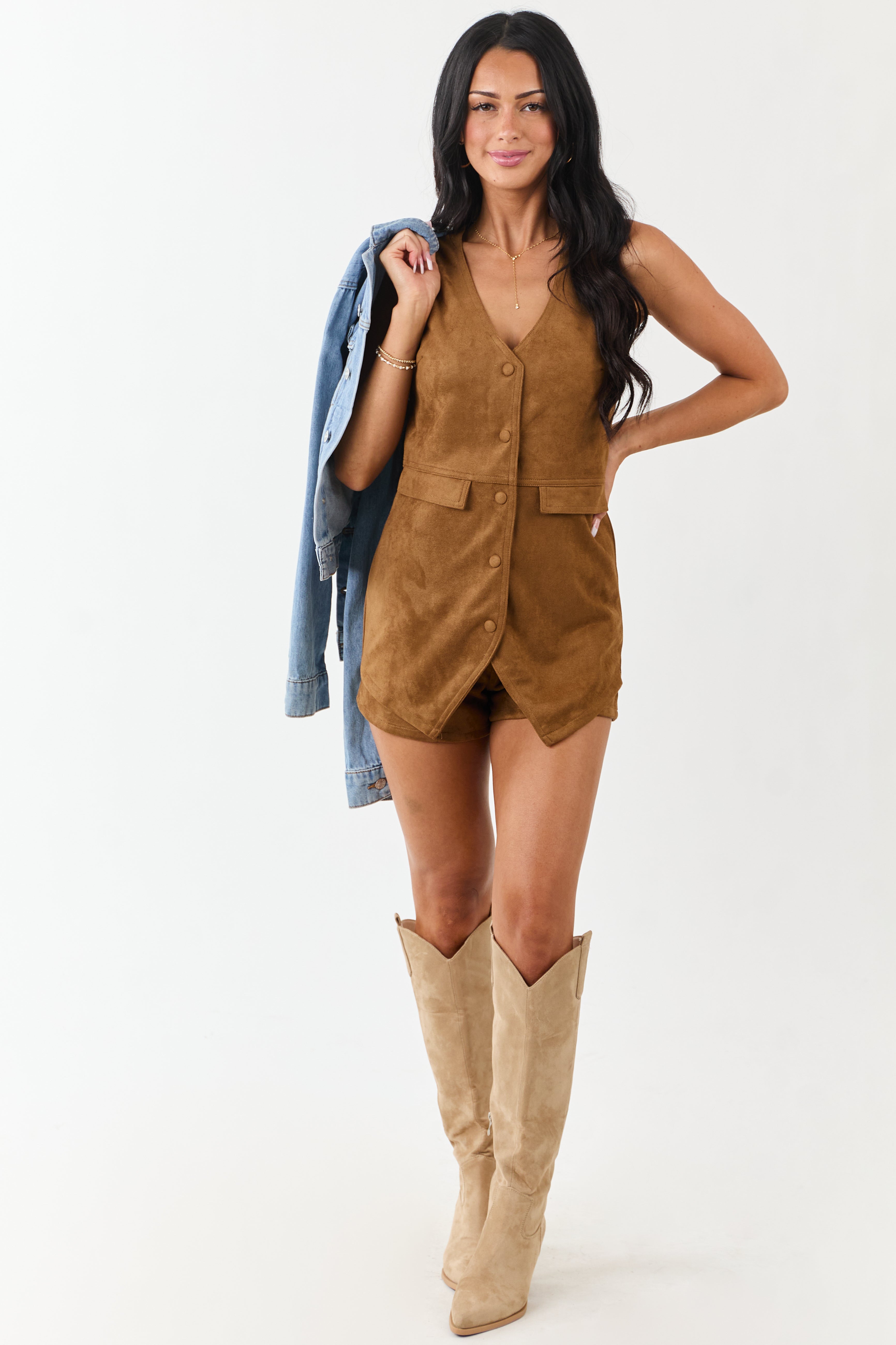 Indulge in the rich feel of faux suede with this stylish vest romper. Crafted for comfort, this piece features a two-piece illusion with all-in-one convenience. Made from semi-stretchy faux suede, it comes with snap buttons, front flap pockets, and a side zipper. Lined for added comfort, this romper is perfect for any occasion. The size Small specifications are: Bust 35″, Waist 30″, Hip 37″, Torso Length 31″. Imported and made of 100% Polyester. Model is 59″ tall, wearing a size Small (Size 1), with a Bust of 34″ and Waist of 26″.
