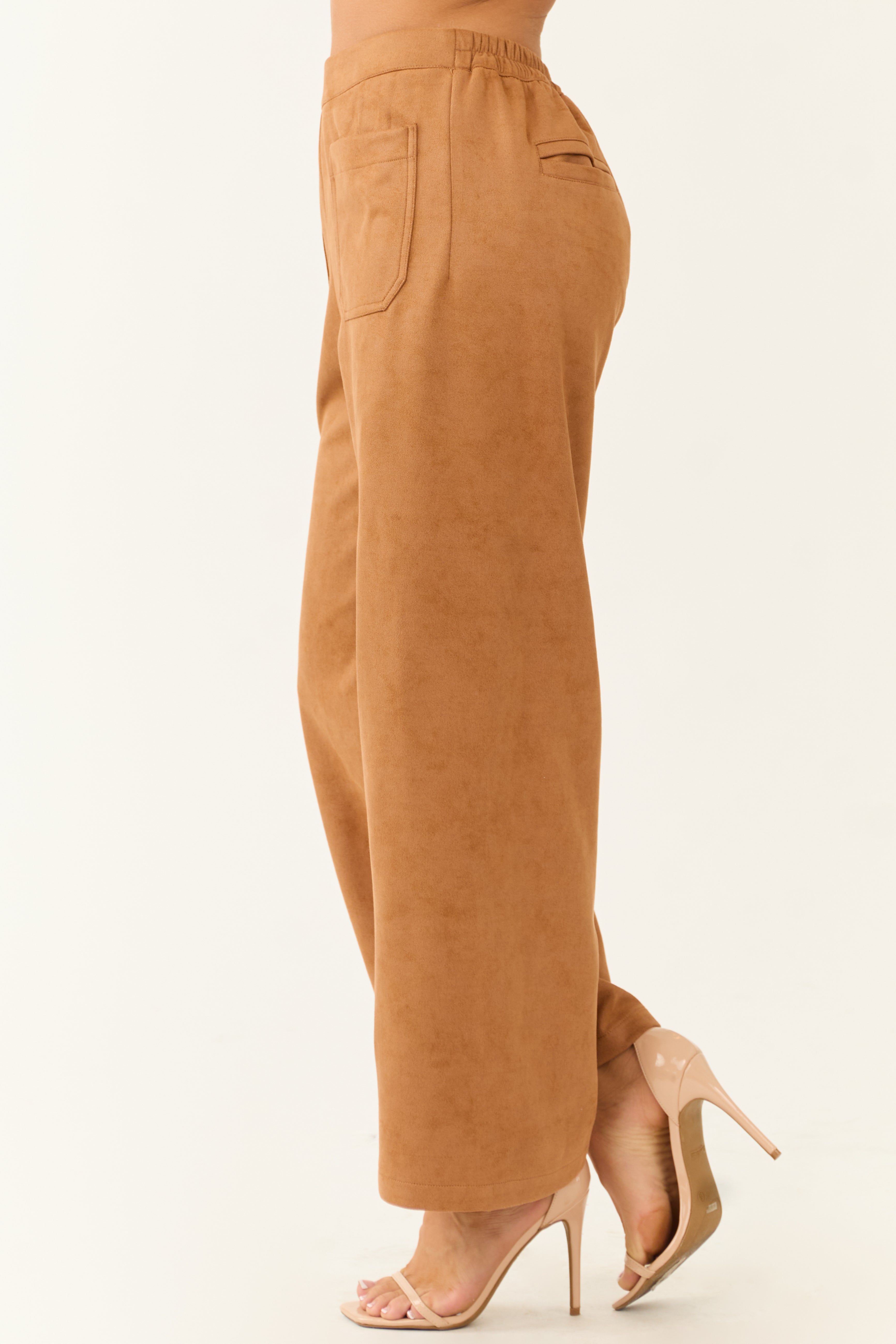 These Brown Faux Suede Wide Leg Pants for Women come in sizes S, M, L, and XL with waist options of 28″ to 34″ and inseam lengths ranging from 26″ to 27.5″. Made with semi-stretchy faux suede and featuring an elastic waistband for additional comfort, these pants include front pockets and are unlined. Crafted from 90% Polyester and 10% Spandex, these imported pants require hand wash cold, non-chlorine bleach, and line dry. The low iron is recommended as needed. The model in the image is wearing a size Small and has the following measurements: Size 1, Height 57″, Bust 34″, Waist 26″.