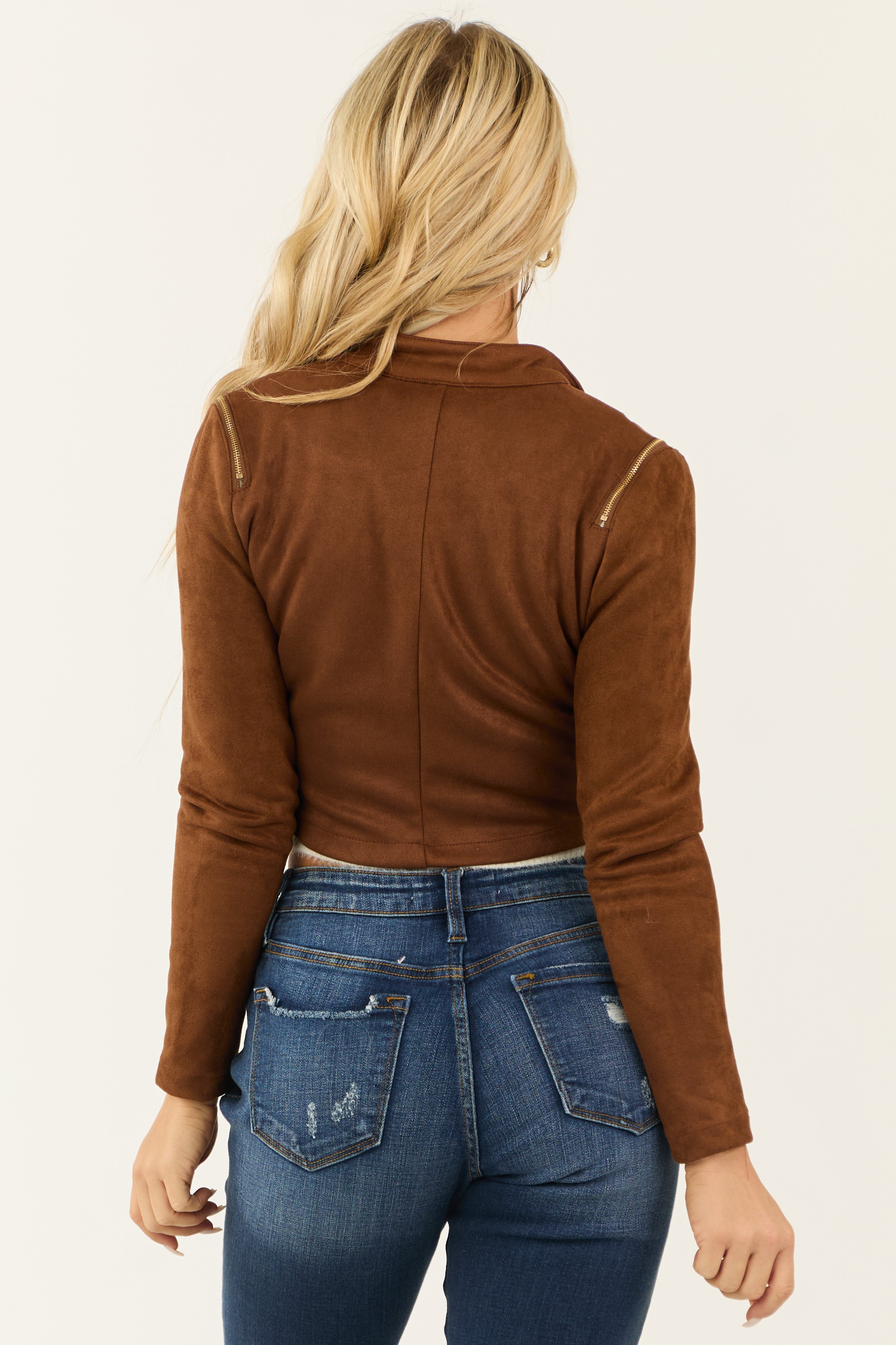 Stay stylish with this Brown Faux Suede Zipper Biker Jacket. Made of non-stretchy soft faux suede, it features a mock neckline, long sleeves, and gold zipper details. The banded cuffs and cropped length add a trendy touch. Perfect for daytime or a night out. Easy care instructions: hand wash cold, line dry. Available in sizes S, M, and L.