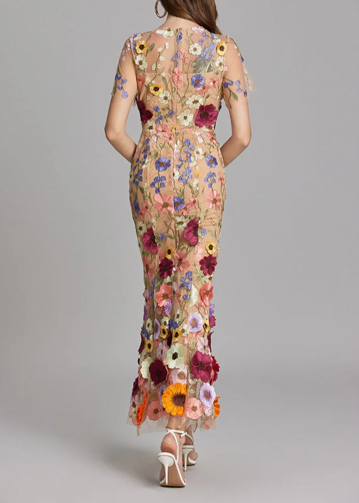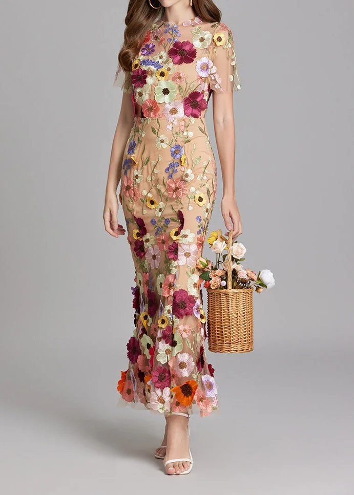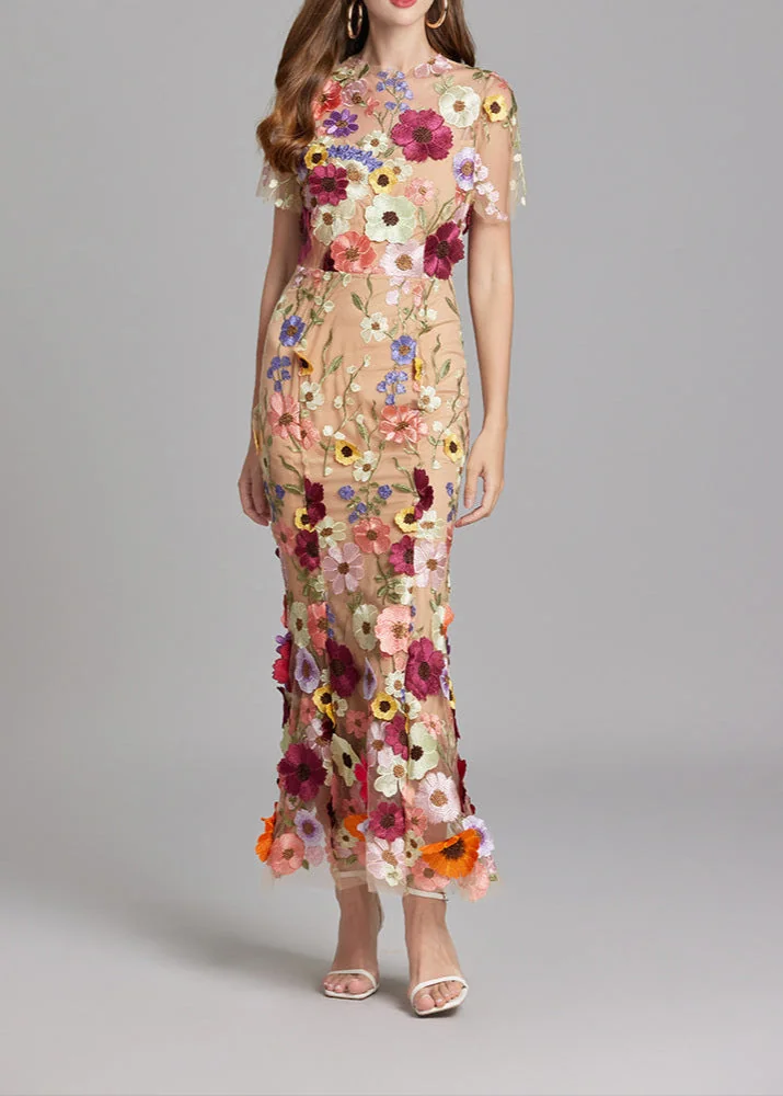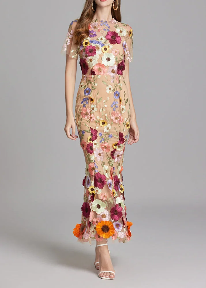 Elevate your style with our Brown Floral Embroidery Mesh Fishtail Midi Dress. Delicately crafted with floral embroidery on sheer mesh fabric, this dress exudes luxury and sophistication. The fitted silhouette and elegant fishtail hem make it perfect for special occasions. The color may vary slightly due to lighting. Refer to our size chart for the best fit.