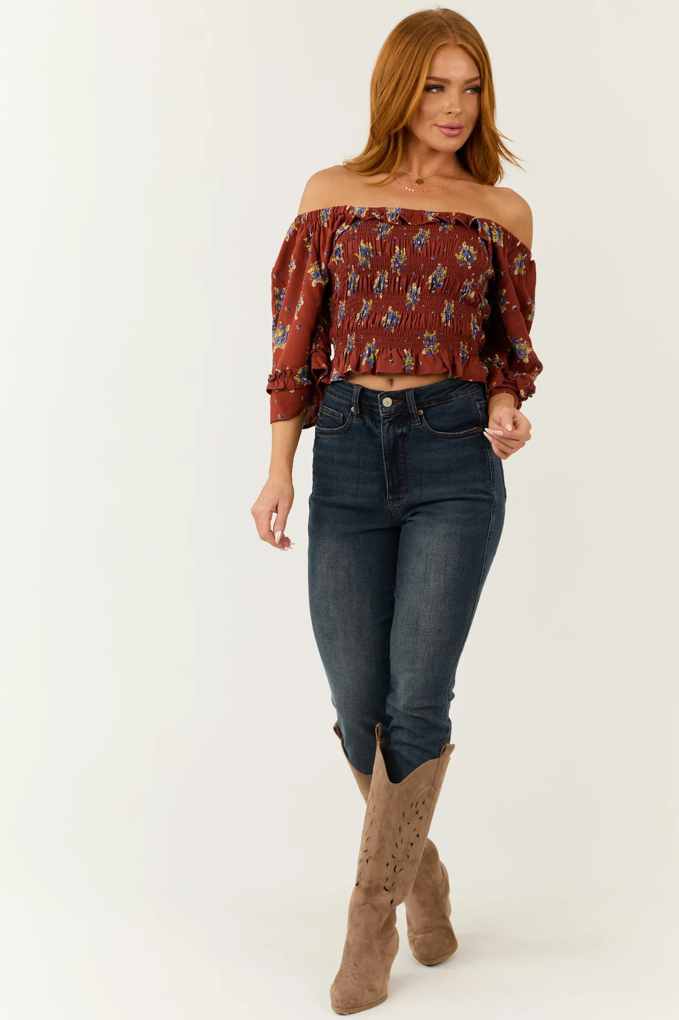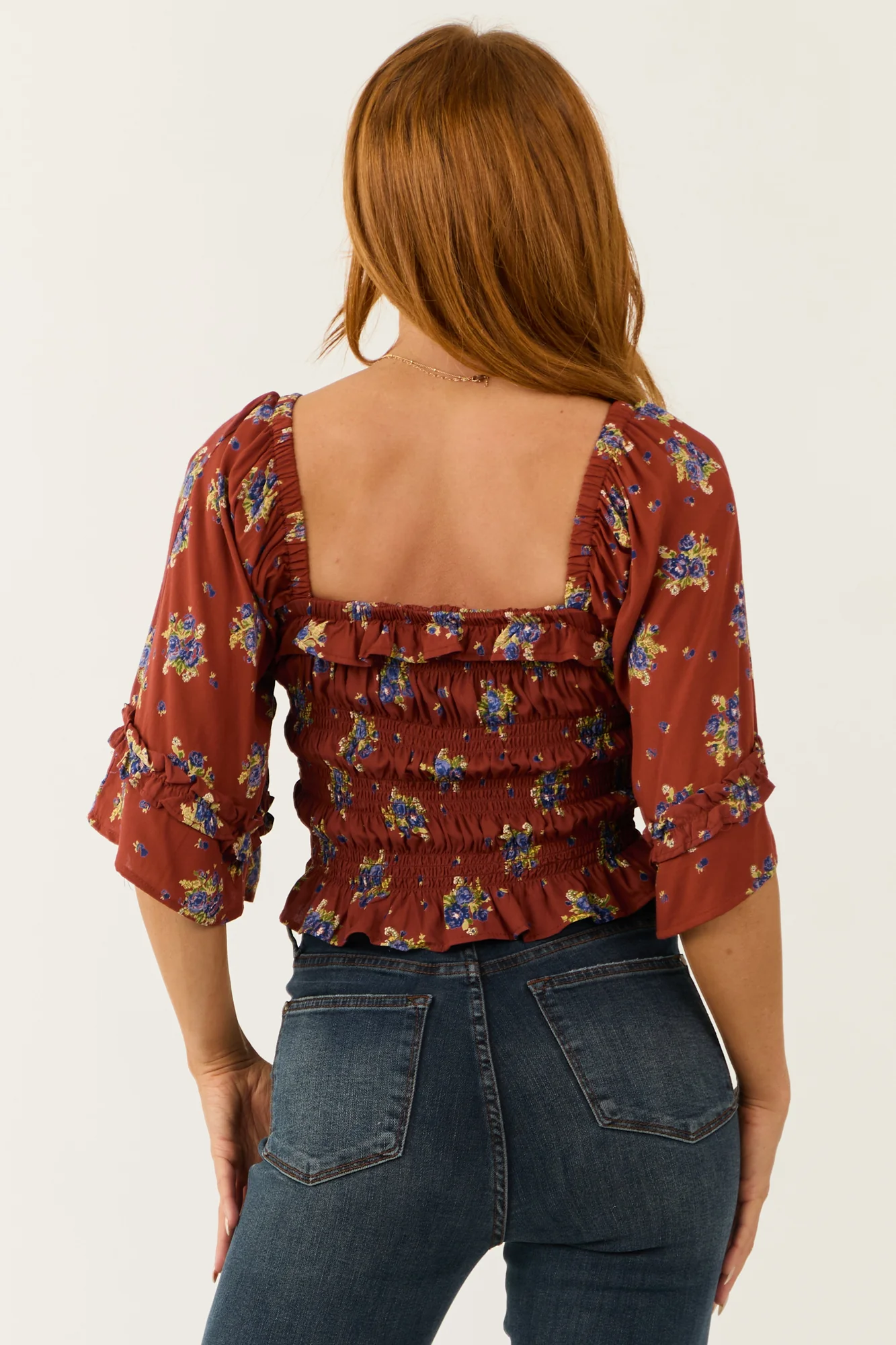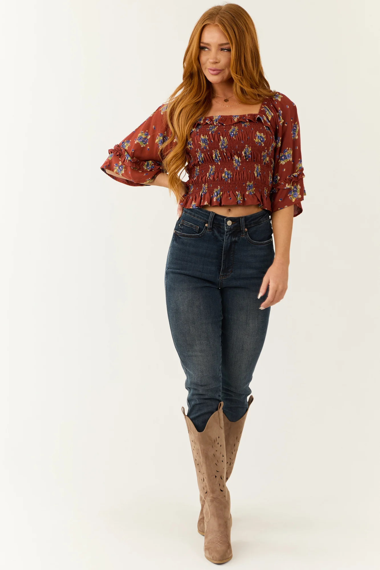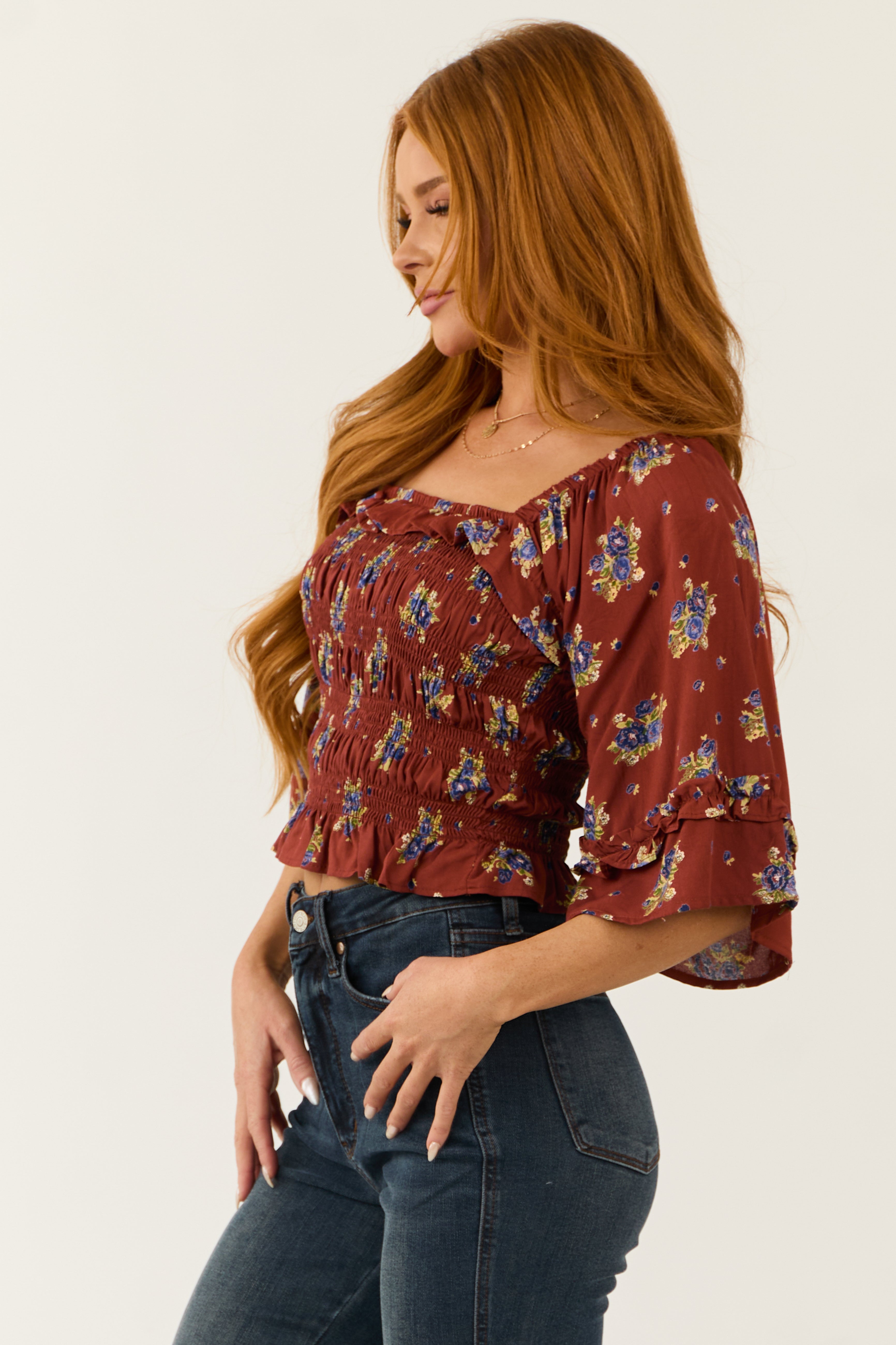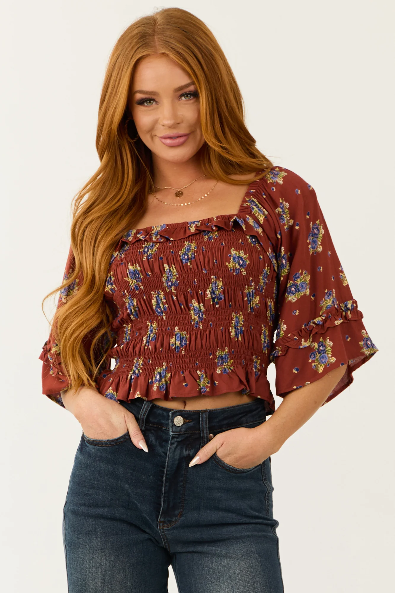 This stylish Brown Floral Print Smocked Bodice Crop Top comes in sizes S, M, and L. Featuring a non-stretchy woven fabric with a beautiful floral print in Dusty Sunshine, Navy, Olive, and Lavender shades. It has a trendy square neckline with elastic, half flare sleeves with ruffle detail, a smocked bodice, and a ruffled hemline. Made of 100% Rayon. Ideal for all occasions. Hand wash cold, drip dry, do not bleach. Model is wearing size Small.
