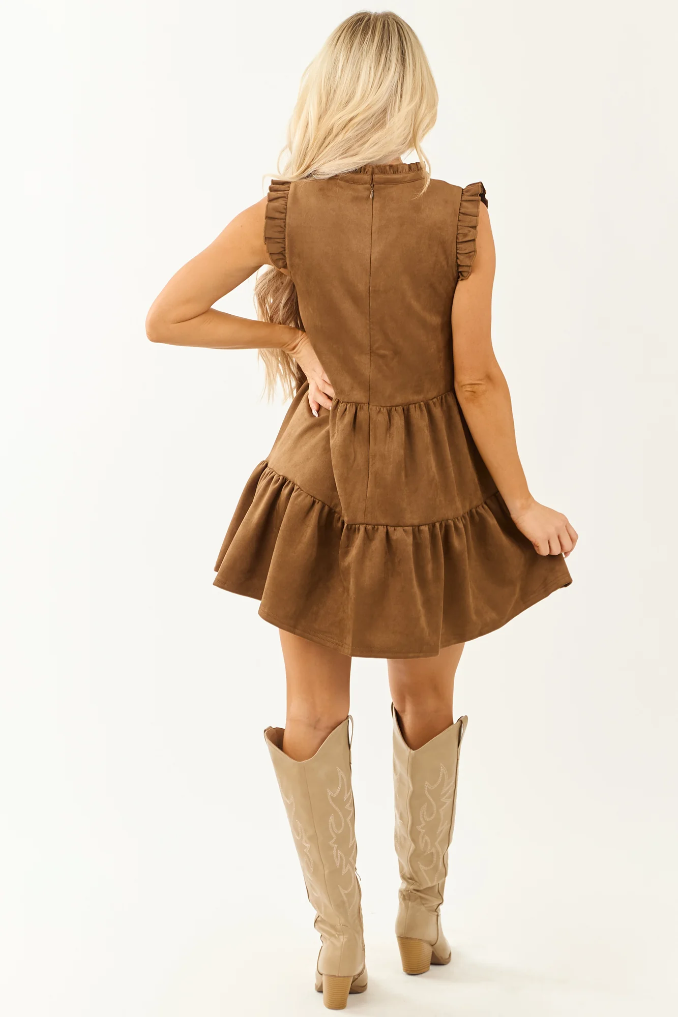 Indulge in chic boho-chic charm with our Brown Frill Cuff Flowy Mini Dress. This stylish piece features frill cuffs, a flowy tent silhouette, and a hidden back zipper for a touch of elegance. Perfect for day or date night, pair it with boots or heels for a versatile look. Crafted from semi-stretchy faux suede for comfort and style. Available in sizes XS to XL. Size Chart: XS (0/2), S (4/6), M (8/10), L (12/14), XL (16/18). Bust: 31-40 inches, Waist: 23-32 inches, Length: 33 inches.