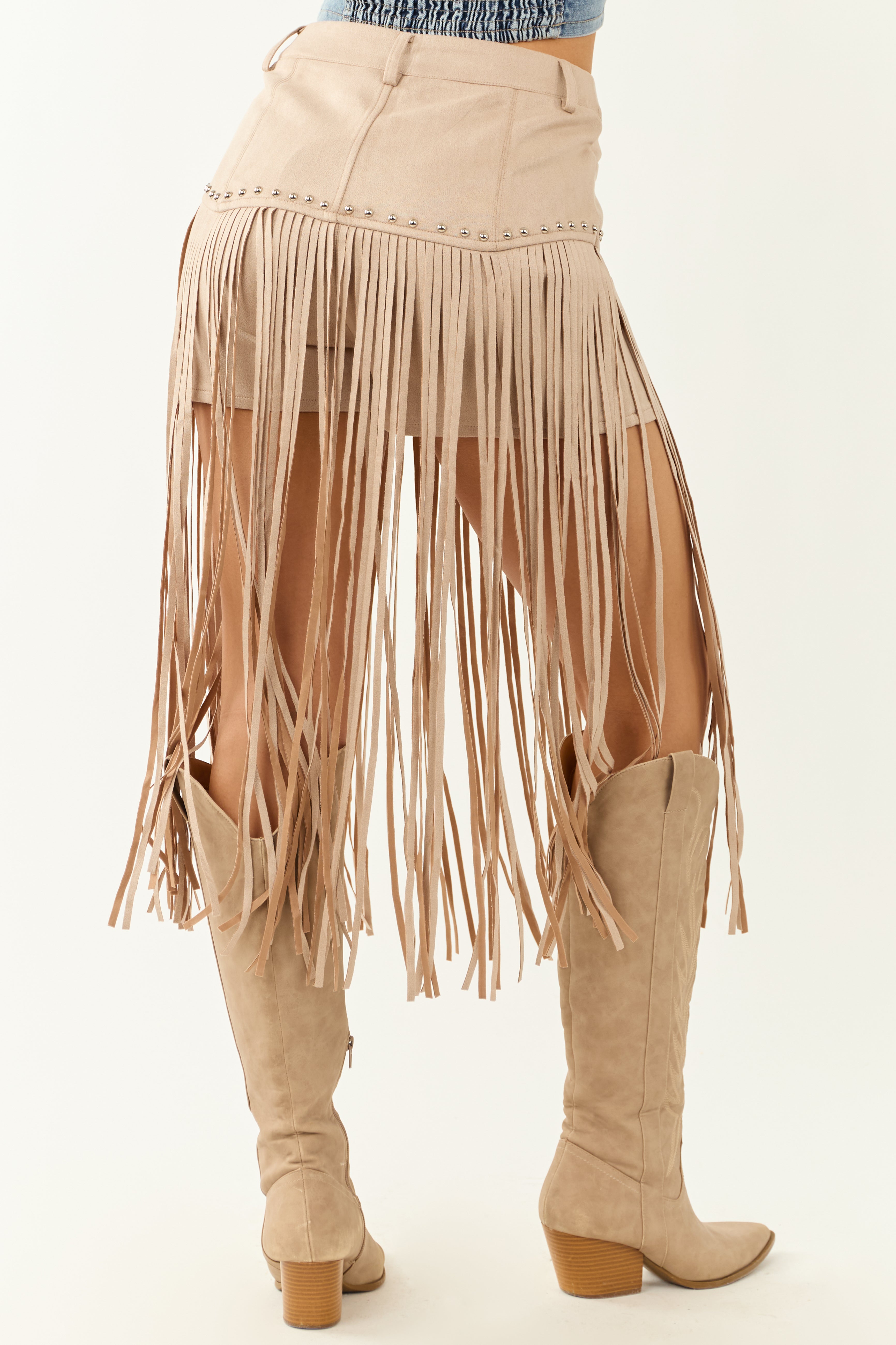 Discover the perfect balance of fringe, studs, and sass with these brown fringe studded shorts! Designed to steal the spotlight, these shorts feature a slightly loose waistband, a stretchy faux suede midi skirt overlay, silver studs, a zipper fly, belt loops, and 2 functional pockets. The 26″ fringe adds a touch of flair, while the 14″ front and back rise ensure a flattering fit. Crafted from 90% Polyester and 10% Spandex. Available sizes: S, M, L.