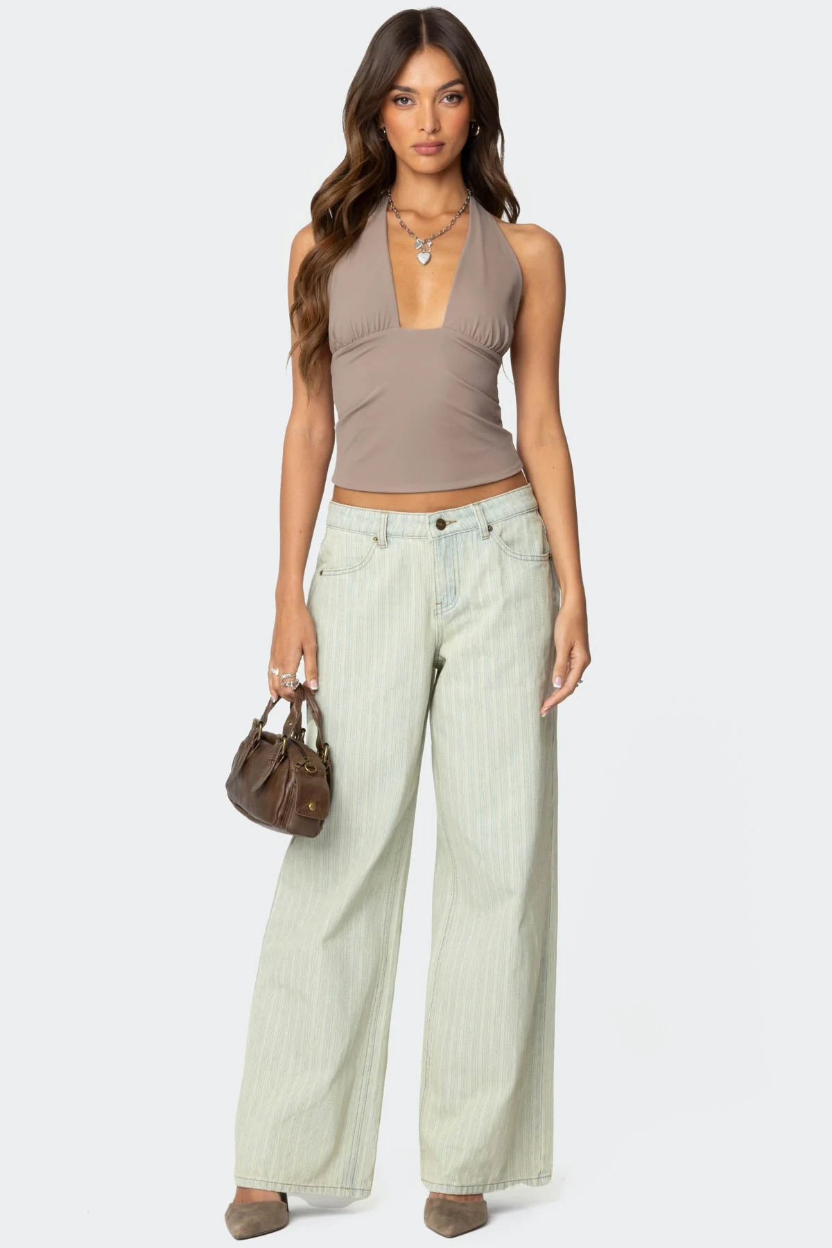 This brown sleeveless top features a stylish halter neck design for a trendy and chic look. Made of lightweight Nylon and Spandex blend, it offers a comfortable fit and is perfect for any casual or semi-formal occasion. The plunging neckline adds a touch of allure to your outfit. Machine washable for easy care. Available in sizes XS to XL. Elevate your wardrobe with this versatile piece today!