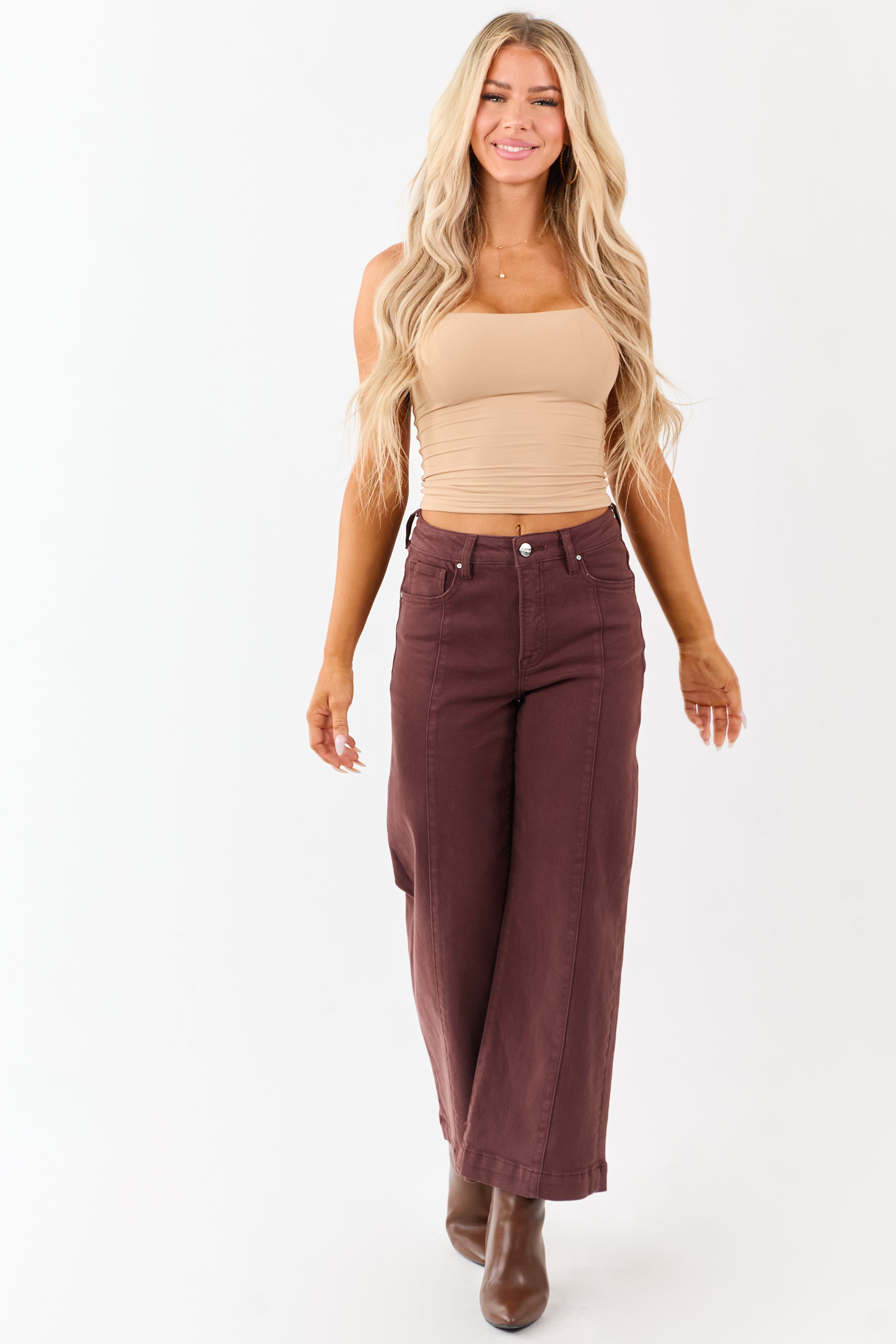 Achieve a sleek look with these smooth and sculpted brown wide leg jeans featuring built-in tummy control. Crafted from stretchy denim, these ankle-length jeans provide serious comfort while flattering your figure. The high-rise design with a tummy control waistband ensures a forgiving fit. Enjoy the convenience of a zipper fly with button closure, five functional pockets, and belt loops. Made of 98% Cotton and 2% Spandex. Available in waist sizes ranging from 25″ to 33″ and inseam length of 27″. Imported.