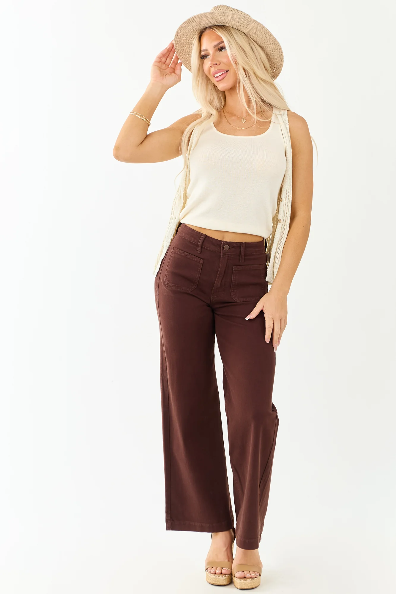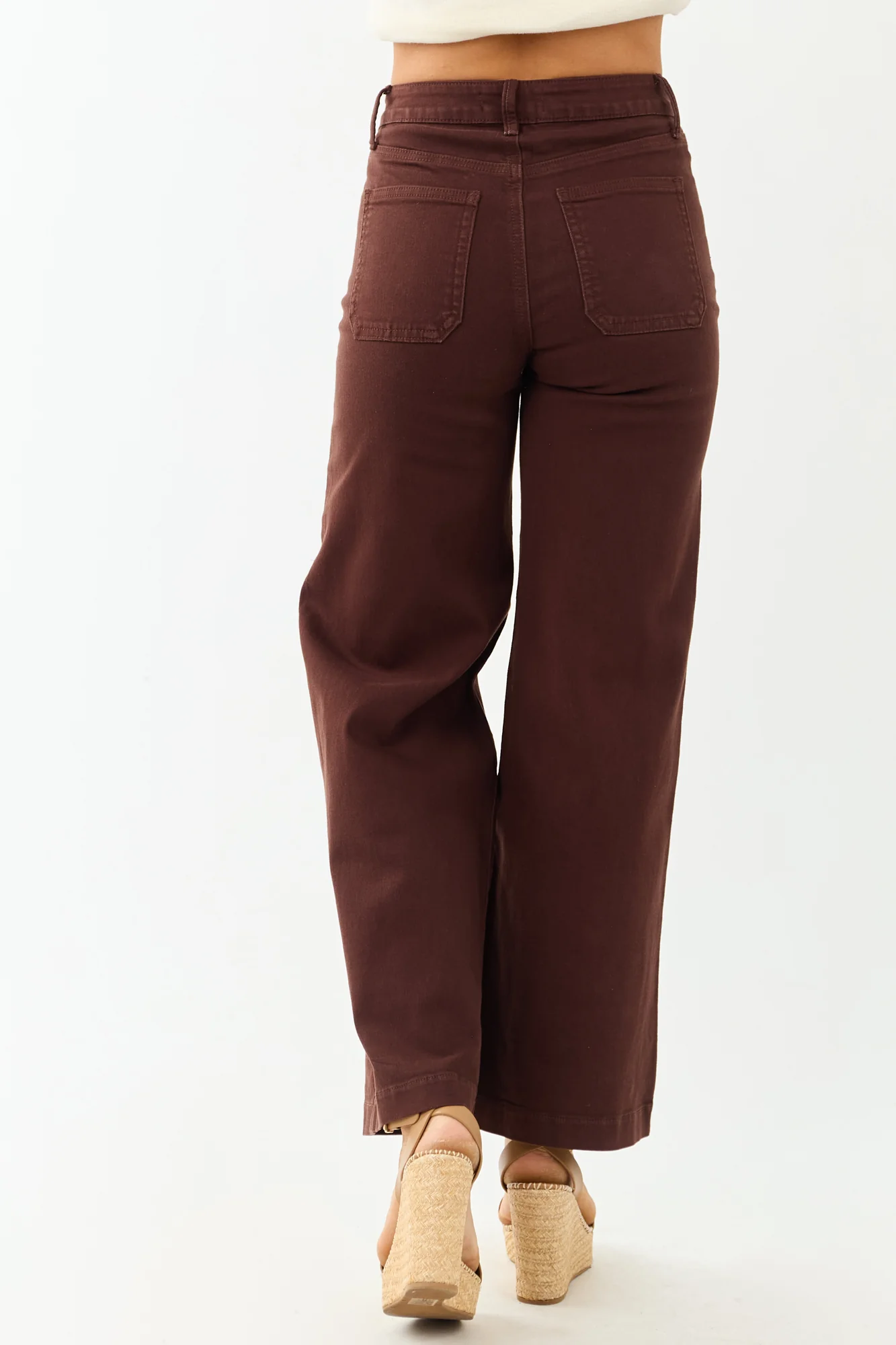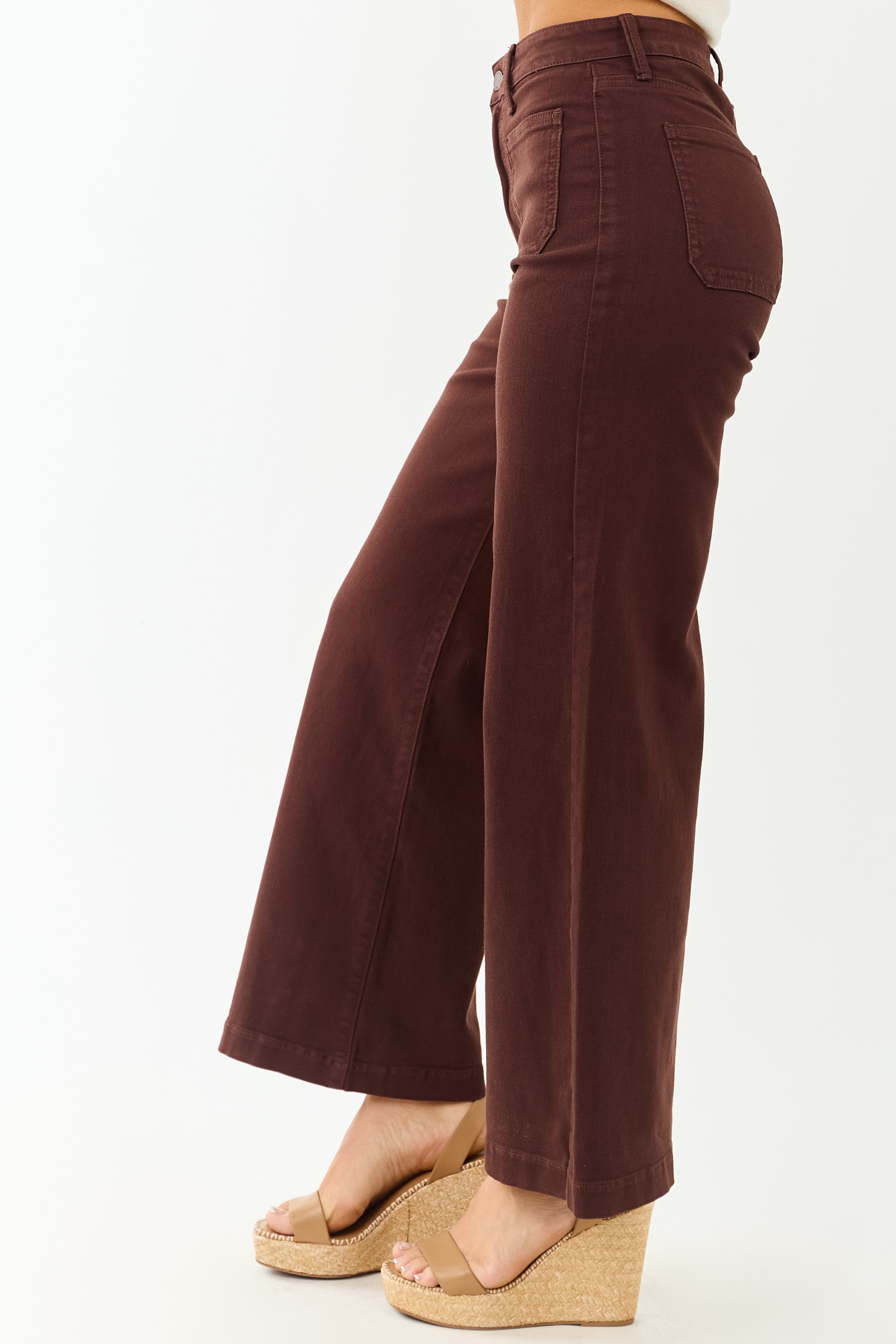 Achieve ultimate comfort and style with these brown high-rise stretchy wide leg jeans. Designed with a flattering fit, these jeans feature a zipper fly, belt loops, and a blend of cotton, rayon, polyester, and spandex for a perfect balance of comfort and stretch. With a front rise of 11″ and a back rise of 14″, these jeans are a statement piece suitable for any occasion, be it casual or dressed up. Available in sizes from 24 to 31.