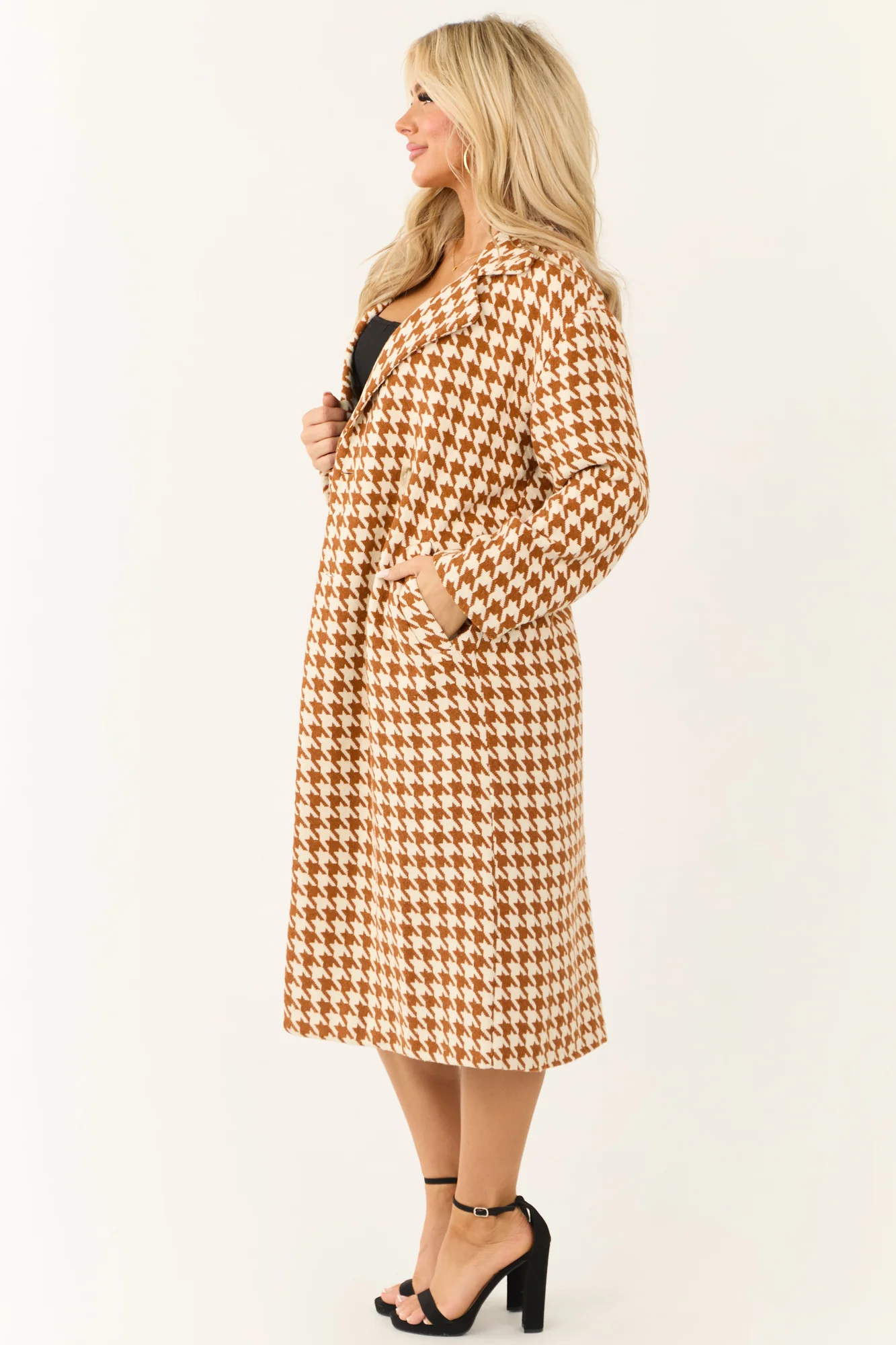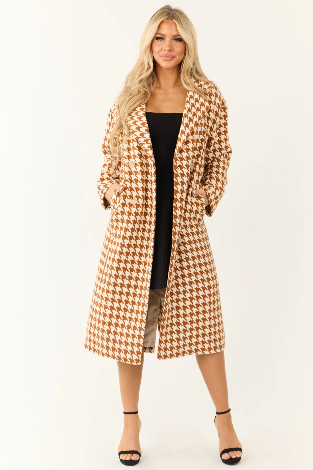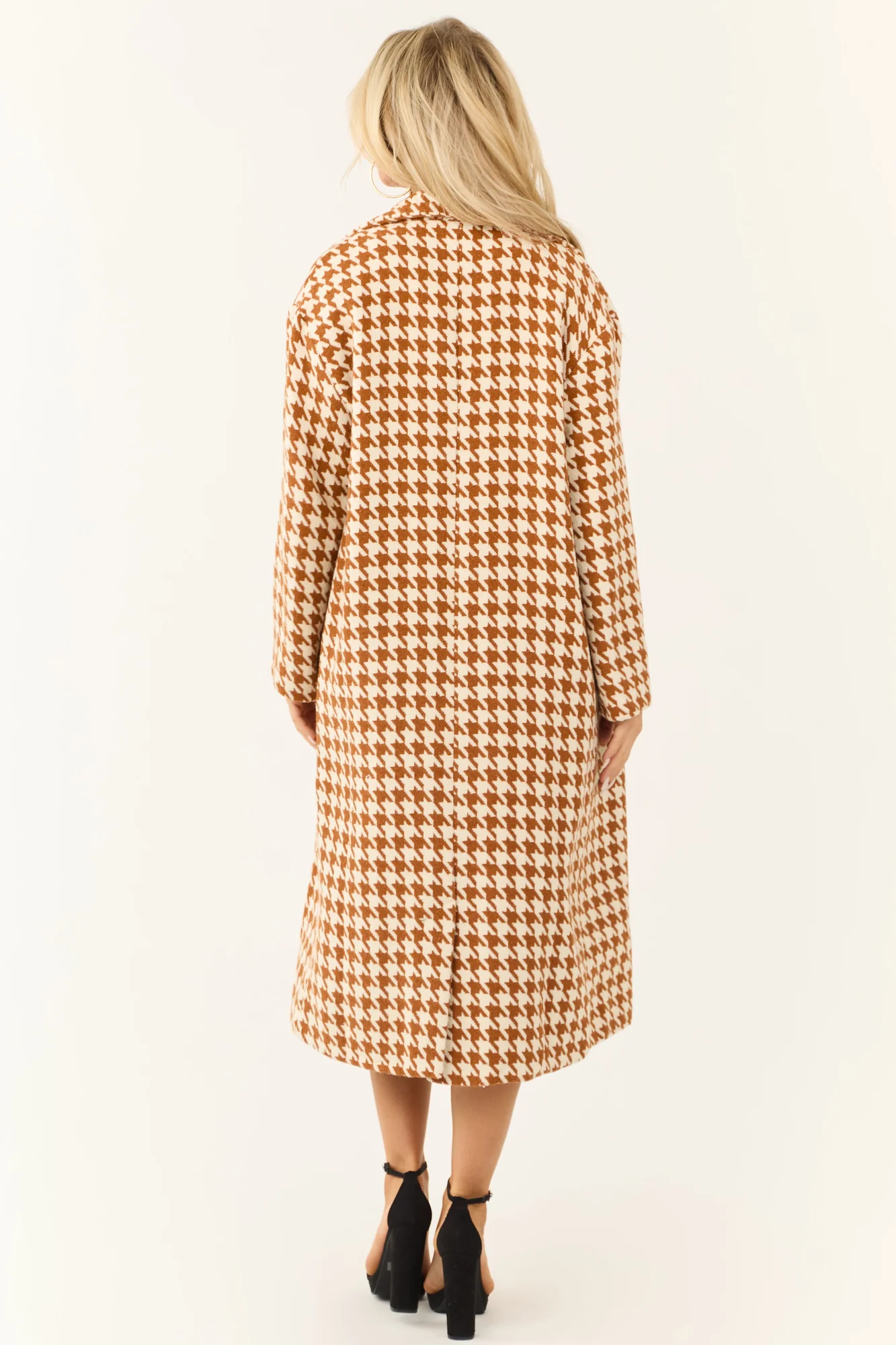 Stay cozy and chic in this Brown Houndstooth Trench Coat featuring a non-stretchy woven design, lapel neckline, long sleeves, side pockets, and a soft 90% Polyester, 10% Wool blend. Perfect for winter, this lined coat adds a touch of sophistication to any outfit. Hand wash cold, do not bleach, line dry, iron low. Embrace the unique variations due to the cutting and sewing process, making each piece one-of-a-kind. Model is wearing a size Small.