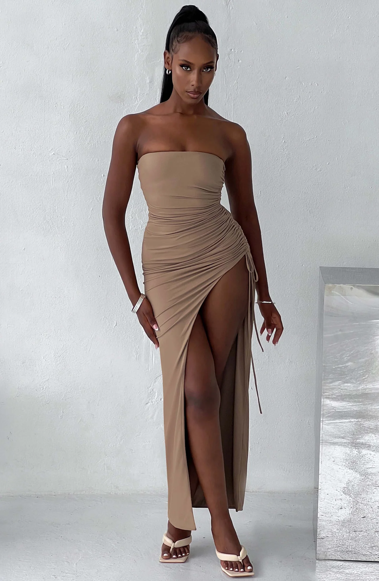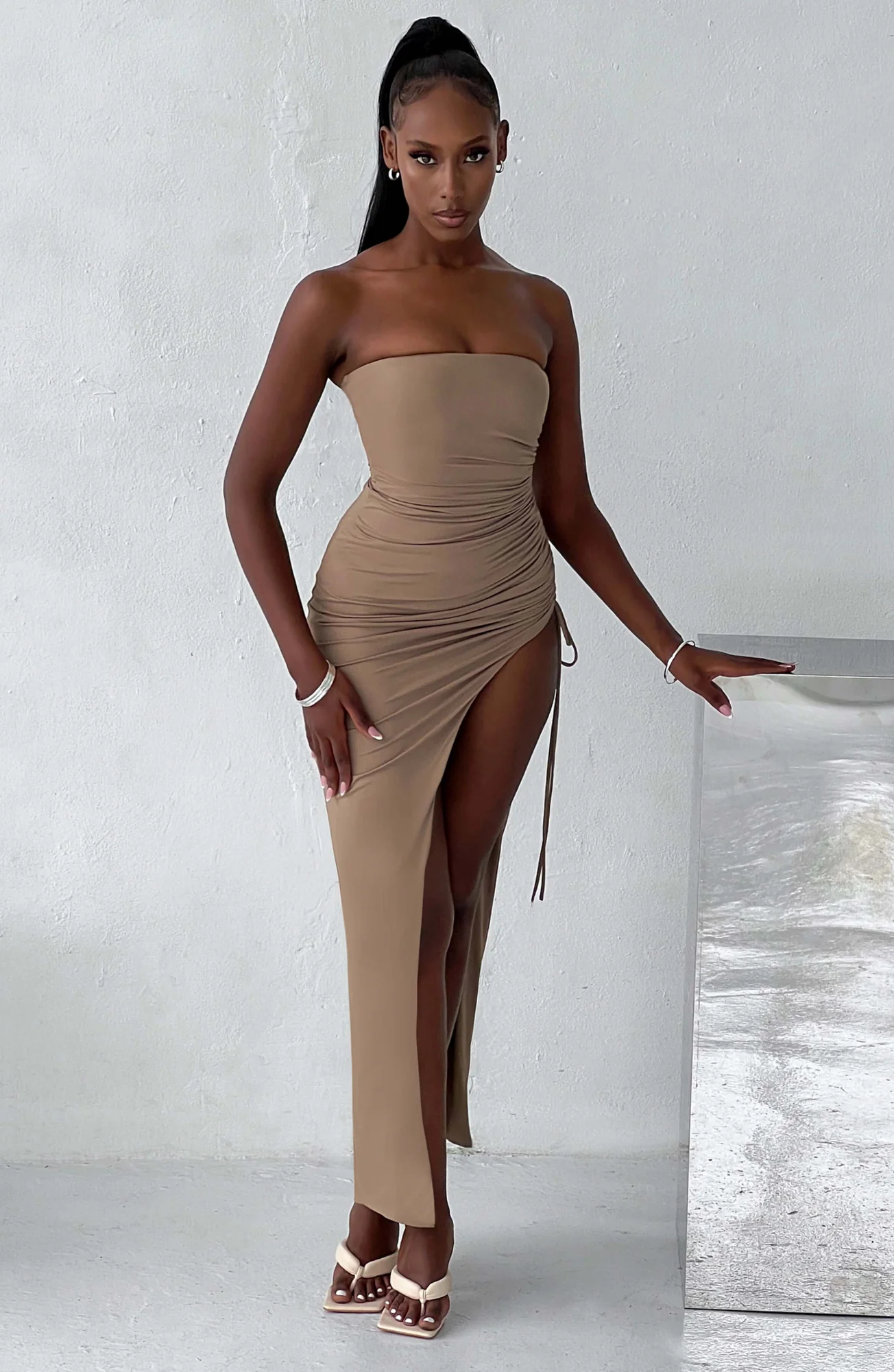 Indulge in the luxurious comfort of the Brown Jersey Maxi Dress with Thigh High Split by DIA. Crafted from premium double-layered jersey fabric, this dress contours your body elegantly with a strapless neckline and an alluring thigh-high split that features a tasteful tie detail to accentuate your figure. Perfect for weddings, holidays, and special occasions. Available in sizes XS to XXL.