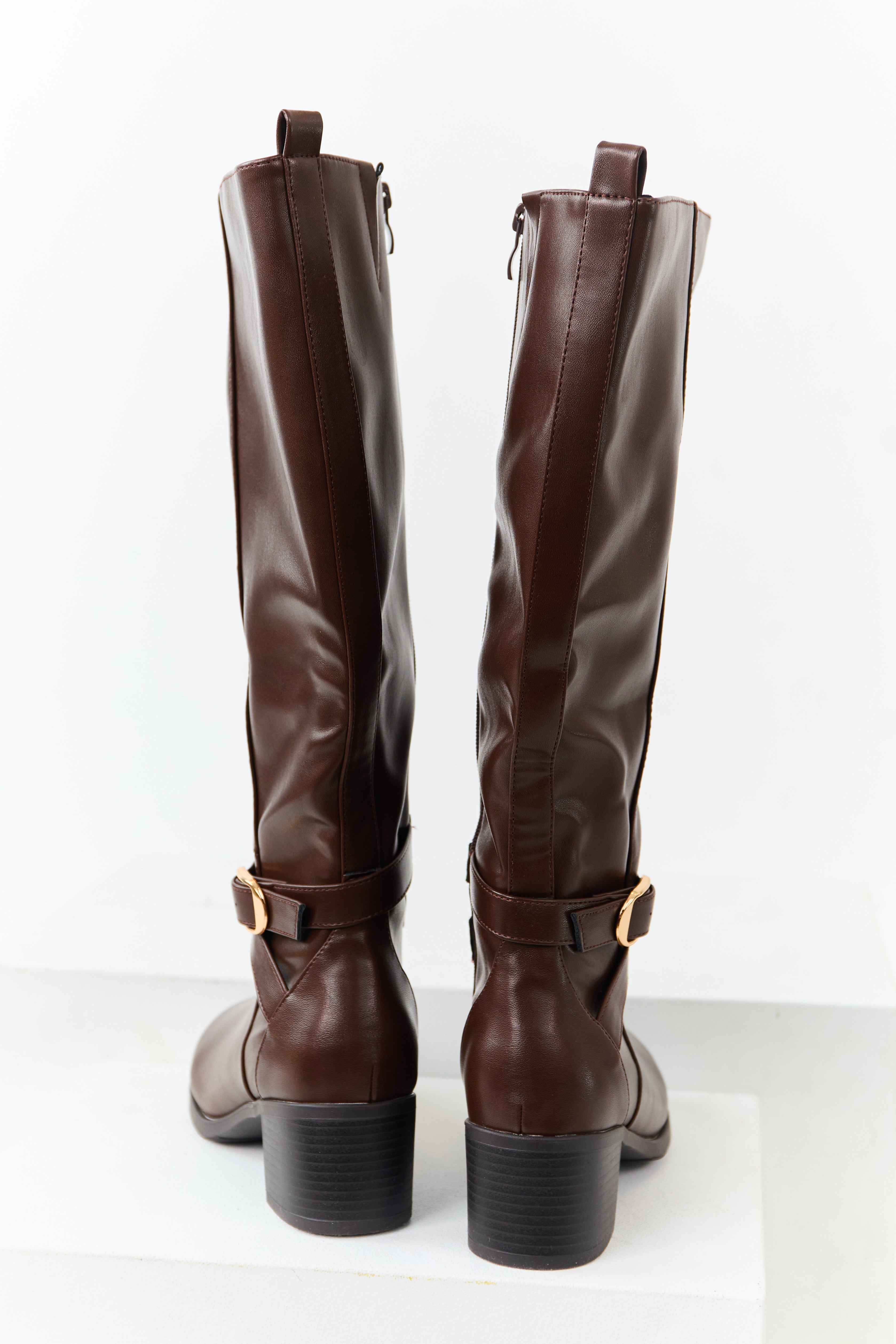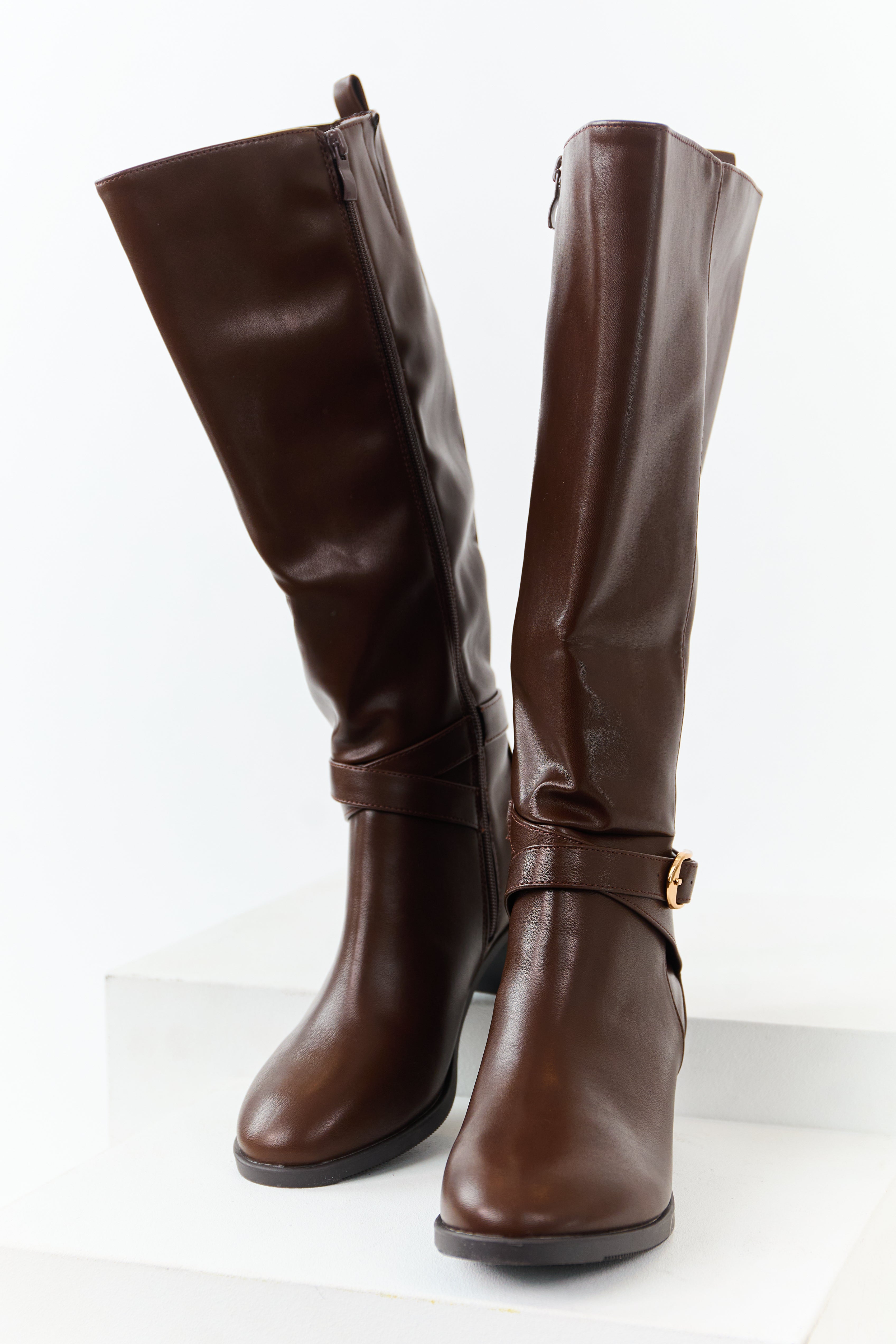 Upgrade your style with these chic knee-high boots in brown faux leather. Featuring buckle strap details, a side zipper, elastic side slit, and a comfortable 2″ block heel. Put them on effortlessly with a pull-on strap, enjoy the slightly cushioned insole, and the rounded toe design. Shaft height: 16.5″; Circumference: 16″. Imported and measured on a size 8 for the perfect fit.