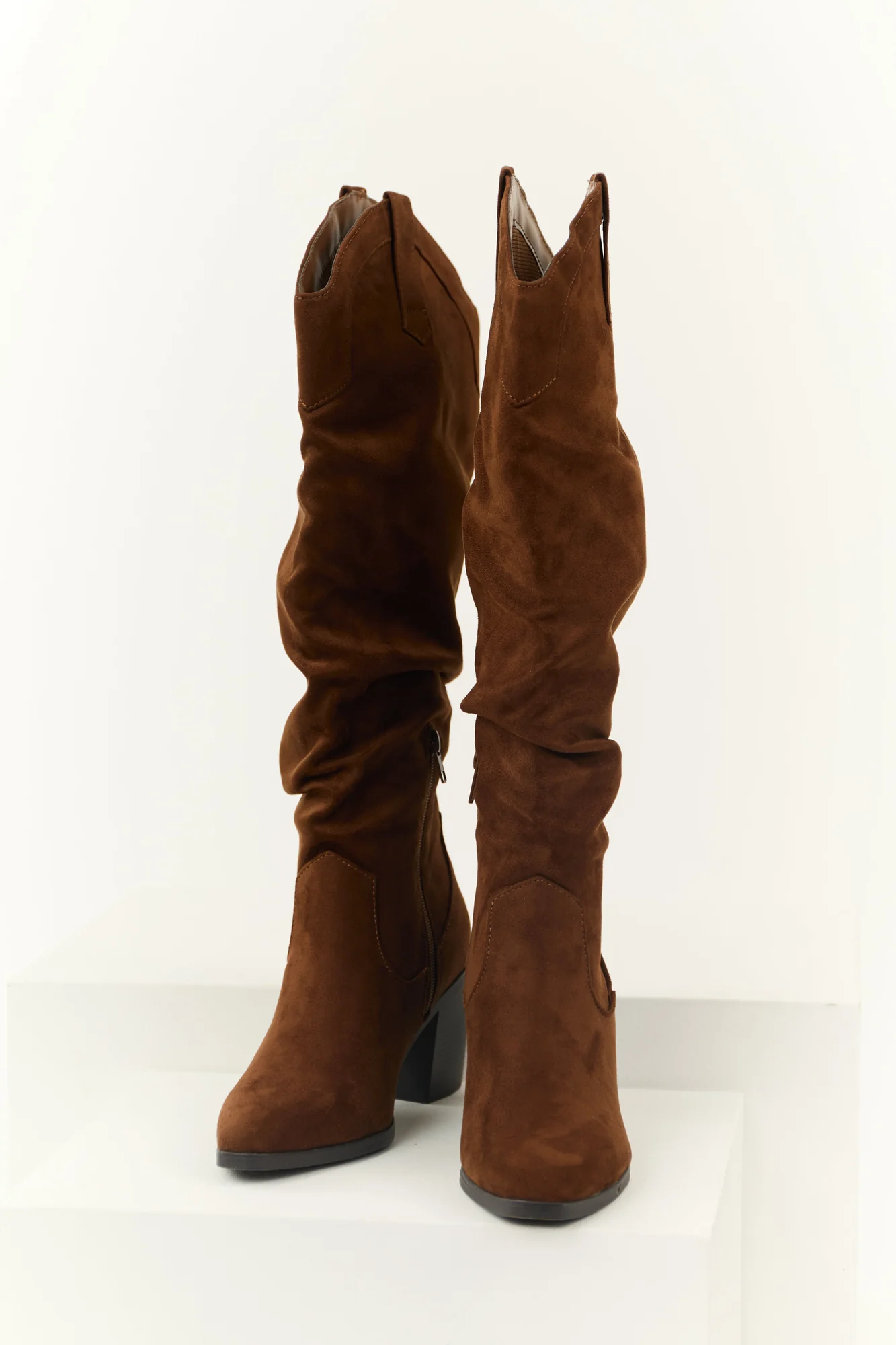 Step out in style with these trendy knee-high heeled boots in a rich sepia hue. Crafted from semi-stretchy faux suede, these boots feature a pointed toe, side zipper, block heel, and pull-on straps for a chic look and comfortable fit. The 18″ shaft and 16″ circumference provide a flattering silhouette, while the 3.25″ heel adds a touch of height. Imported and measured on size 8, these boots are the perfect addition to your fall and winter wardrobe.
