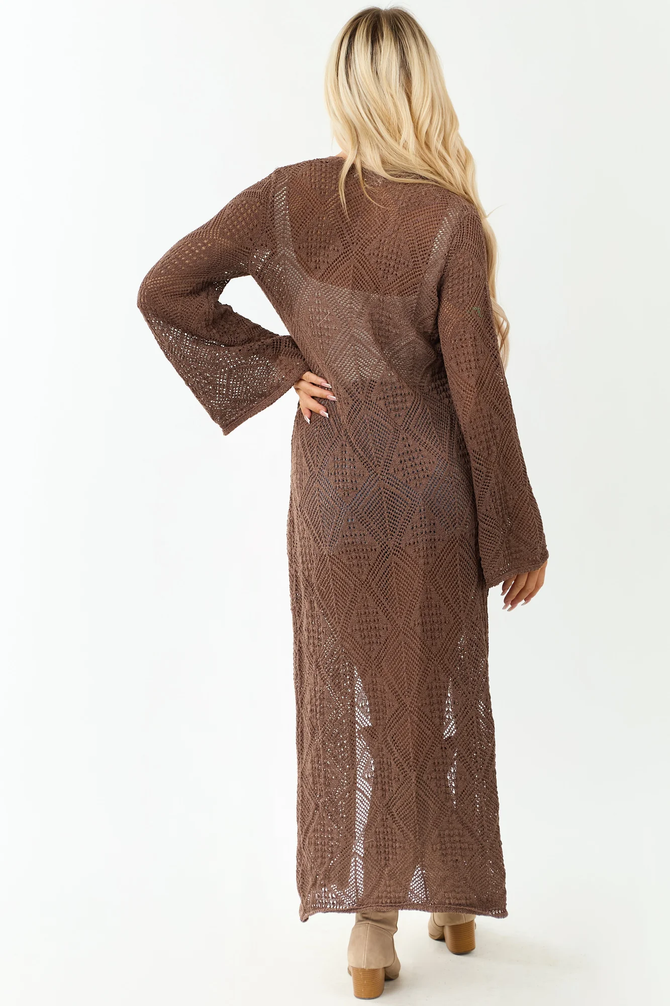 This comfortable boho-chic duster cardigan is perfect for layering, lounging, or everyday wear. Made of stretchy open knit 100% Polyester, it features a tie front and flare sleeves for a stylish twist. Feel cozy and fashionable in this versatile piece. Available in sizes S, M, and L. Model is wearing a size Small. Models Profile: Size 1, Height 57″, Bust 34″, Waist 26″.