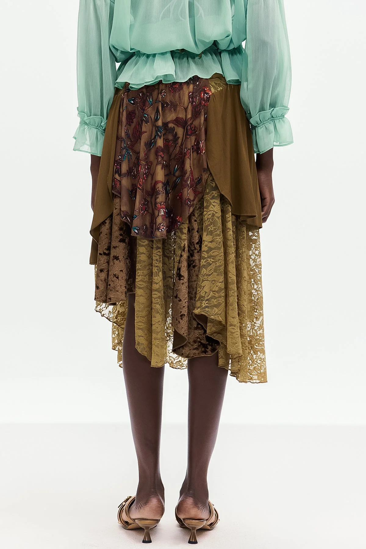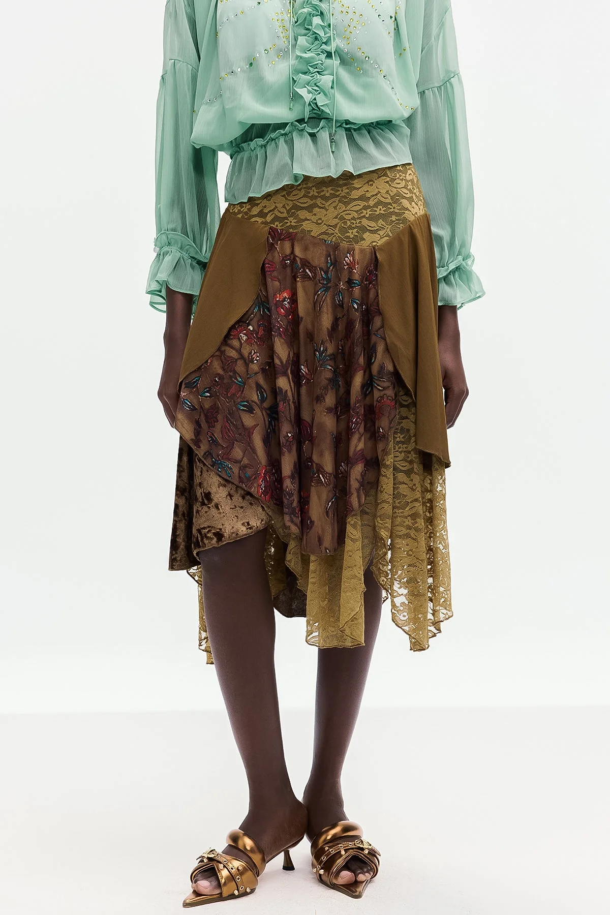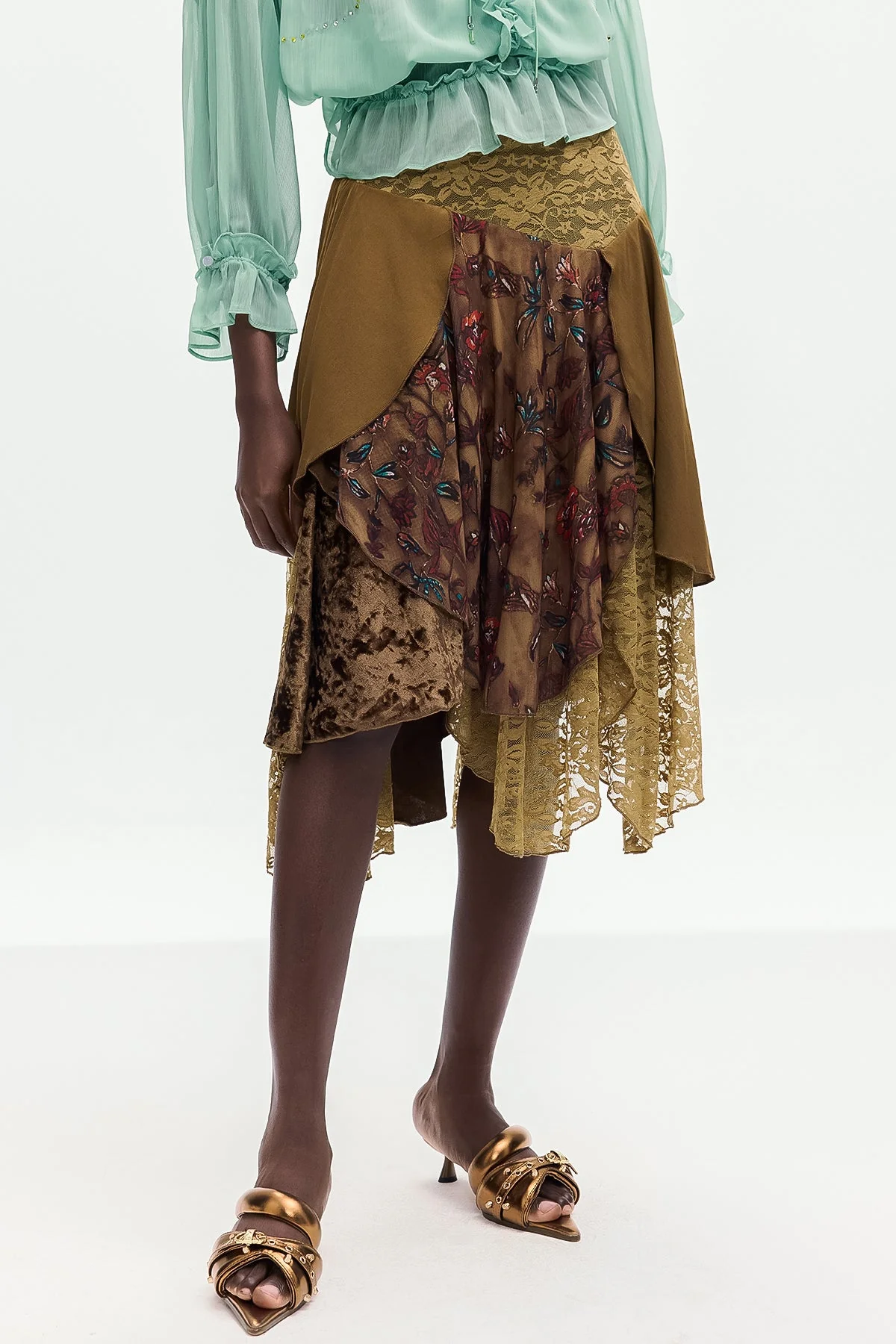 Indulge in the exquisite charm of the Brown Lace Patchwork Midi Skirt . This skirt features intricate lace details and a sophisticated patchwork design, creating a versatile silhouette that complements various body shapes. Ideal for both casual and formal occasions, this skirt adds a touch of elegance and texture to your wardrobe. Designed for lasting comfort, it is durable and lightweight, ensuring a seamless fit all day long. Embrace a hint of boho-chic with this timeless piece. Crafted for the modern woman who values style and sophistication. Stretch Factor: Slight Stretch. Care Instructions: Machine wash in a gentle cycle. Due to lighting, color may vary.