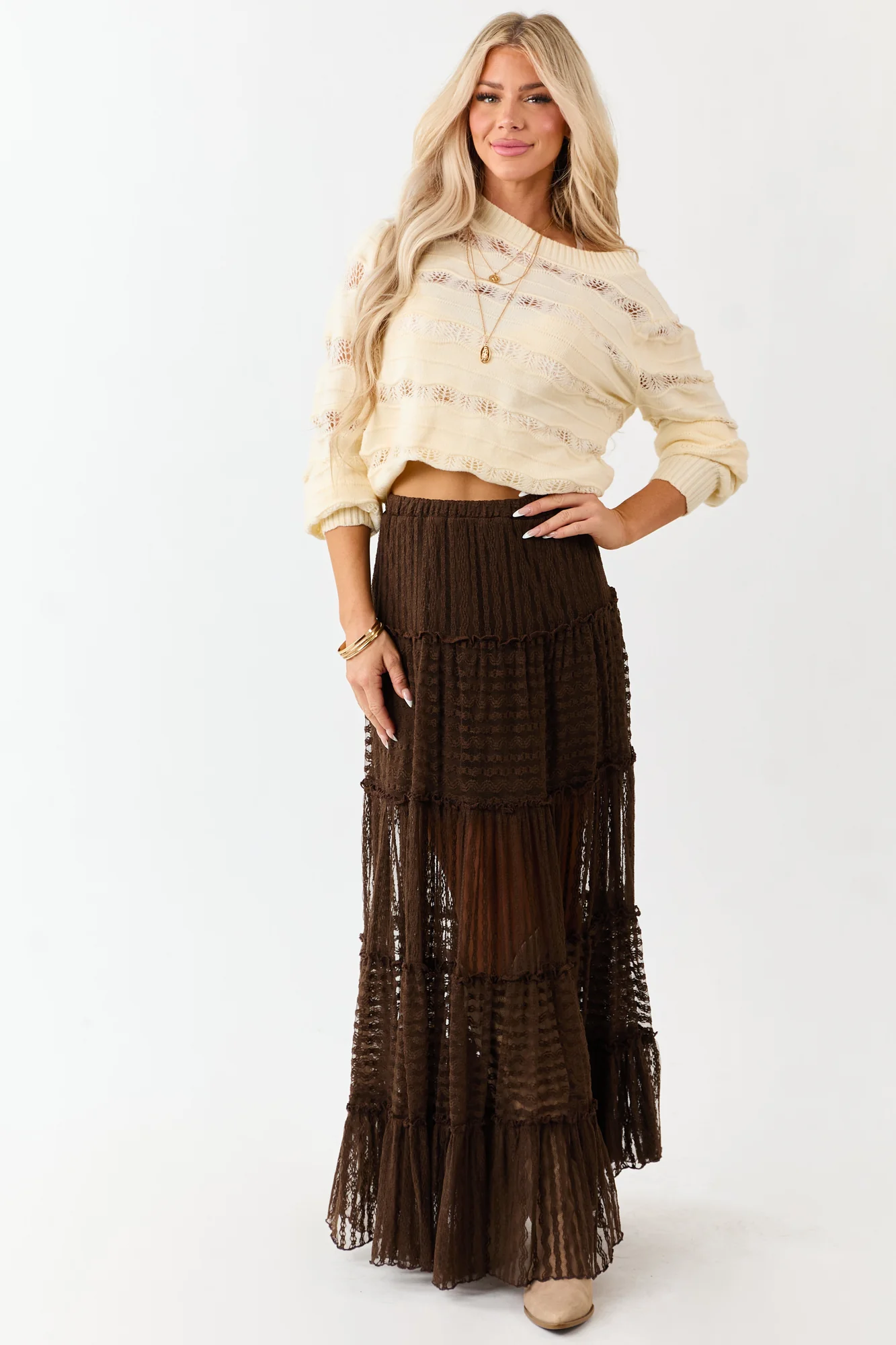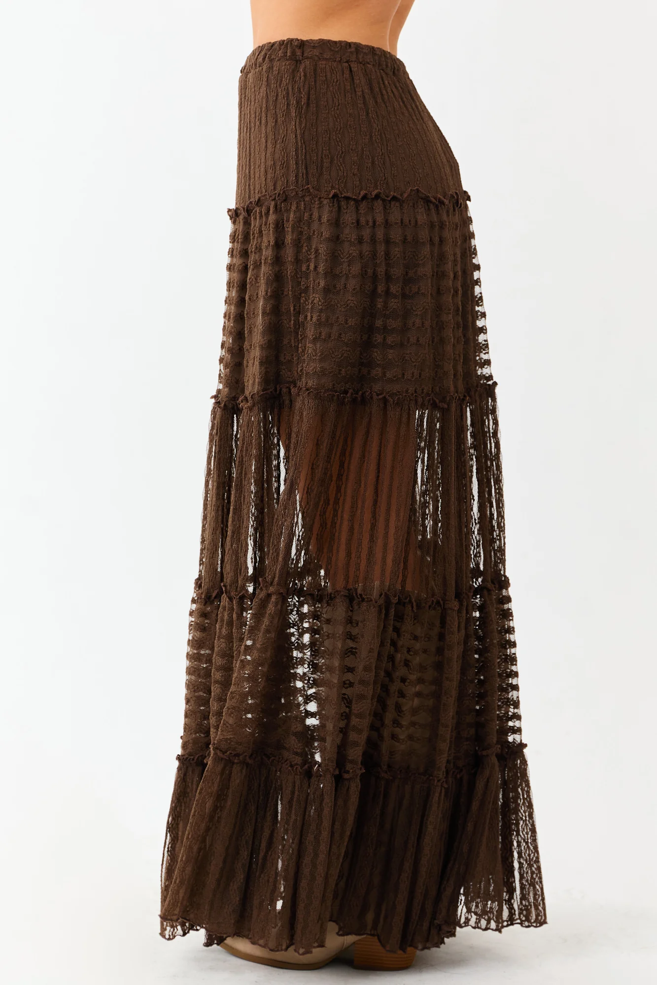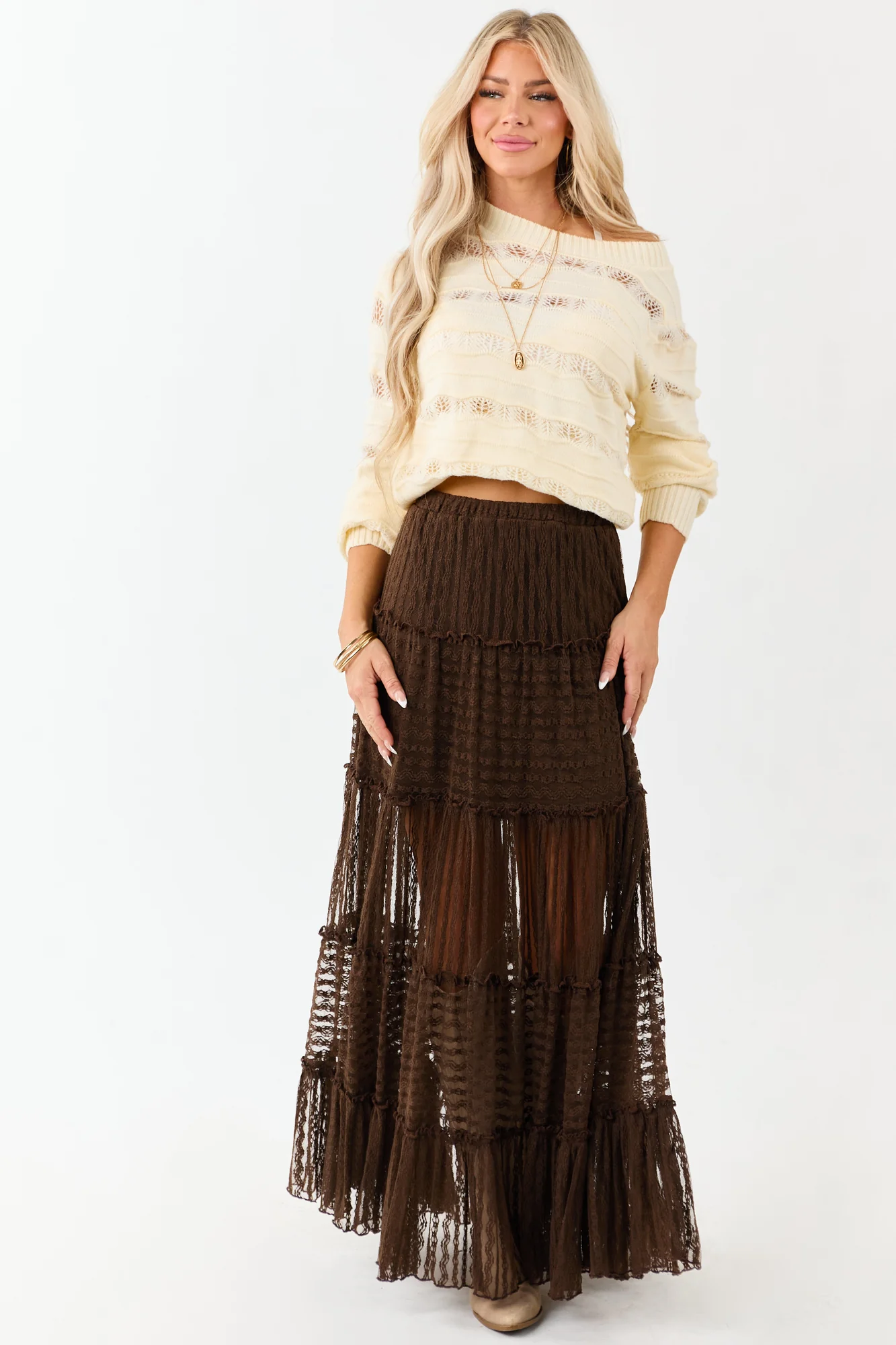 Indulge in the romantic and whimsical charm of this beautiful tiered maxi skirt crafted in sheer lace, ideal for garden parties, beach strolls, or festival days. This flowy skirt features a stretchy mesh lace construction with an elastic waistband for a comfortable fit. Pair it with the Listicle Cream Pointelle Wavy Stripe Knit Sweater for a stunning ensemble. The garment specifications for size small include a waist of 26 inches and a length of 39 inches. Made of 90% Polyester and 10% Spandex with a 100% Polyester lining for added comfort. Imported design. Available in brown.
