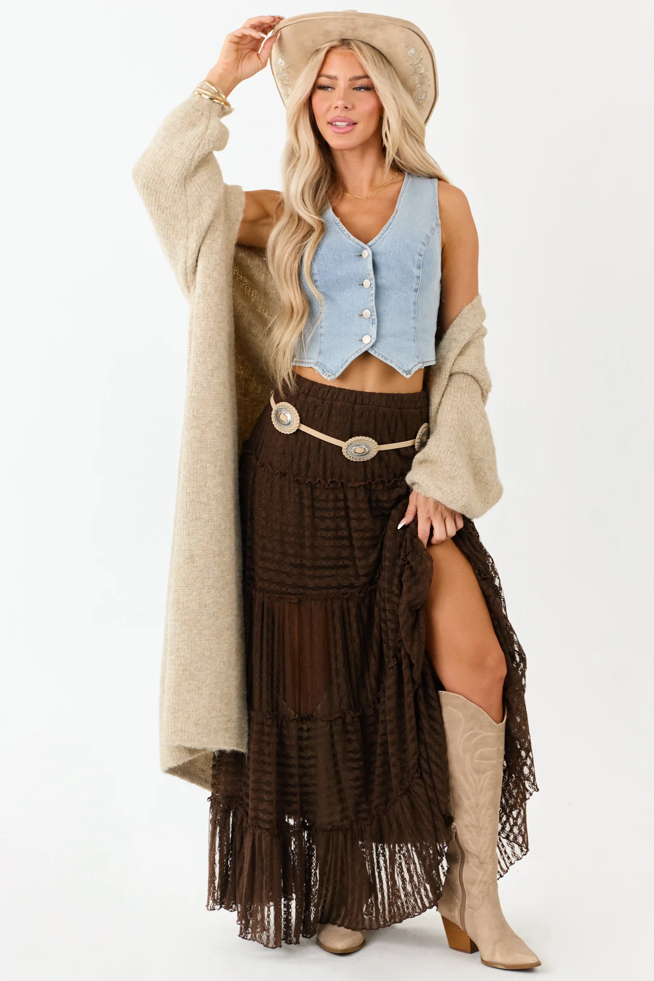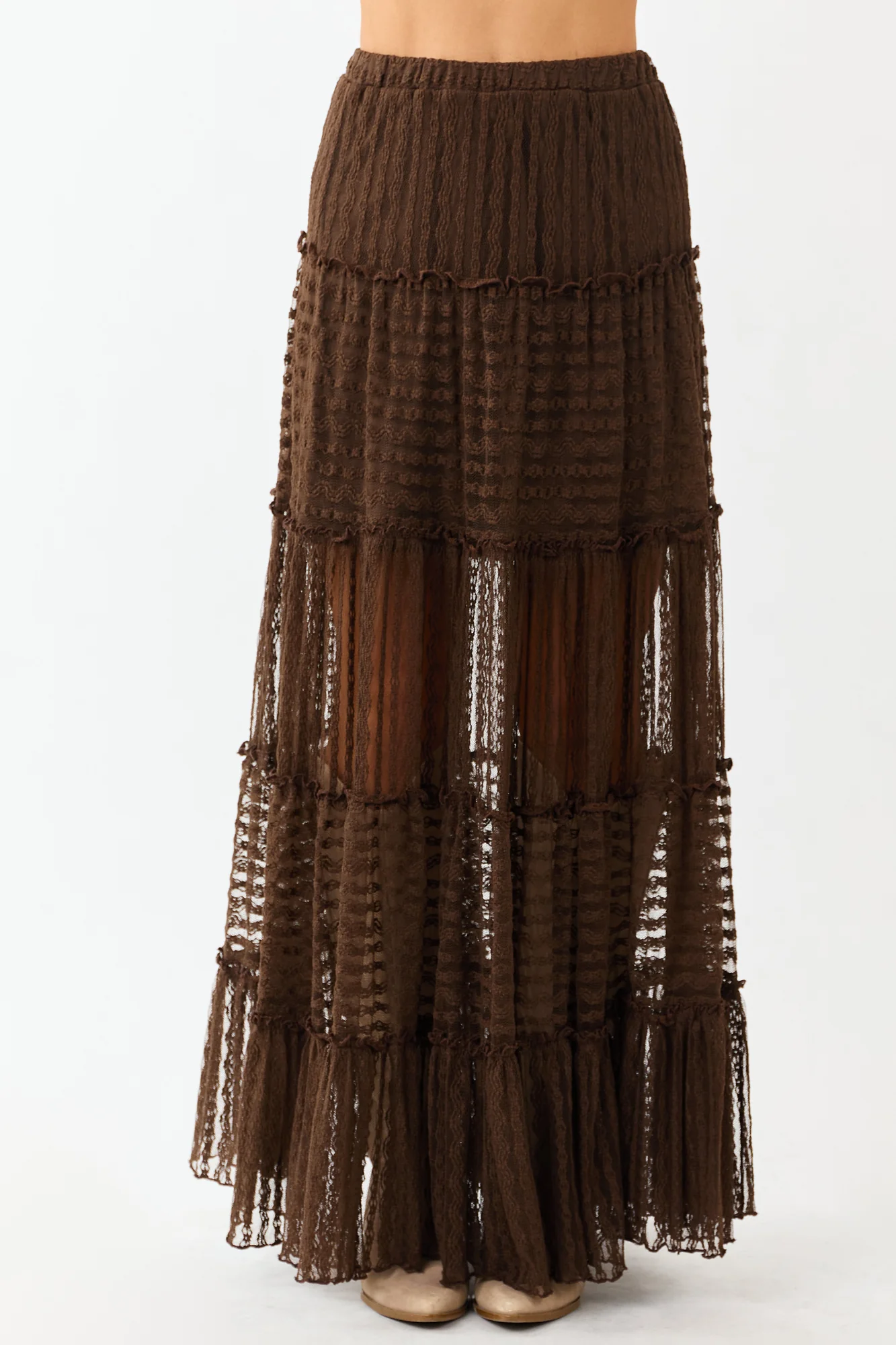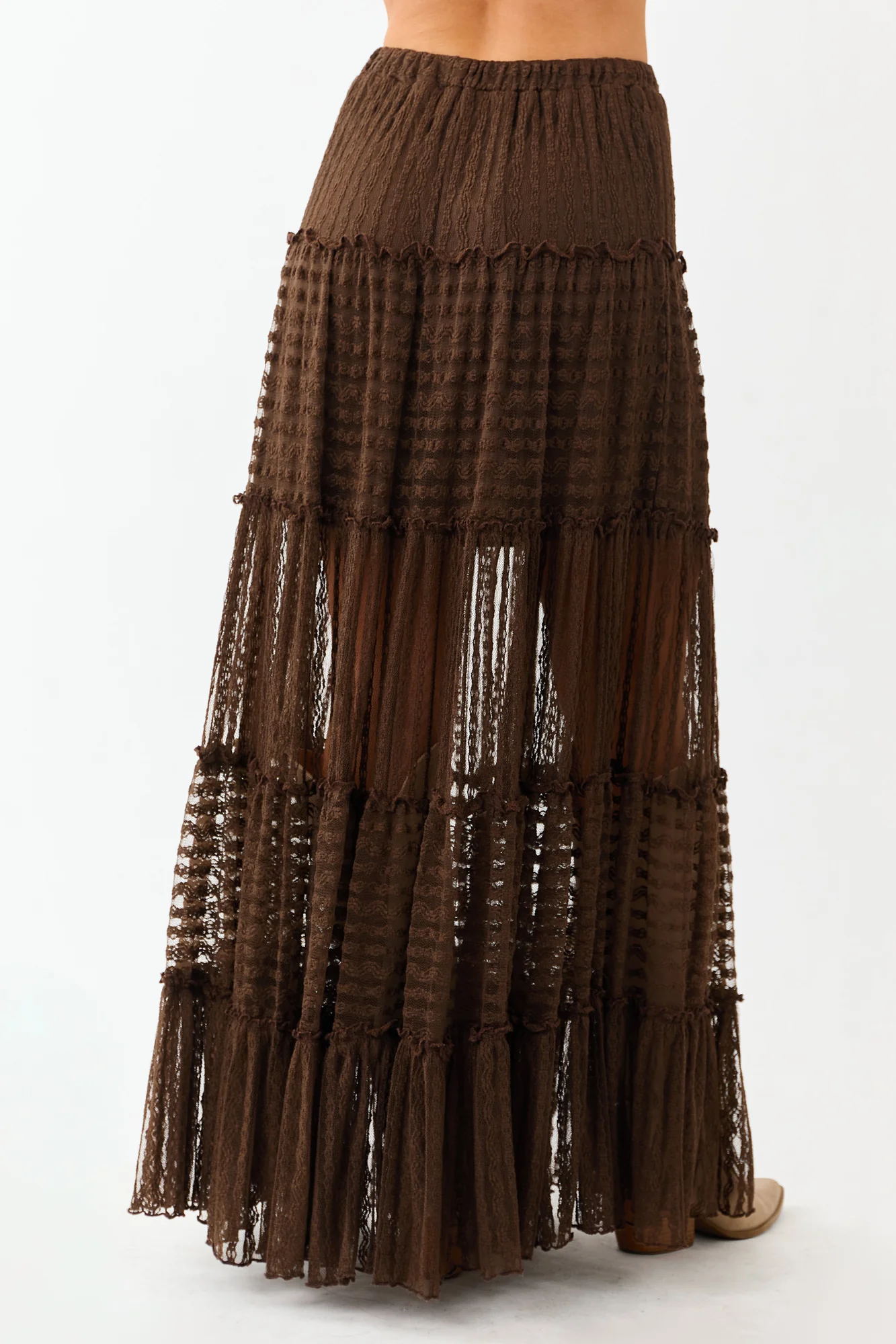 Indulge in the romantic and whimsical charm of this beautiful tiered maxi skirt crafted in sheer lace, ideal for garden parties, beach strolls, or festival days. This flowy skirt features a stretchy mesh lace construction with an elastic waistband for a comfortable fit. Pair it with the Listicle Cream Pointelle Wavy Stripe Knit Sweater for a stunning ensemble. The garment specifications for size small include a waist of 26 inches and a length of 39 inches. Made of 90% Polyester and 10% Spandex with a 100% Polyester lining for added comfort. Imported design. Available in brown.