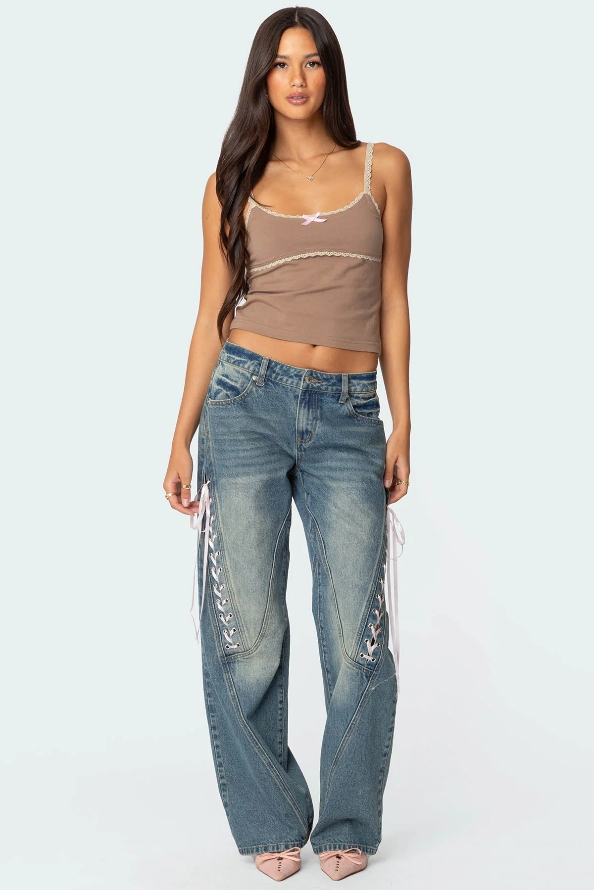 Stay stylish and comfortable in this brown lace trim sleeveless top. Featuring adjustable straps, contrast lace detailing, and a charming center bow. Crafted from a blend of cotton and spandex for a perfect fit. Ideal for everyday wear, pair it with your favorite bottoms for a chic look that will turn heads. This top is machine washable for easy care. Available in sizes XS to XL.