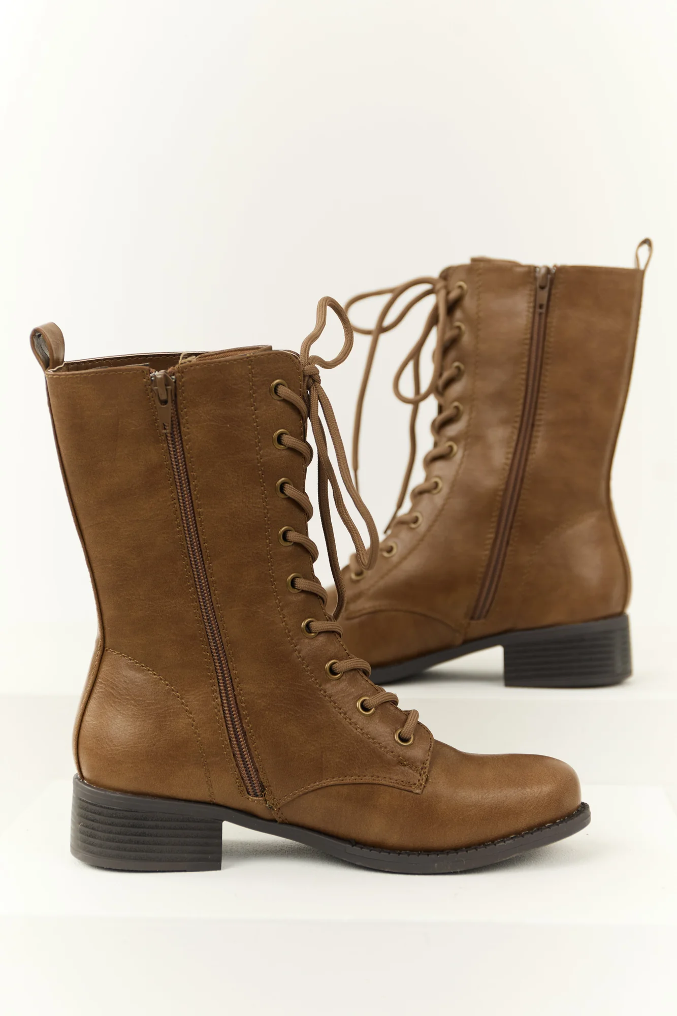 Step out in style with these trendy brown lace-up winter boots made of faux leather. Featuring a side zipper, rounded toe, and pull-on strap, these boots have a shaft height of 9.5 inches and a 1.5-inch heel for added elegance and comfort. Perfect for daytime wear, these imported boots are a must-have addition to your winter wardrobe. Enjoy the perfect blend of fashion and functionality with these chic lace-up boots.